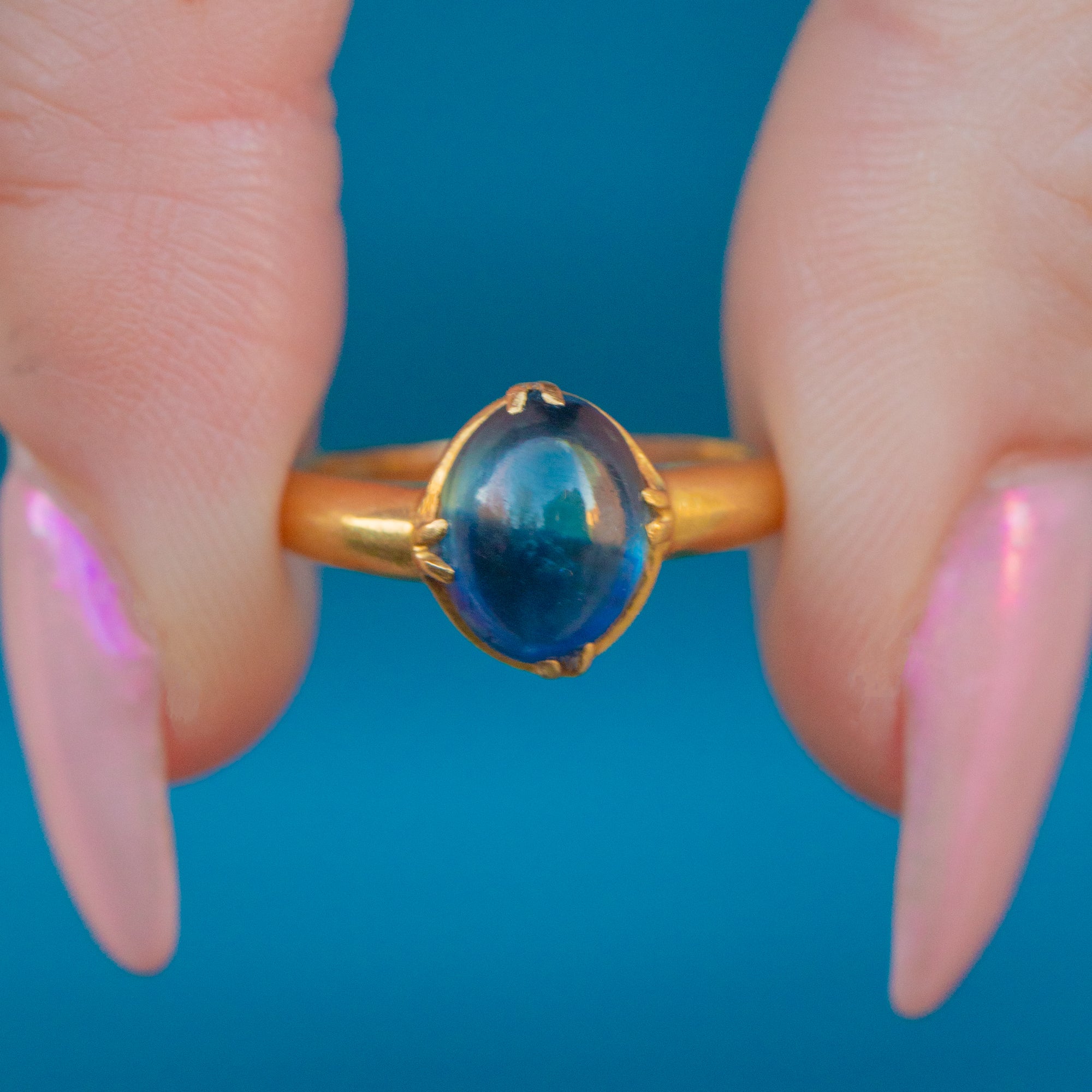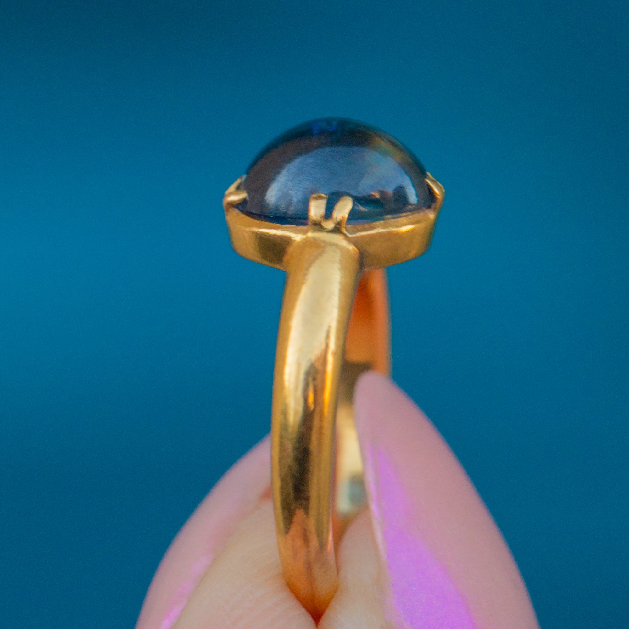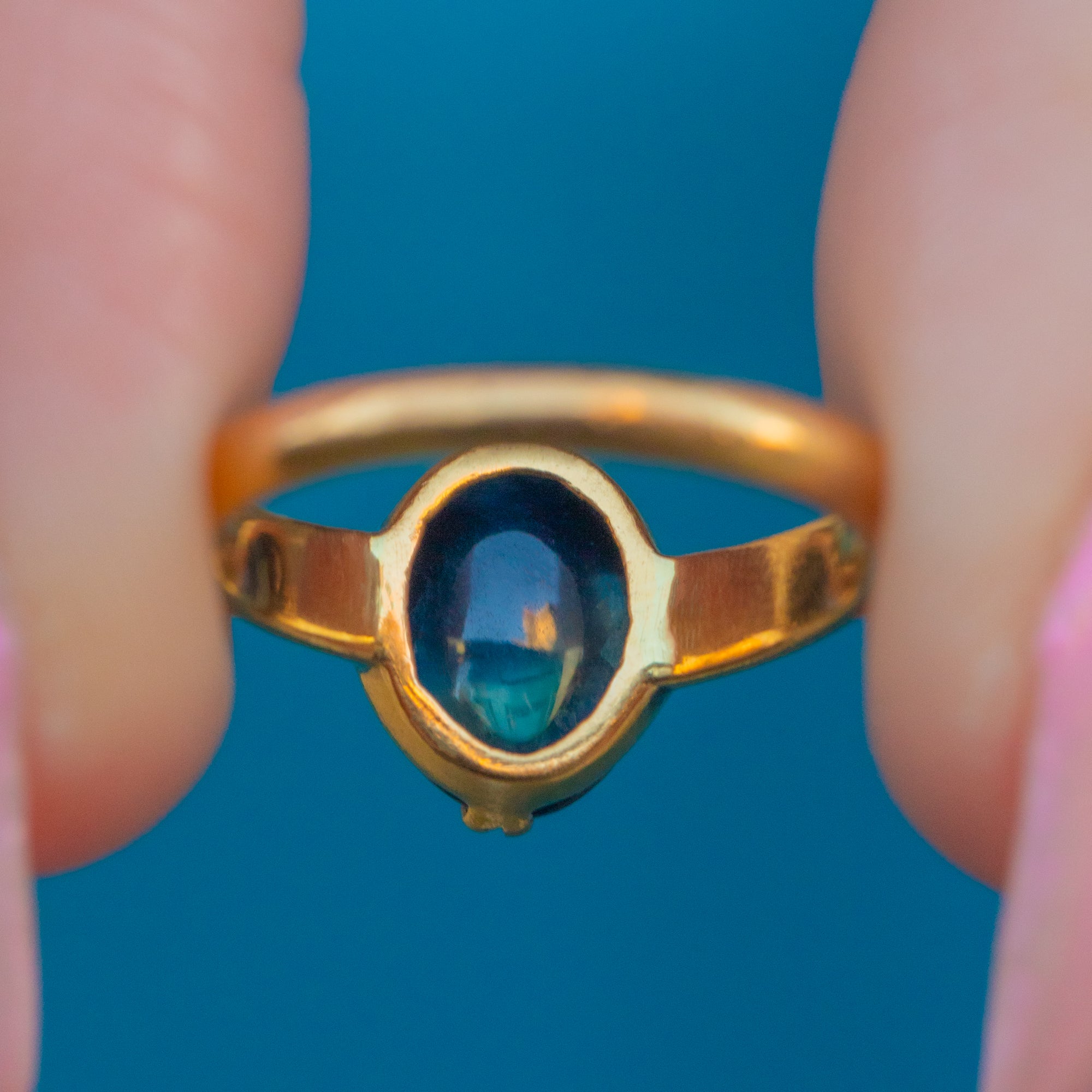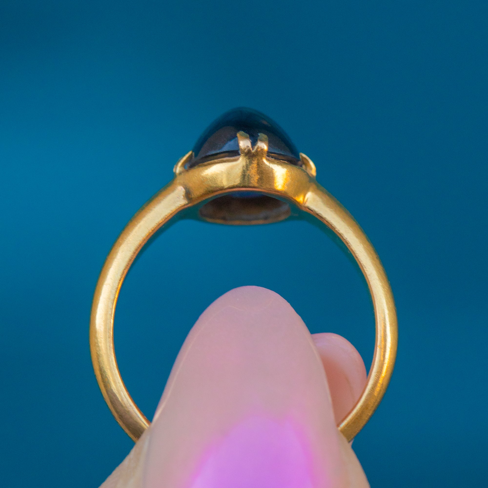 The cabochon's smooth, rounded surface enhances its natural beauty, creating a mesmerising play of light and shadow. Whether worn as a standalone piece or stacked amongst your other favourite jewels, this vintage Sapphire ring will enchant with its rich hues of royal blue and gleaming Gold!