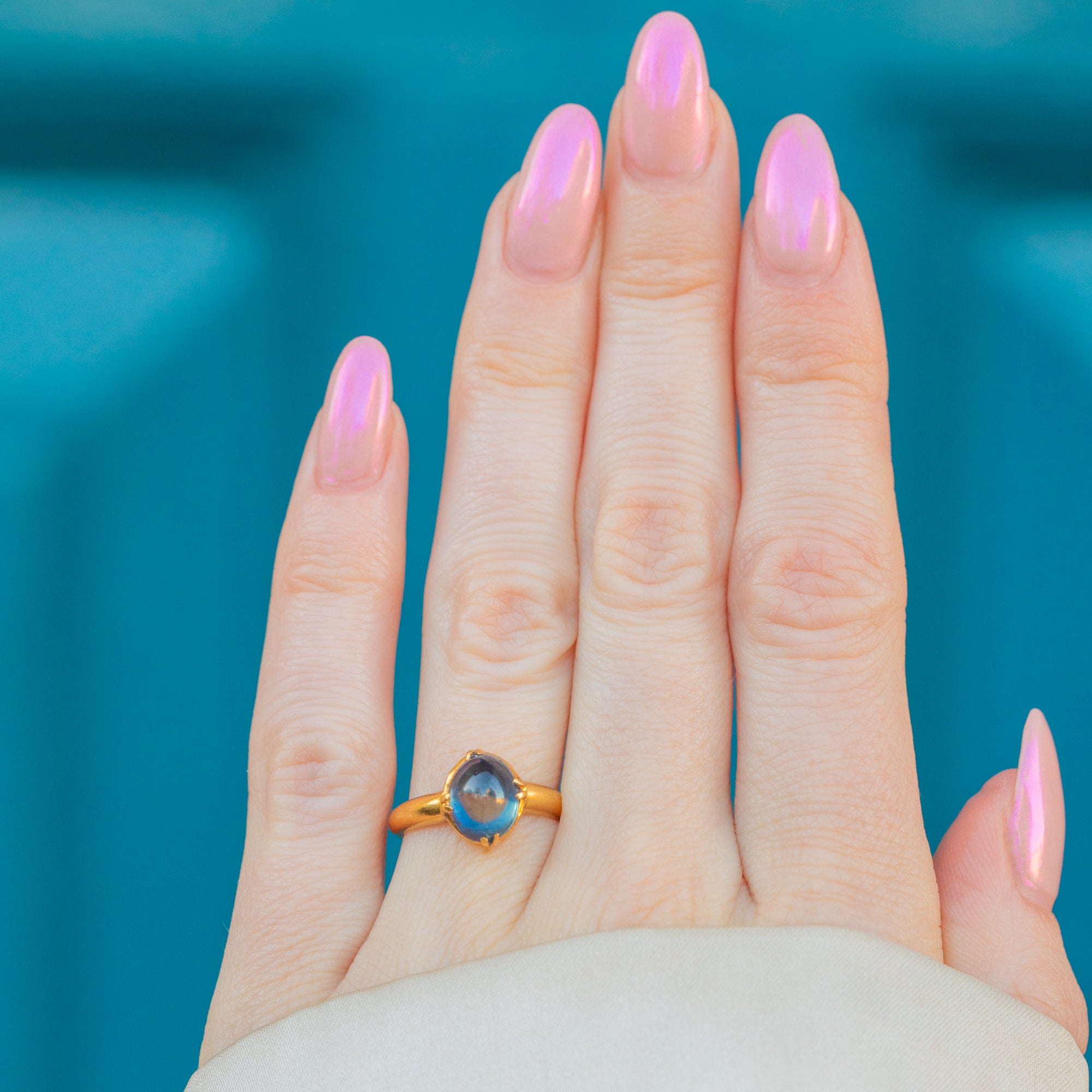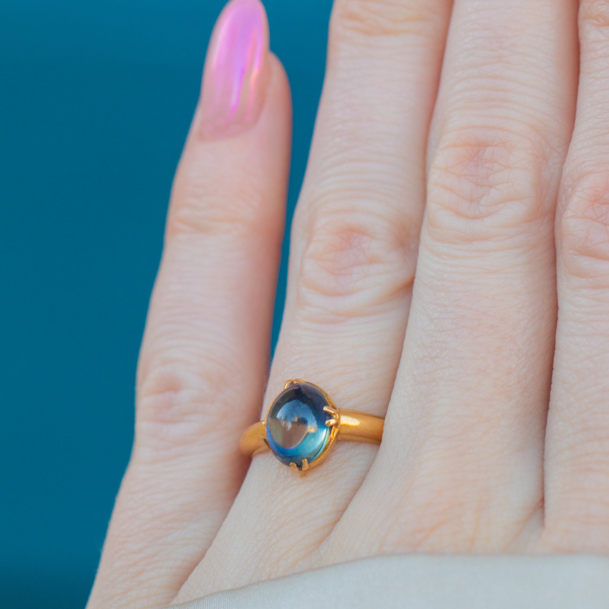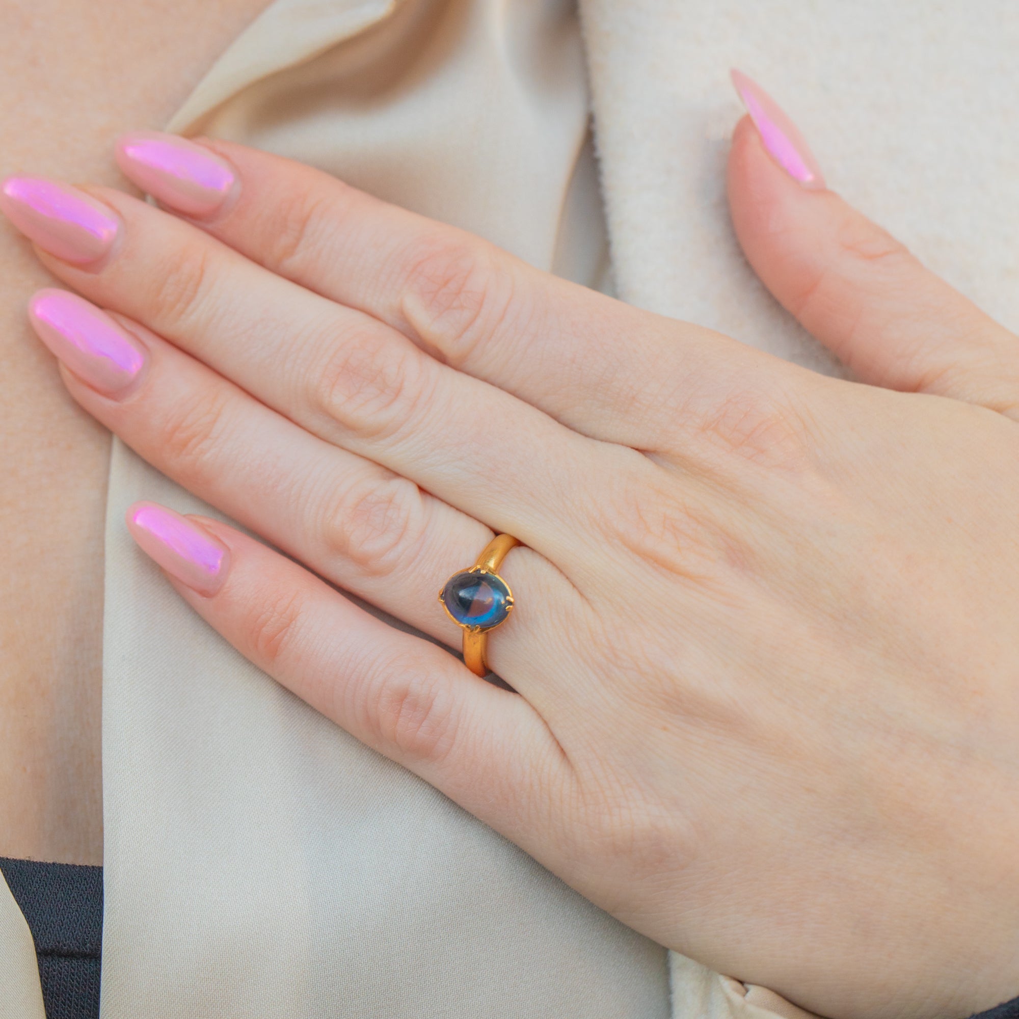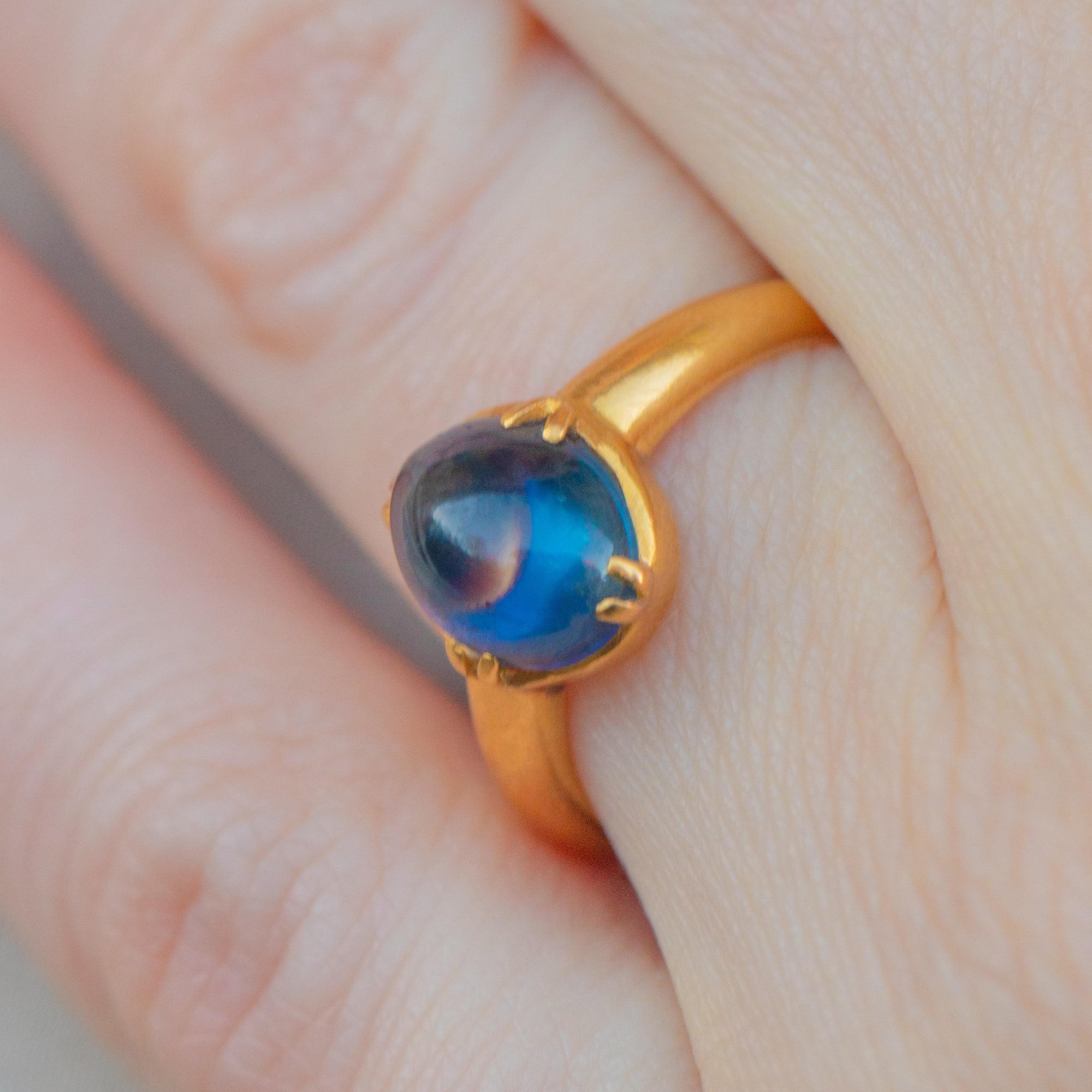 The cabochon's smooth, rounded surface enhances its natural beauty, creating a mesmerising play of light and shadow. Whether worn as a standalone piece or stacked amongst your other favourite jewels, this vintage Sapphire ring will enchant with its rich hues of royal blue and gleaming Gold!