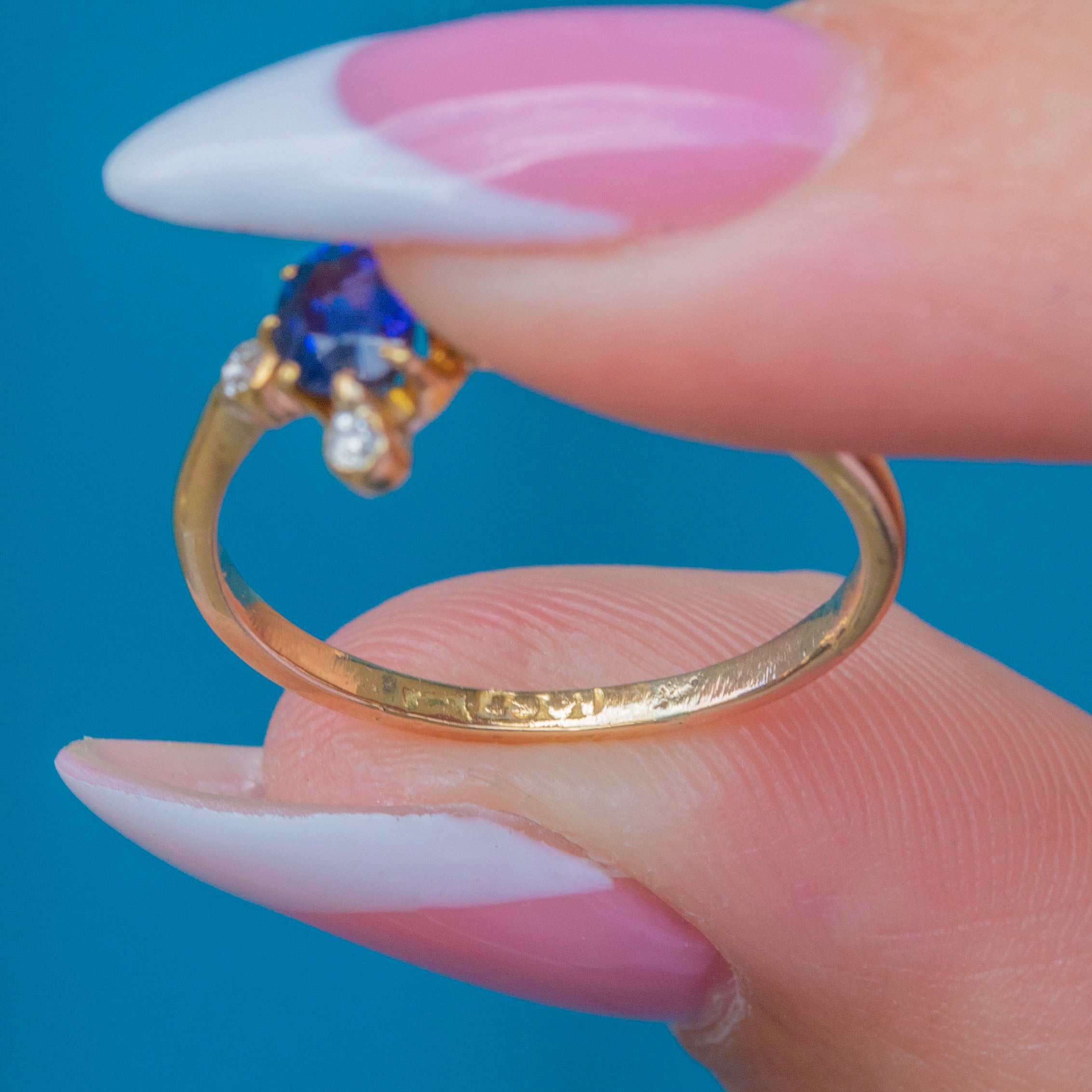 MATERIALS: Tests as 18ct Gold, Natural Sapphire, Diamond.