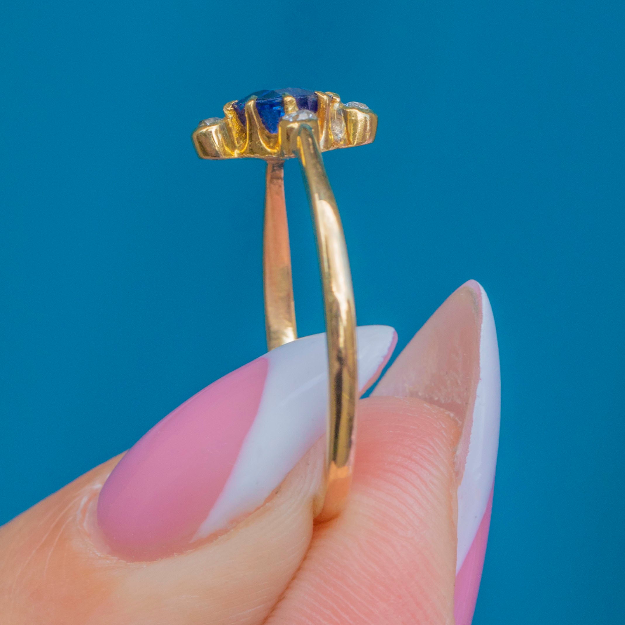 VERY GOOD-EXCELLENT: The Sapphire and Diamonds are set securely, and her radiant 18ct Gold ring band has little signs of wear aside from a small resize mark. She would make a divine addition to anyone's jewellery collection!