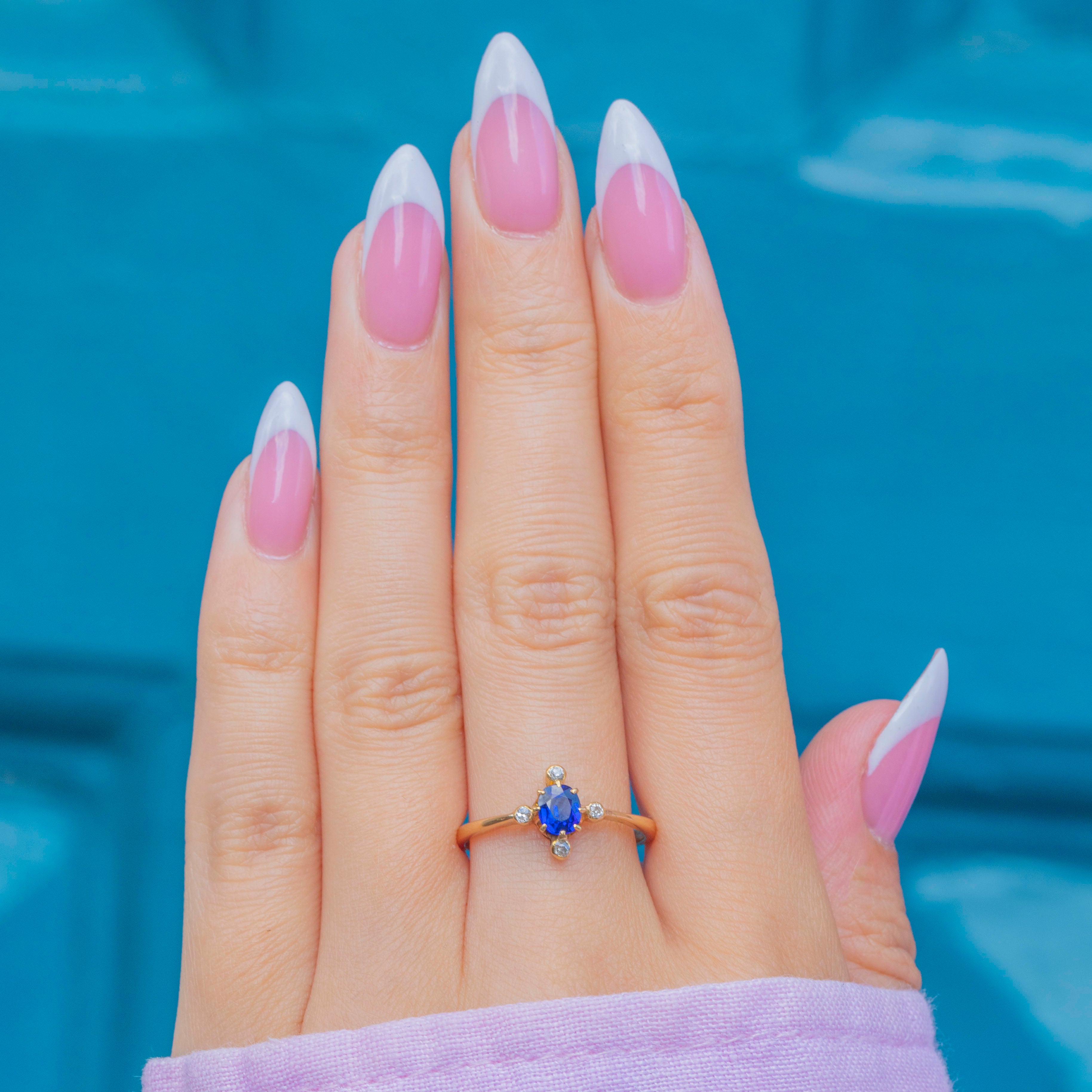 This dainty 18ct Gold Natural Sapphire & Diamond ring is so exquisite! She boasts a dark, saturated oval Sapphire, which is hugged by four twinkling Diamonds. Poised upon a slender 18ct Gold band, she sits so gracefully on the hand.