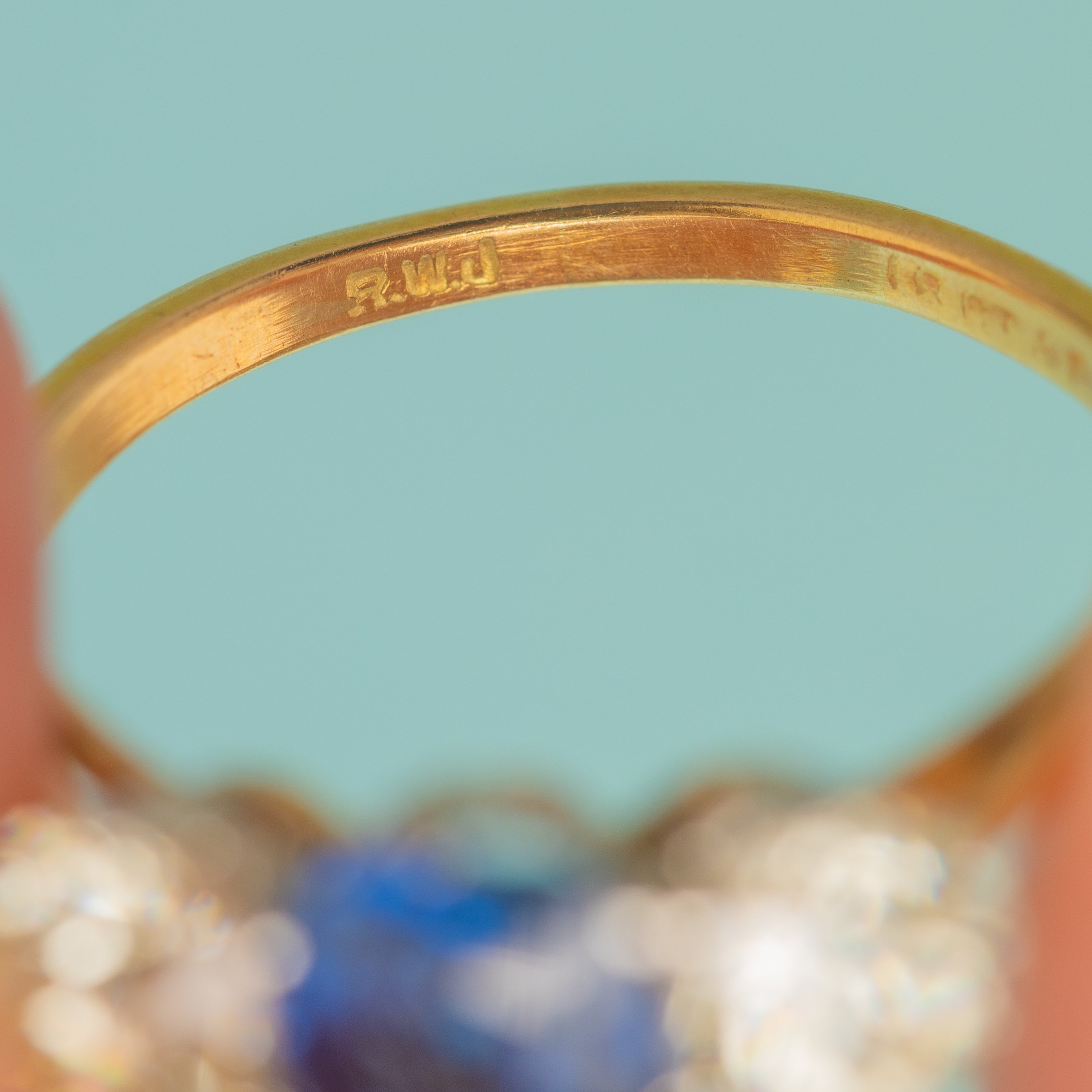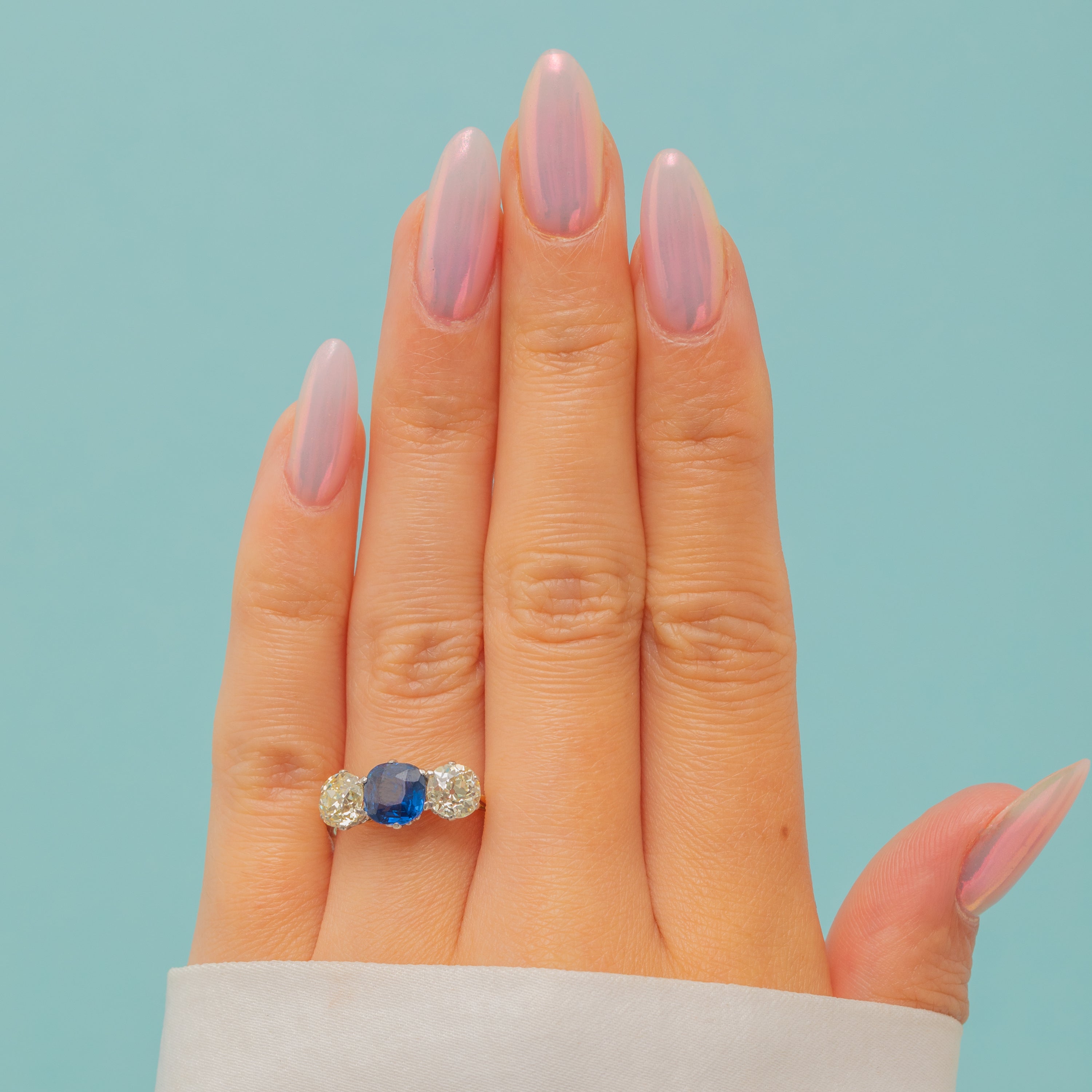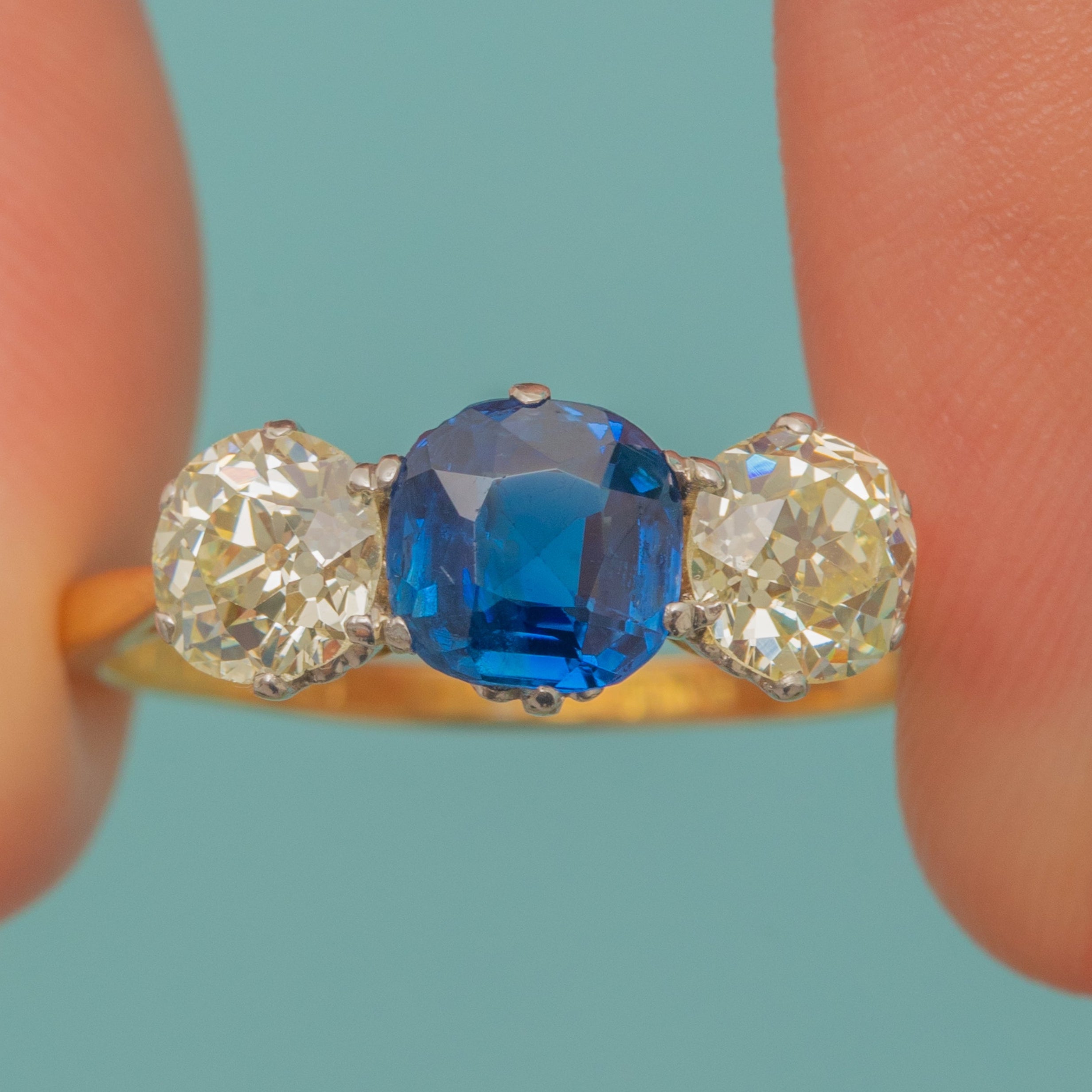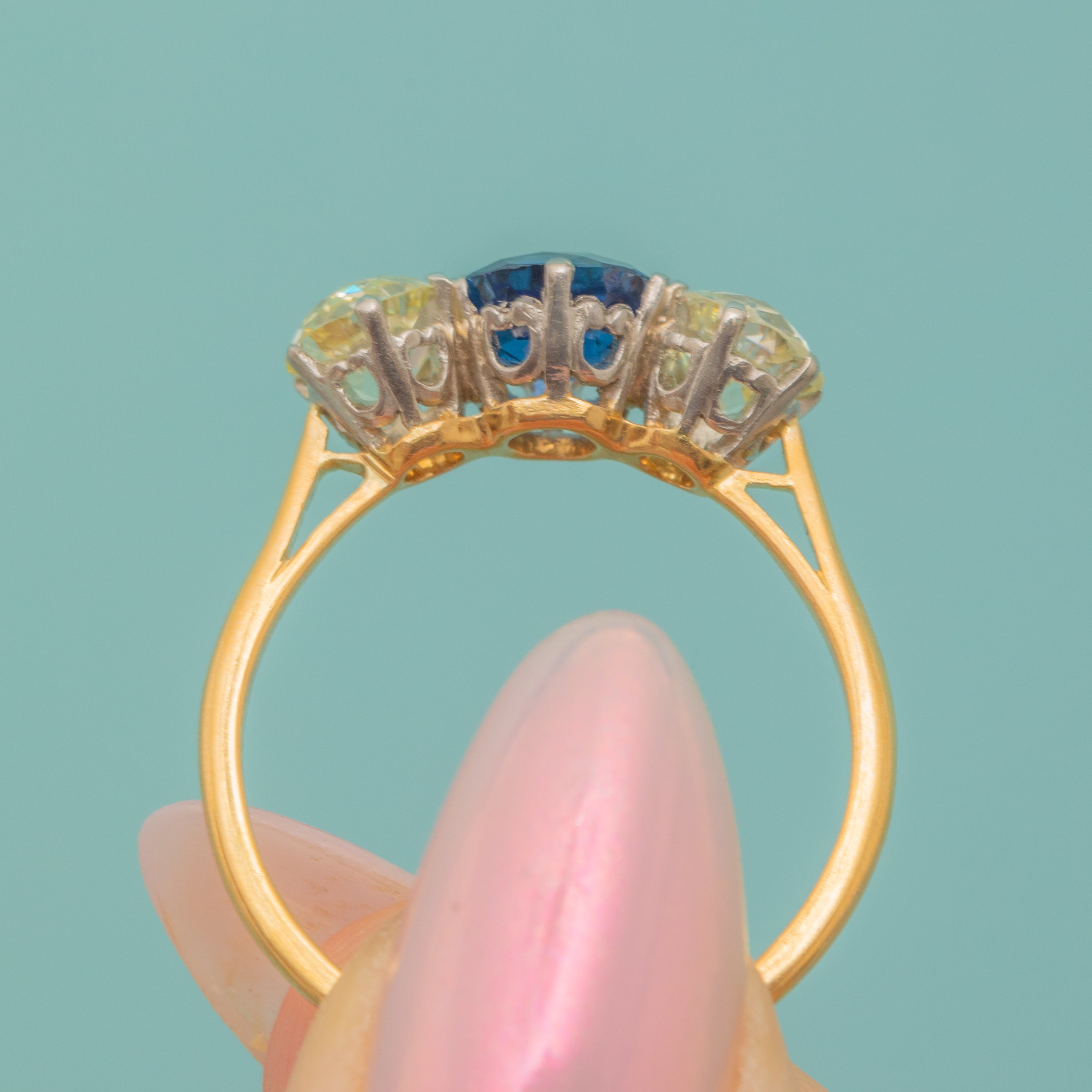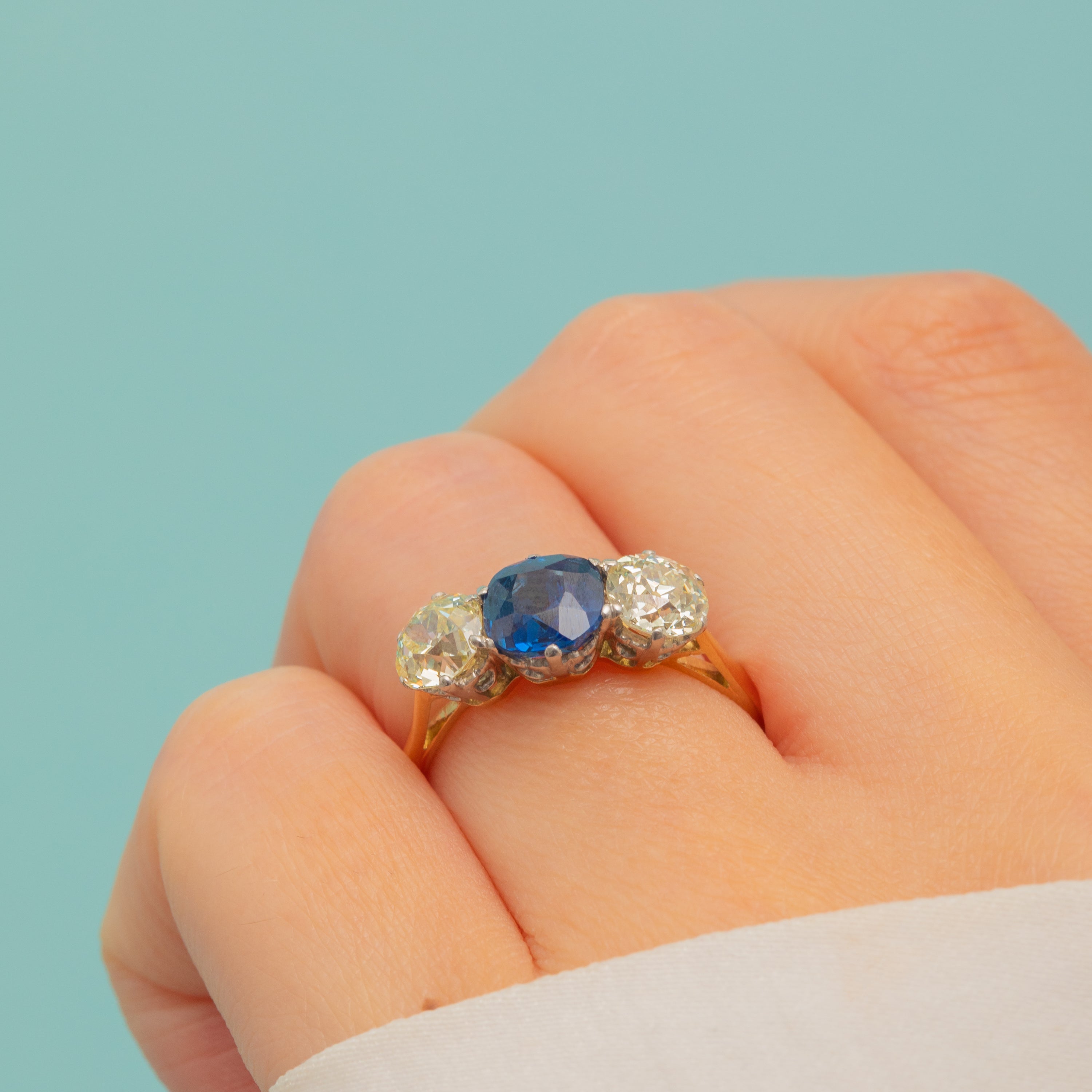 VERY GOOD: The Natural Sapphire and old European-cut Diamonds have been wonderfully maintained, and are secure in their settings. The right Diamond (hallmark facing) has a very small nibble at the five o'clock position. The 18ct Gold and Platinum are in excellent condition, the smooth Gold band allowing for comfortable wear. With little else to note, this brilliant trilogy ring is a superb piece to add to your collection and will continue to delight for years to come!