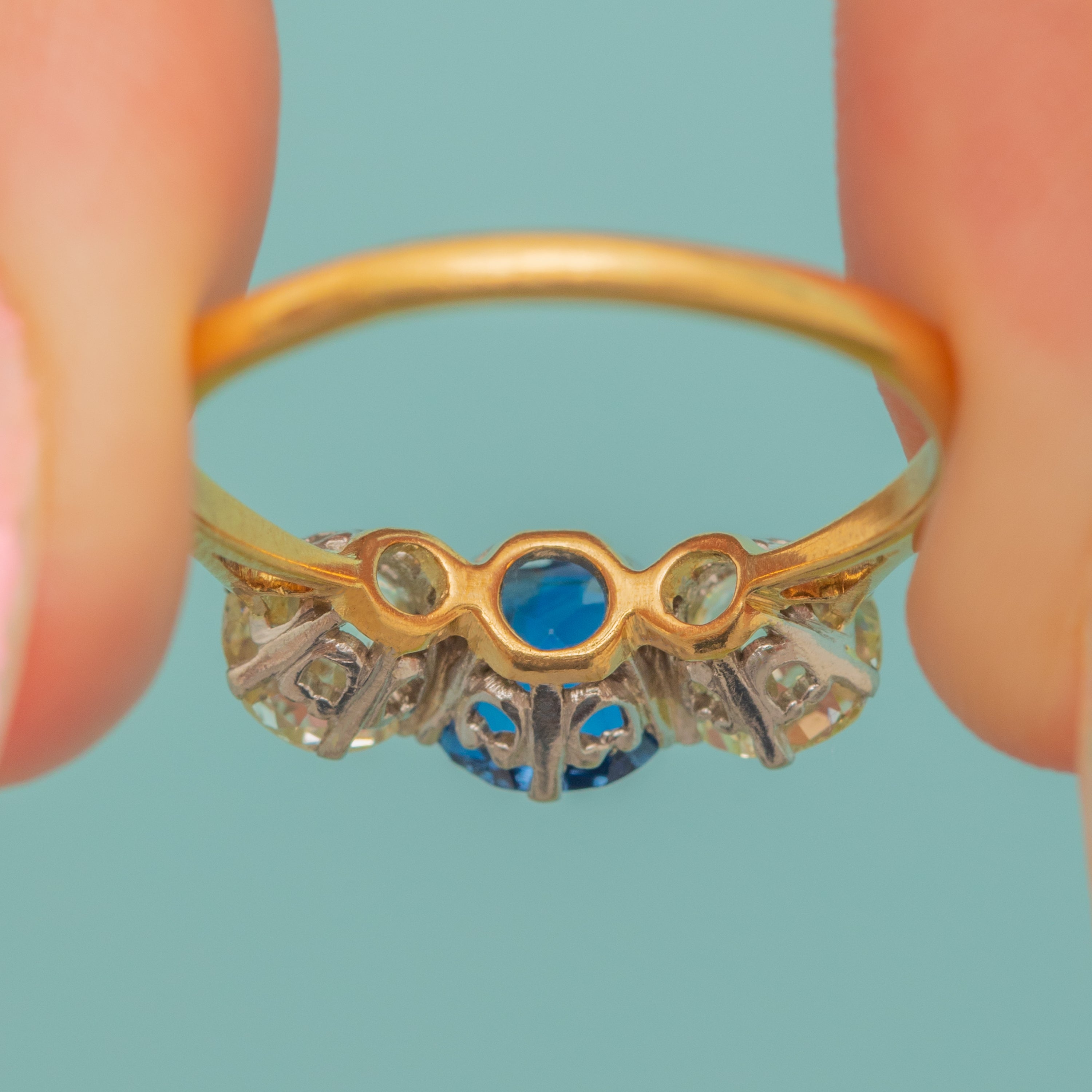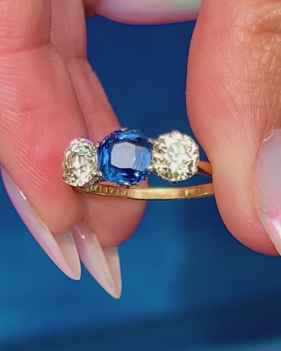 Antique 18ct Gold Natural Sapphire Diamond Trilogy Ring, 1.12ct Old European Diamonds
