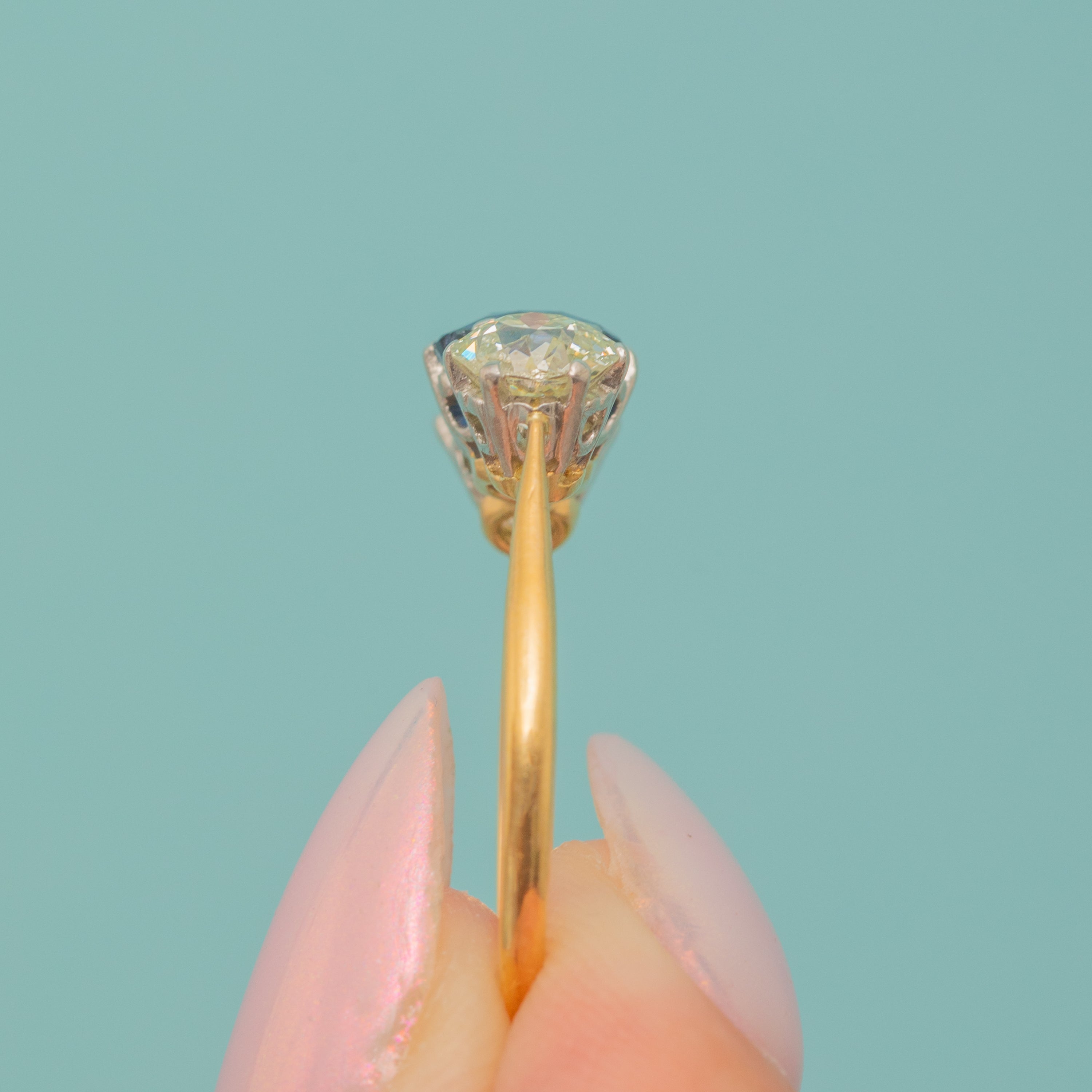 Centred by a 0.70ct Natural Sapphire, radiating a saturated deep cerulean hue, this antique ring is truly decadent. Her Sapphire is elegantly flanked by large old European-cut Diamonds, with a combined 1.12cts. Both Diamonds exhibit a unique brilliance and clarity (VS graded) that beautifully contrasts with the Sapphire’s royal blue hue.