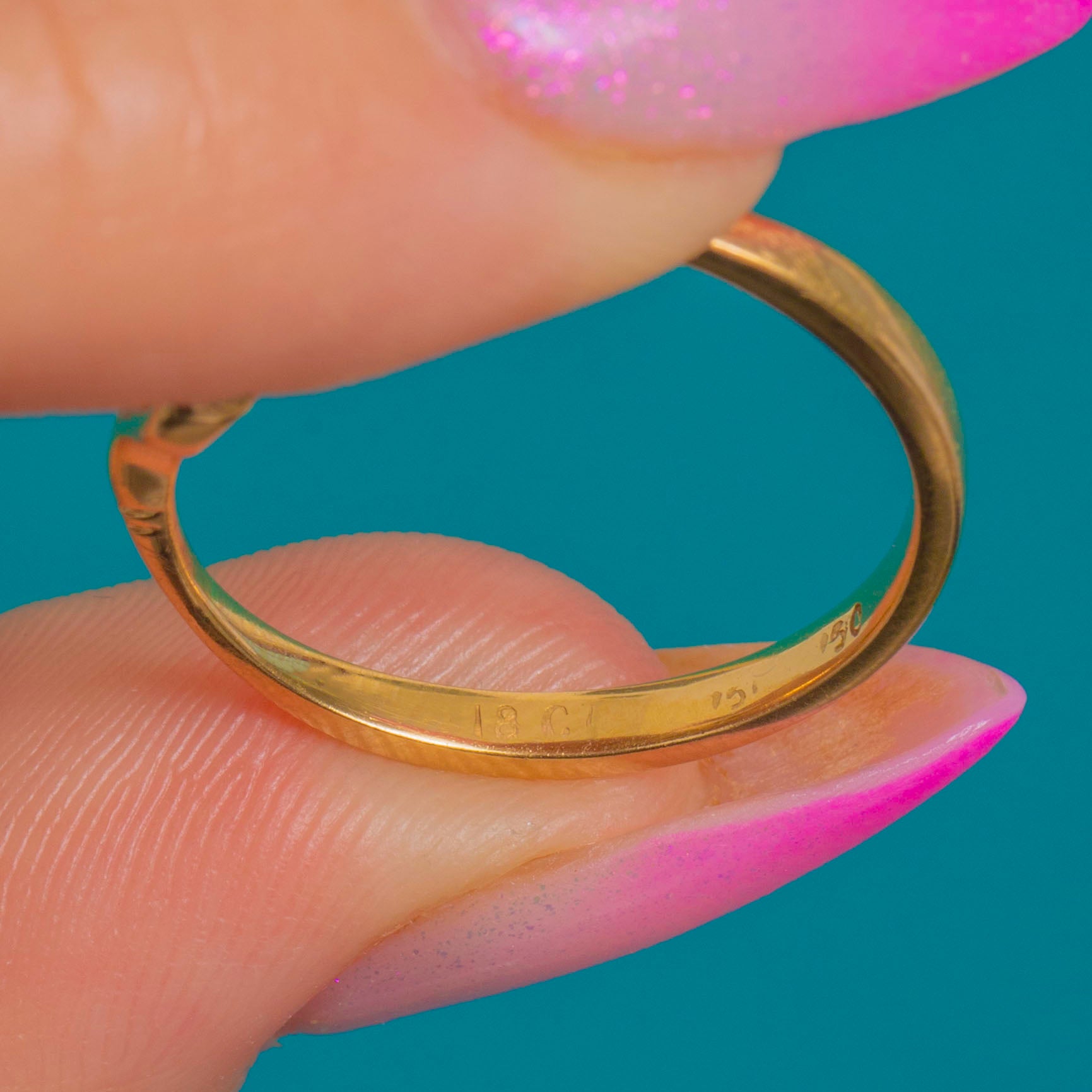 A refined Edwardian three-stone ring set with charming Old Mine Cut Diamonds in smooth rub-over bezel settings. The central Diamond sits slightly prouder between two petite companions, creating a graceful trilogy across a slender 18ct Gold band with subtly undulating shoulders.