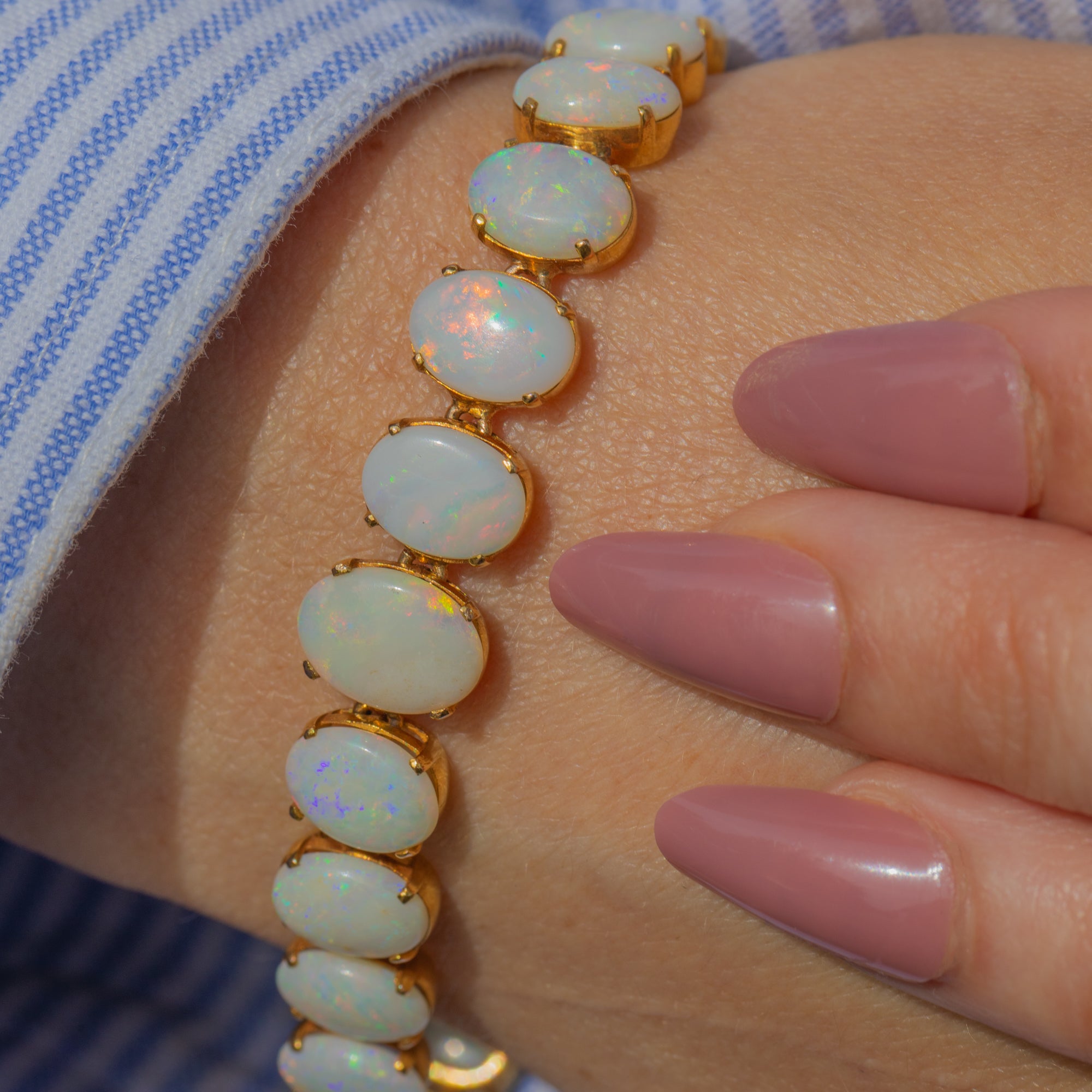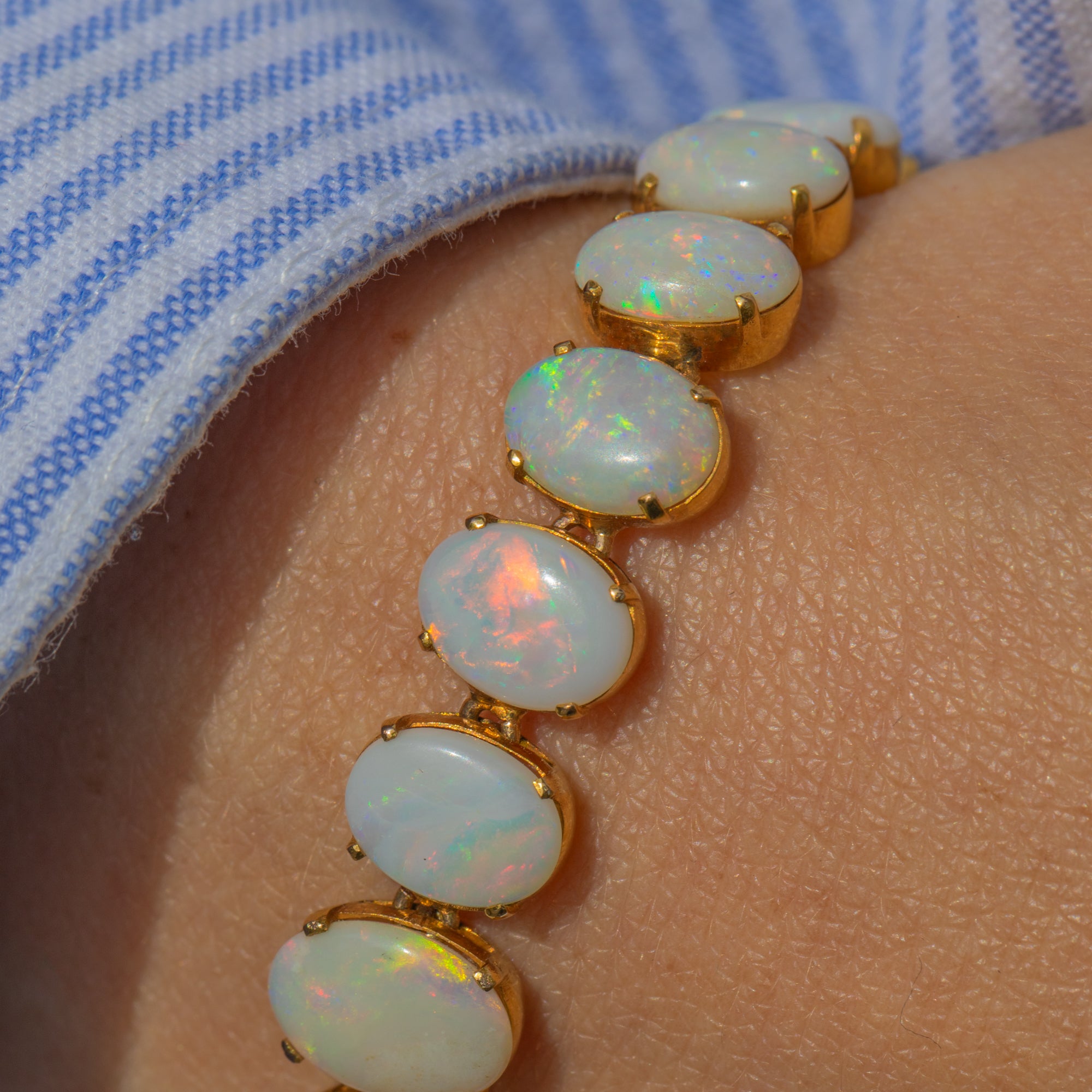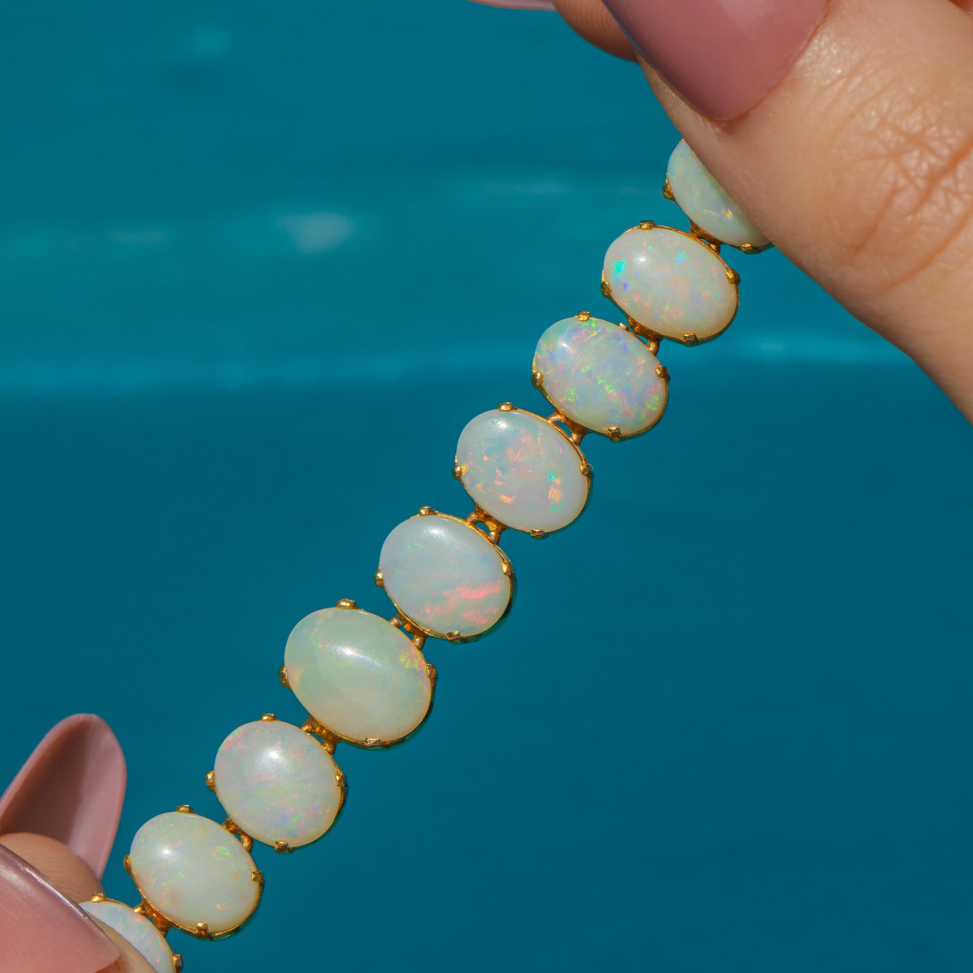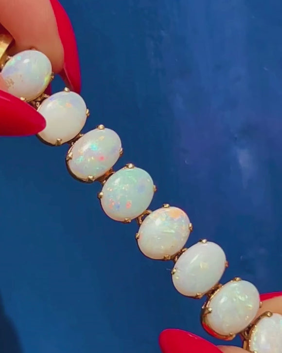 Bring timeless elegance to your repertoire with this antique 18ct Gold Opal bracelet! Inlaid with 23 Opal cabochons, with a firework display of iridescent flashes dancing from one smooth-cut Opal to the next, they caress the entire circumference of your wrist.