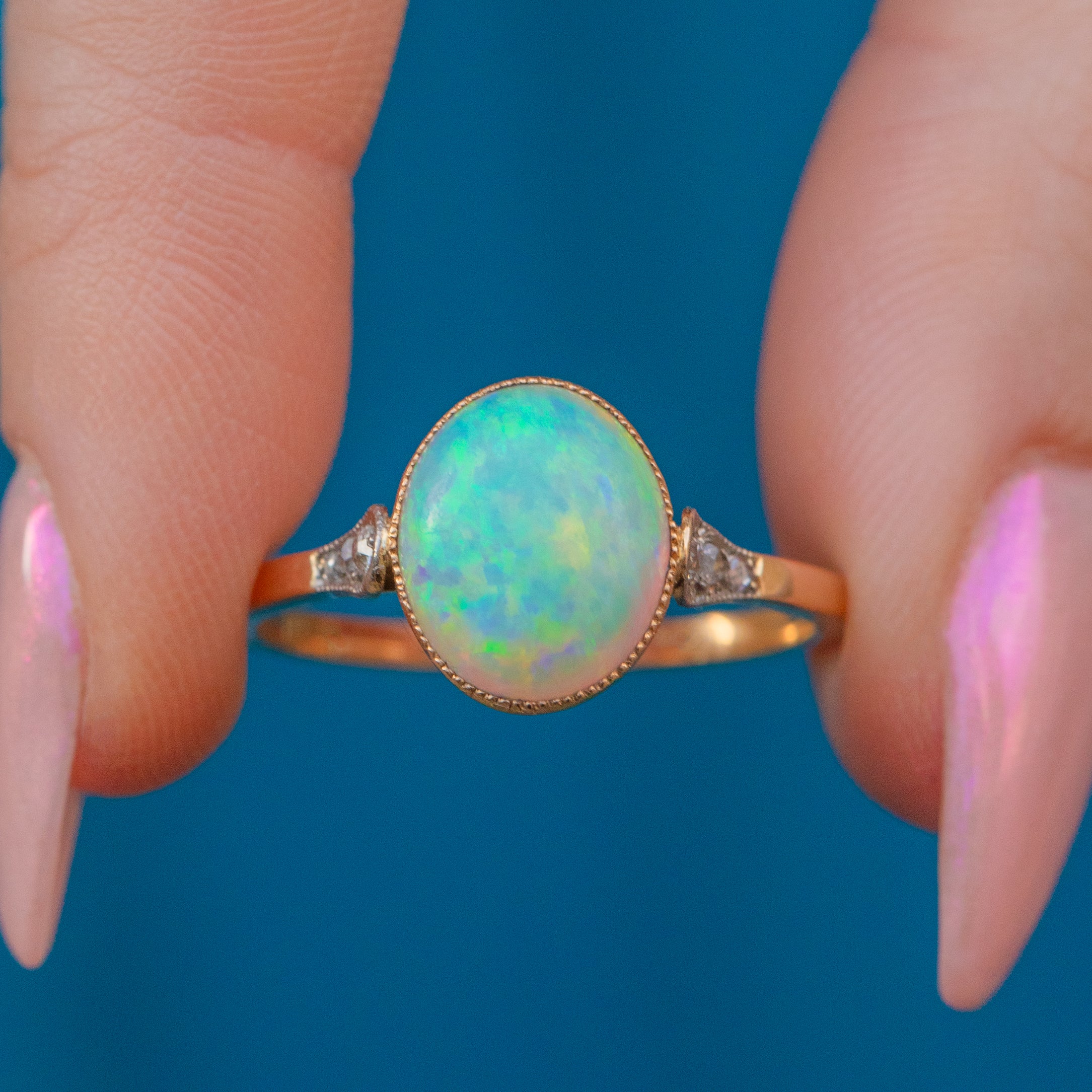 This gorgeous Edwardian 18ct Gold Opal cabochon ring will bring a touch of refined elegance to your antique jewellery collection! Crafted from solid 18ct Gold, this antique ring boats a mesmerising 1.57ct Opal cabochon offering an enchanting display of colours, accented by twinkling graduating Diamonds on the shoulders.