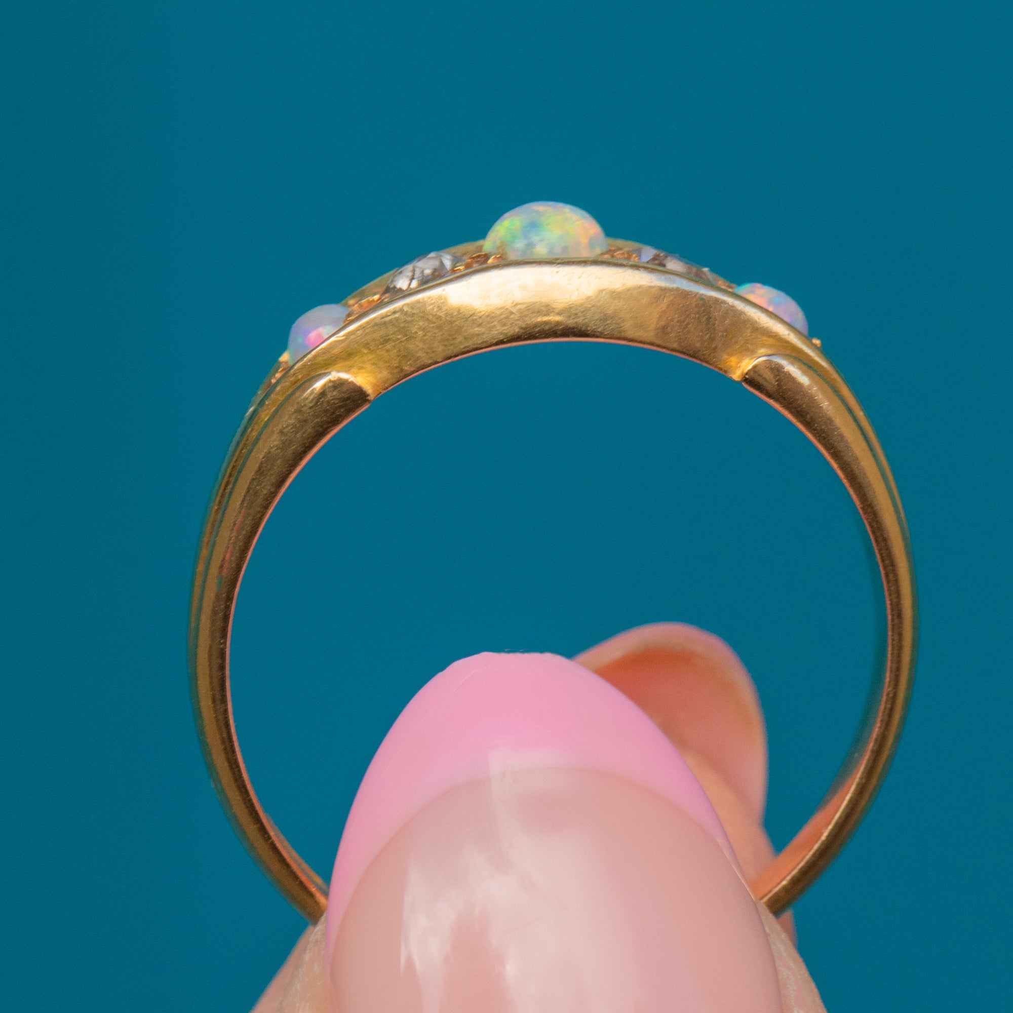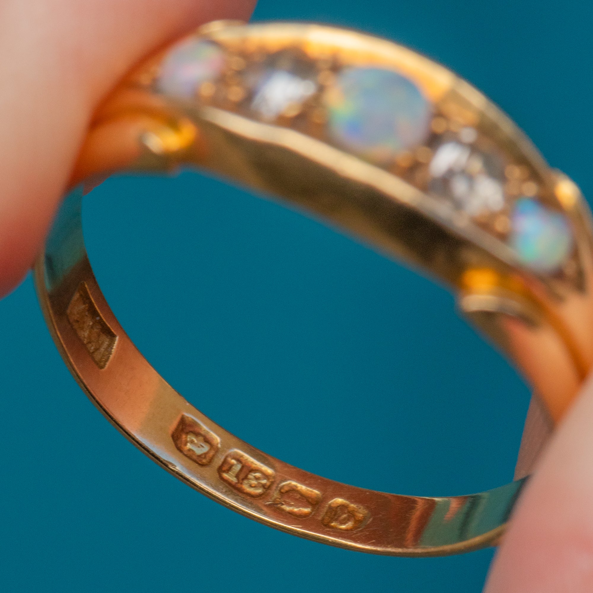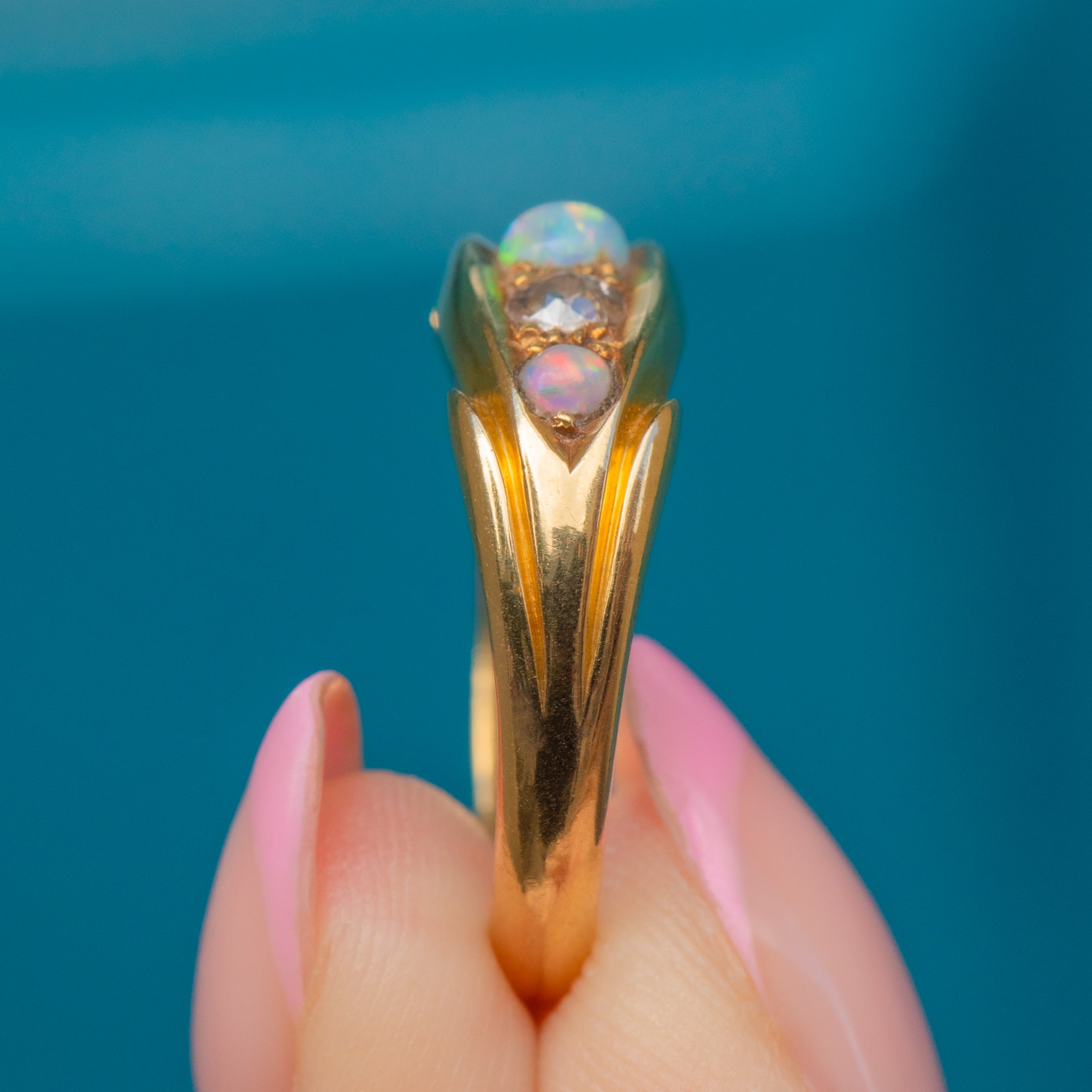 EXCELLENT. We are pleased to present this antique 18ct Gold Opal Diamond boat in excellent condition! The Opals and Diamonds are secure within their settings , with the 18ct Gold remaining well formed and ever so glossy. With a full set of hallmarks we can accurately date this Edwardian Gold ring to 1901, and she looks just as gorgeous today as when she was first made over a century ago!