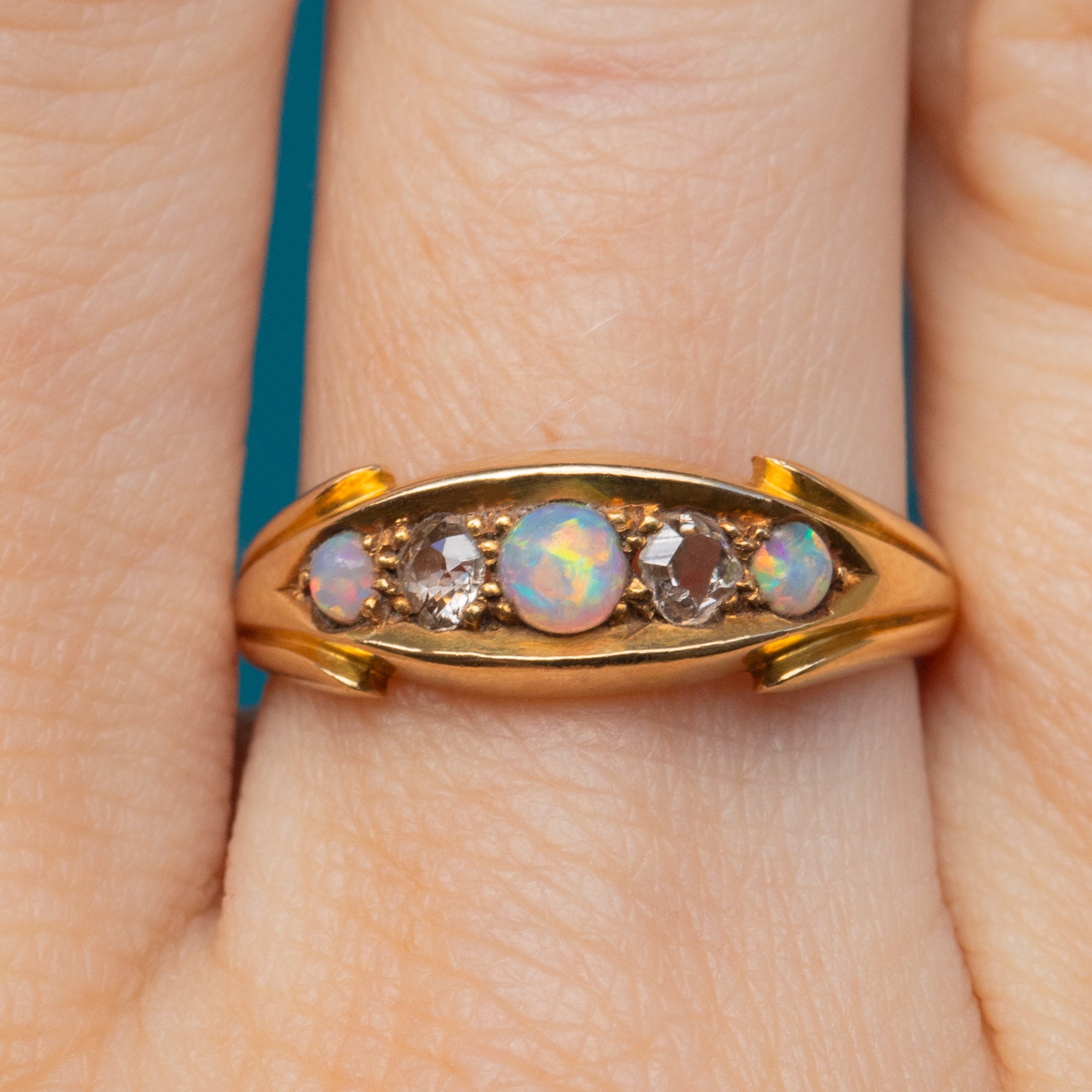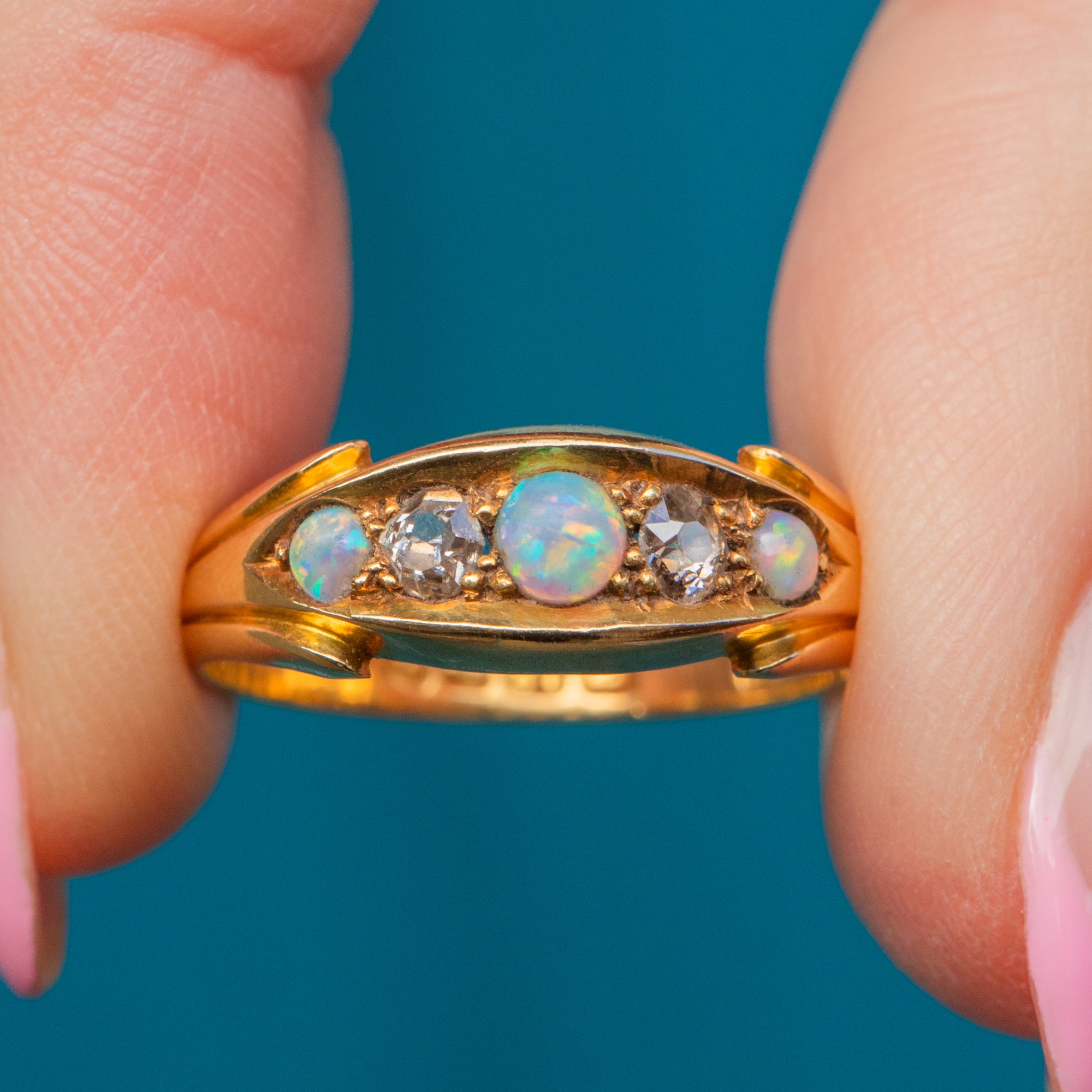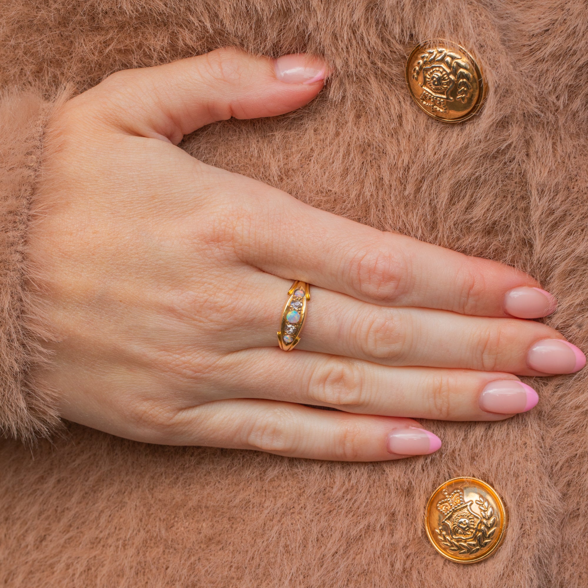 EXCELLENT. We are pleased to present this antique 18ct Gold Opal Diamond boat in excellent condition! The Opals and Diamonds are secure within their settings , with the 18ct Gold remaining well formed and ever so glossy. With a full set of hallmarks we can accurately date this Edwardian Gold ring to 1901, and she looks just as gorgeous today as when she was first made over a century ago!