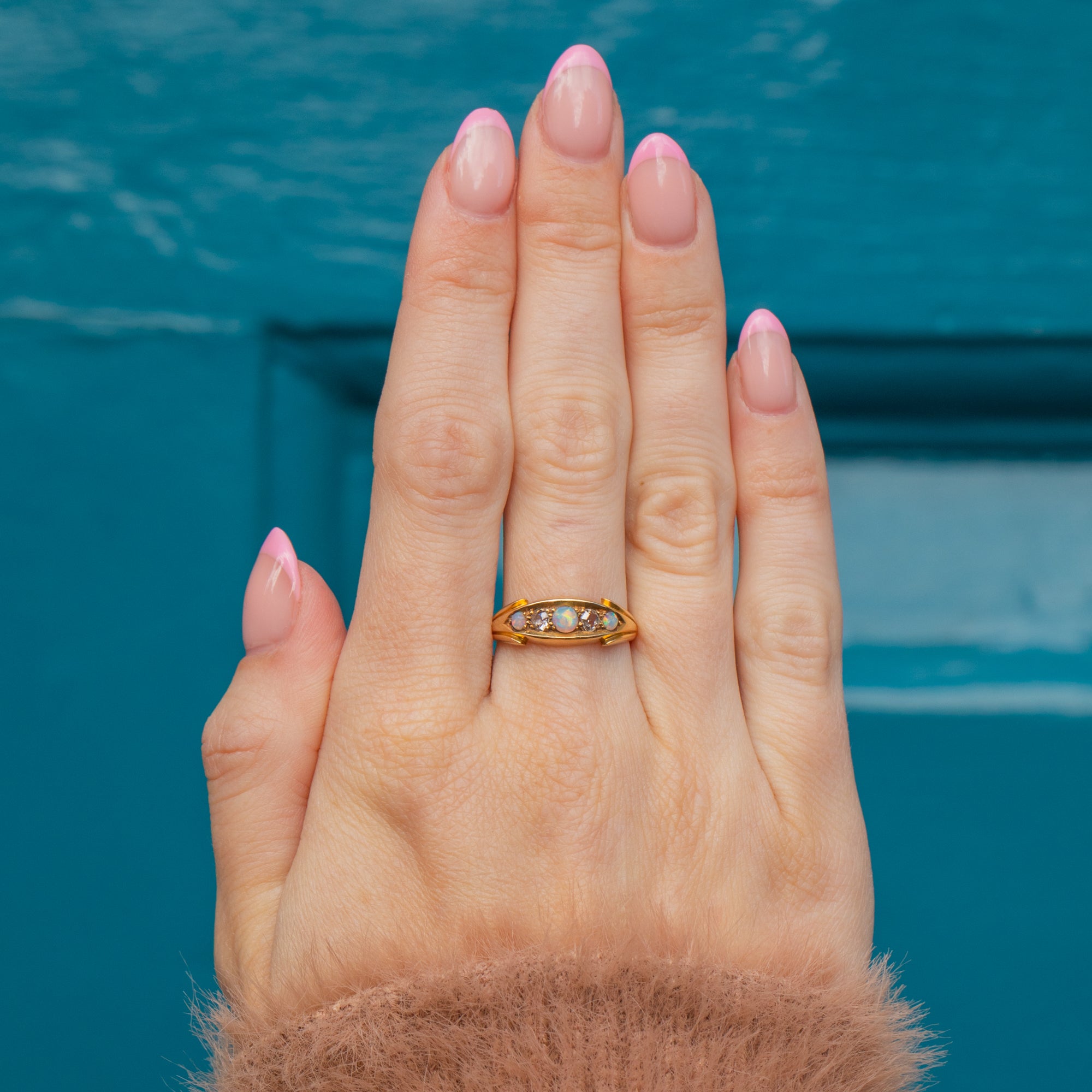 Her Opals alternate between two dazzling Diamonds, both old-mine cut for those who have a passion for antique cut Diamonds. Set neatly within buttery 18ct Gold, this Edwardian boat ring sits flush against your finger, providing comfort, aesthetic and splendour all in one ring!