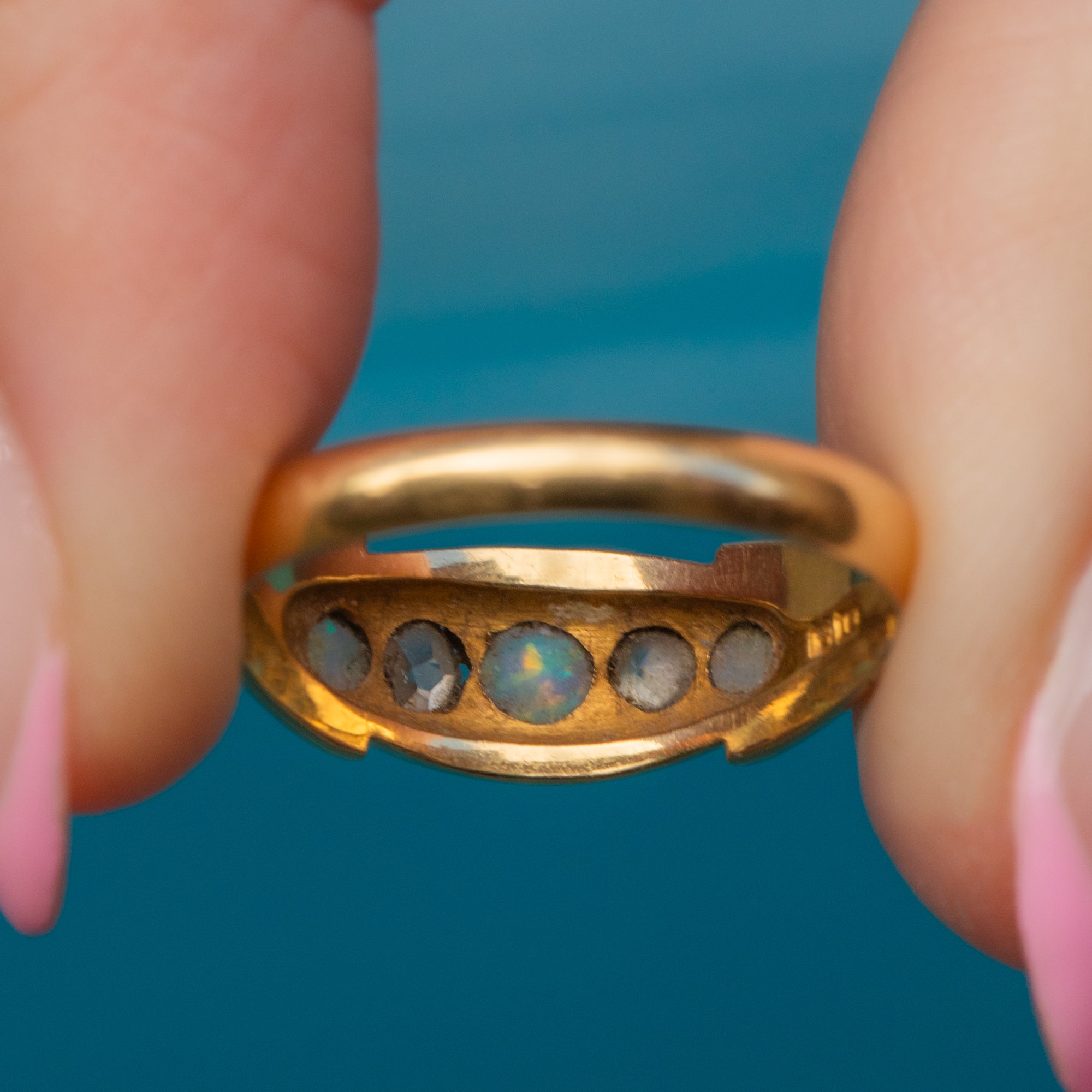 All eyes will be drawn to your hand as she is adorned by this antique 18ct Gold Opal Diamond boat ring! You can't help but become mesmerised by the varying iridescent colours running through the core of her three dainty Opal cabochons, packing a serious punch.