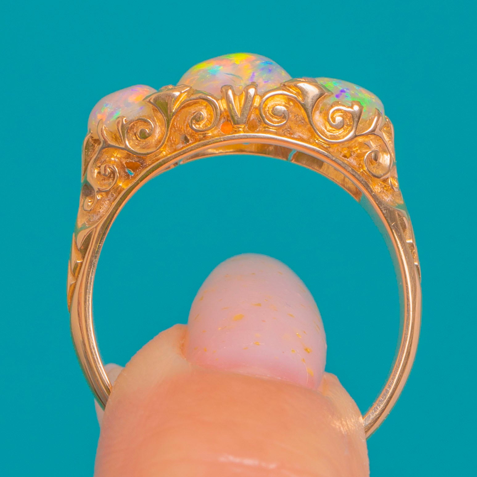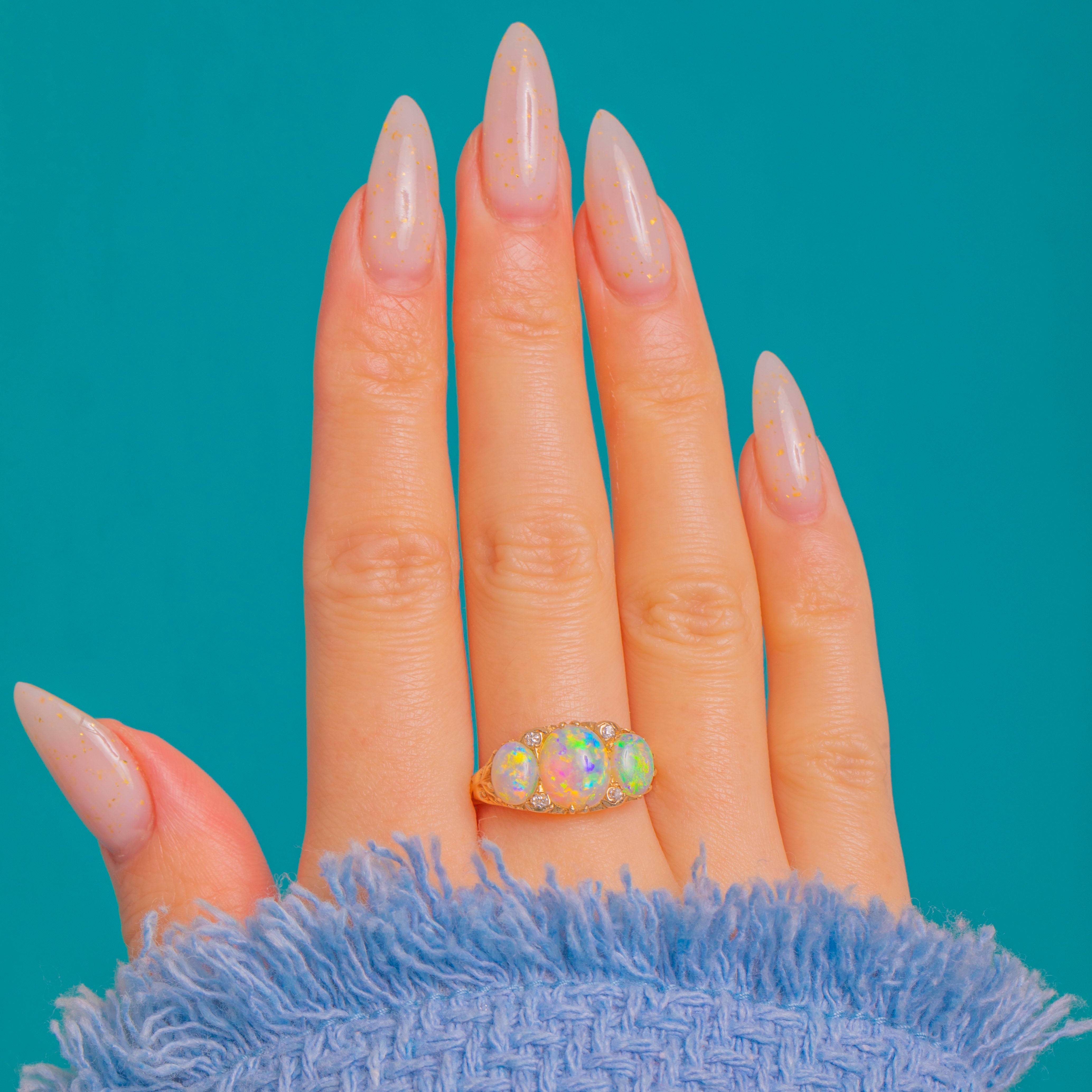 A luminous Victorian boat ring in 18ct Gold, alive with the electric play-of-colour only fine Opals can deliver. Three graduated oval Opal cabochons glow with shifting greens, oranges and reds, punctuated by tiny Diamond accents that add a delicate sparkle between the stones. The low ring face glides across the finger, beautifully framed by a pierced scroll gallery and foliate-carved shoulders for that romantic antique flourish.