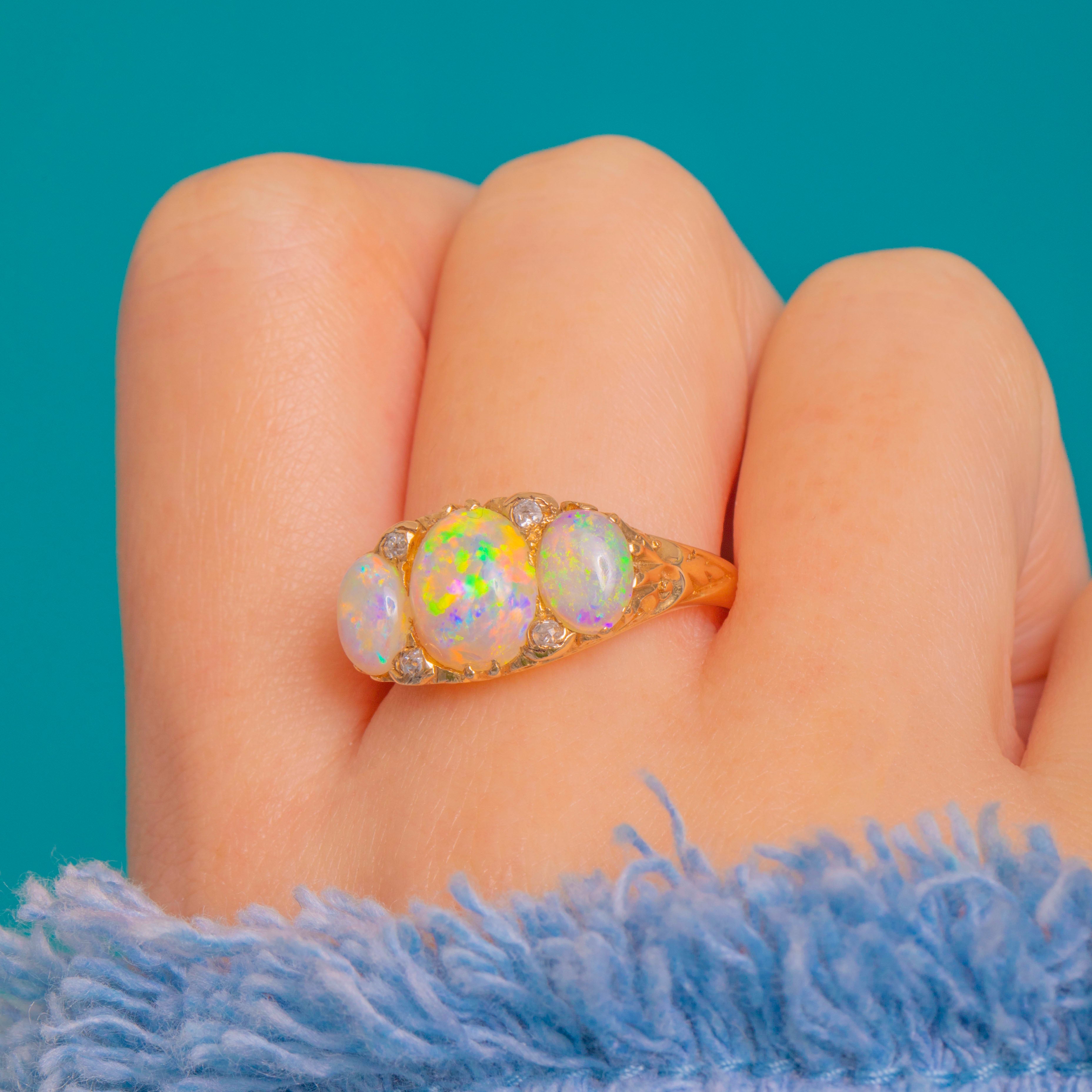 Expertly crafted with open backs and neat claws, the ring tapers to a comfortable shank while keeping all eyes on those vivid Opals. A timeless Victorian treasure with elegant proportions and ornate detailing, perfect for lovers of classic antique glamour.