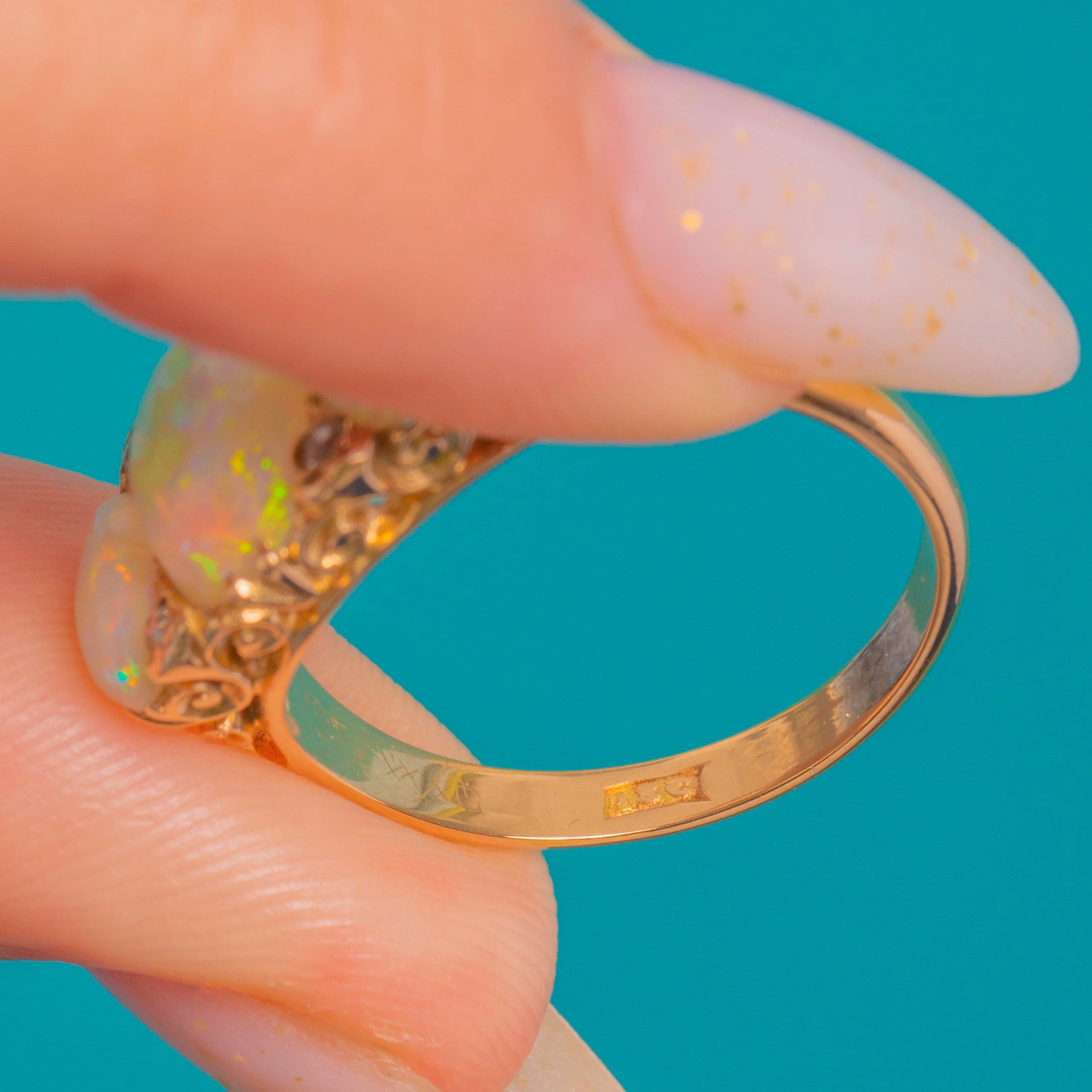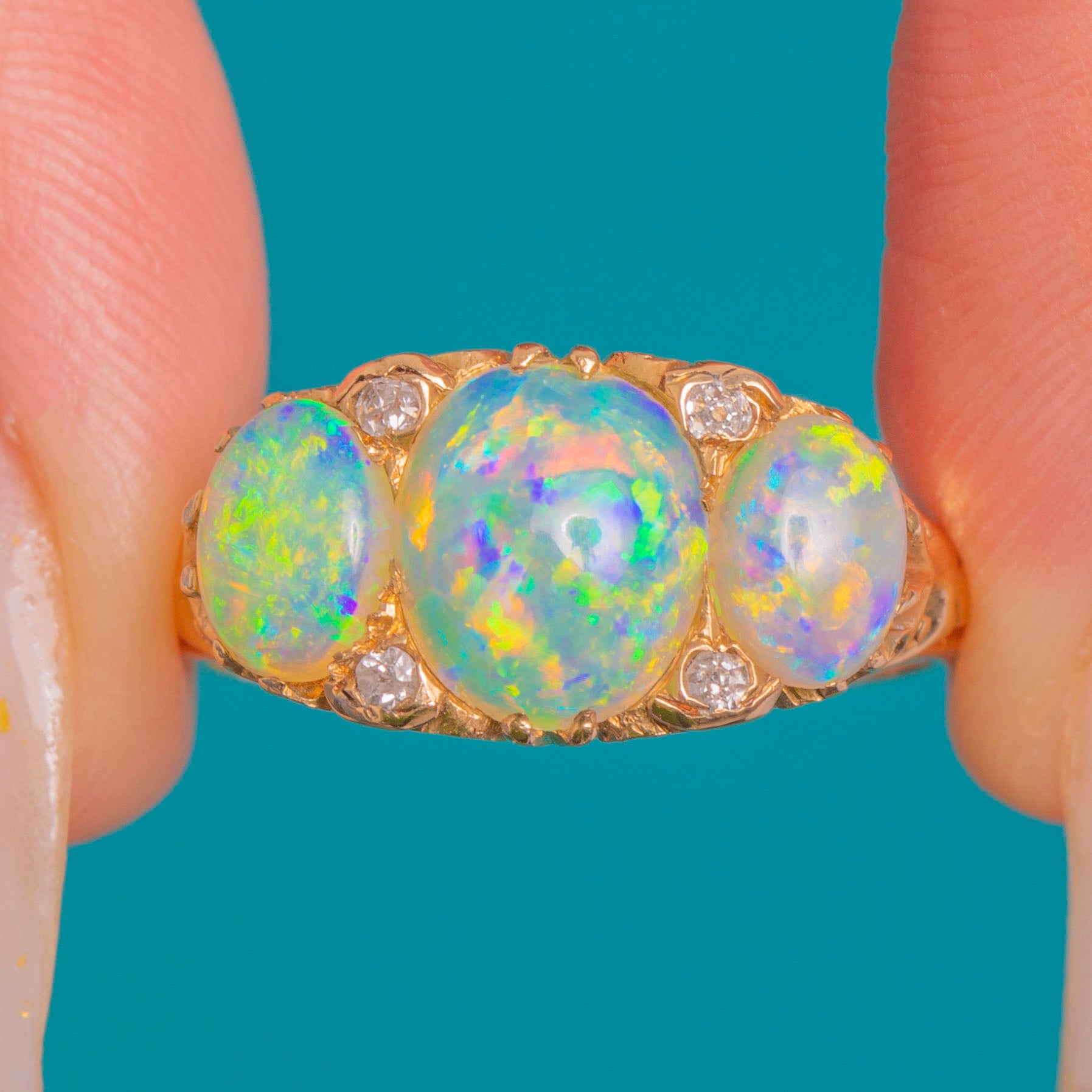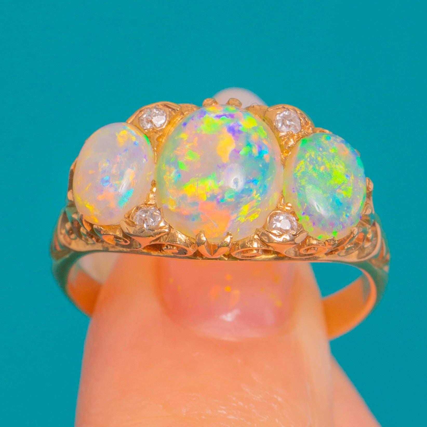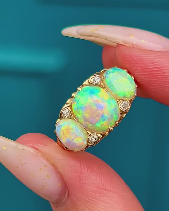 EXCELLENT: The Opals are glossy and vibrant with no obvious chips or cracks, and the tiny Diamonds are bright and secure. The carved and pierced details remain crisp with even, intact claws; only light surface wear to the settings and shank commensurate with age. A subtle inner-shank colour change suggests a past sizing; no clear repairs are observed.