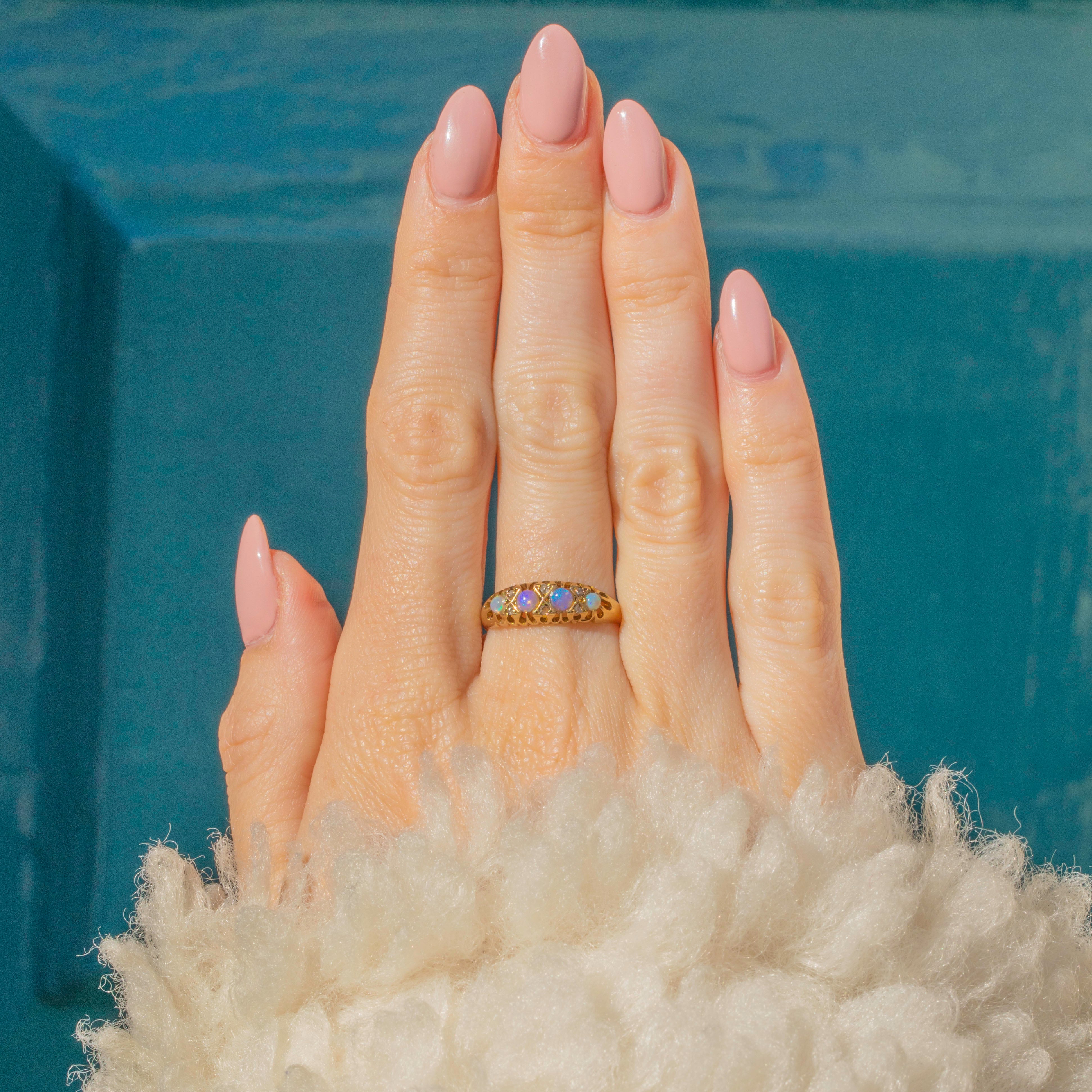 EXCELLENT. This antique 18ct Gold Opal Diamond boat ring is in wonderful condition. Her iridescent Opals look magical in the light, and are free from chips or scuffs, and her surrounding Diamonds are all present. The stones sit securely within a warm 18ct Gold setting and band, free from any visible signs of wear. In such superb condition, this Victorian ring is a must-have!