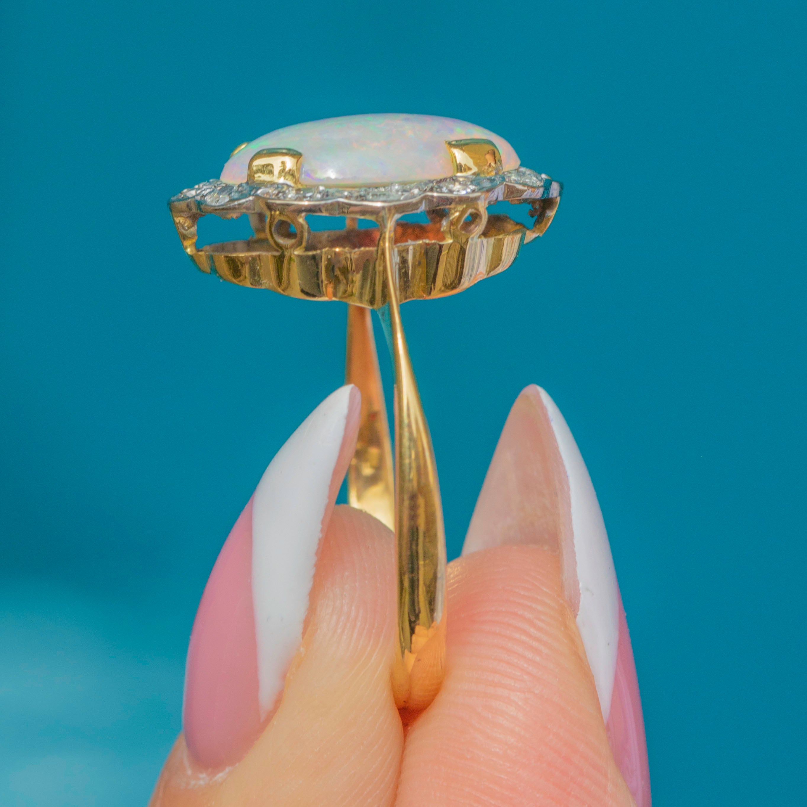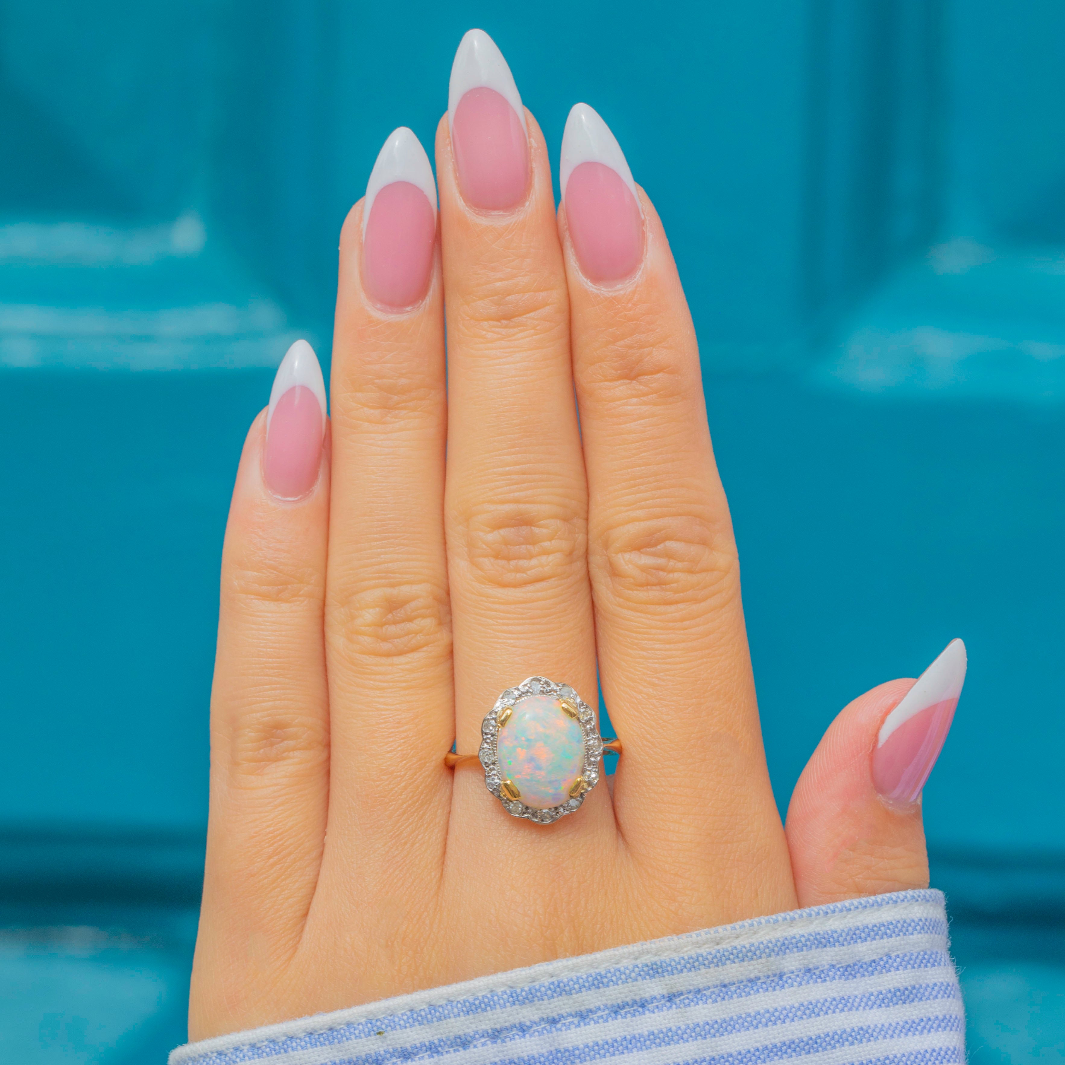 This elegant Edwardian cluster ring centres on a luminous oval 1.10 Opal with lively pastel flashes. The Opal is framed by a softly scalloped halo of Diamonds set in bright 18ct White Gold, with bold 18ct Yellow Gold claws adding warmth and contrast to the design.