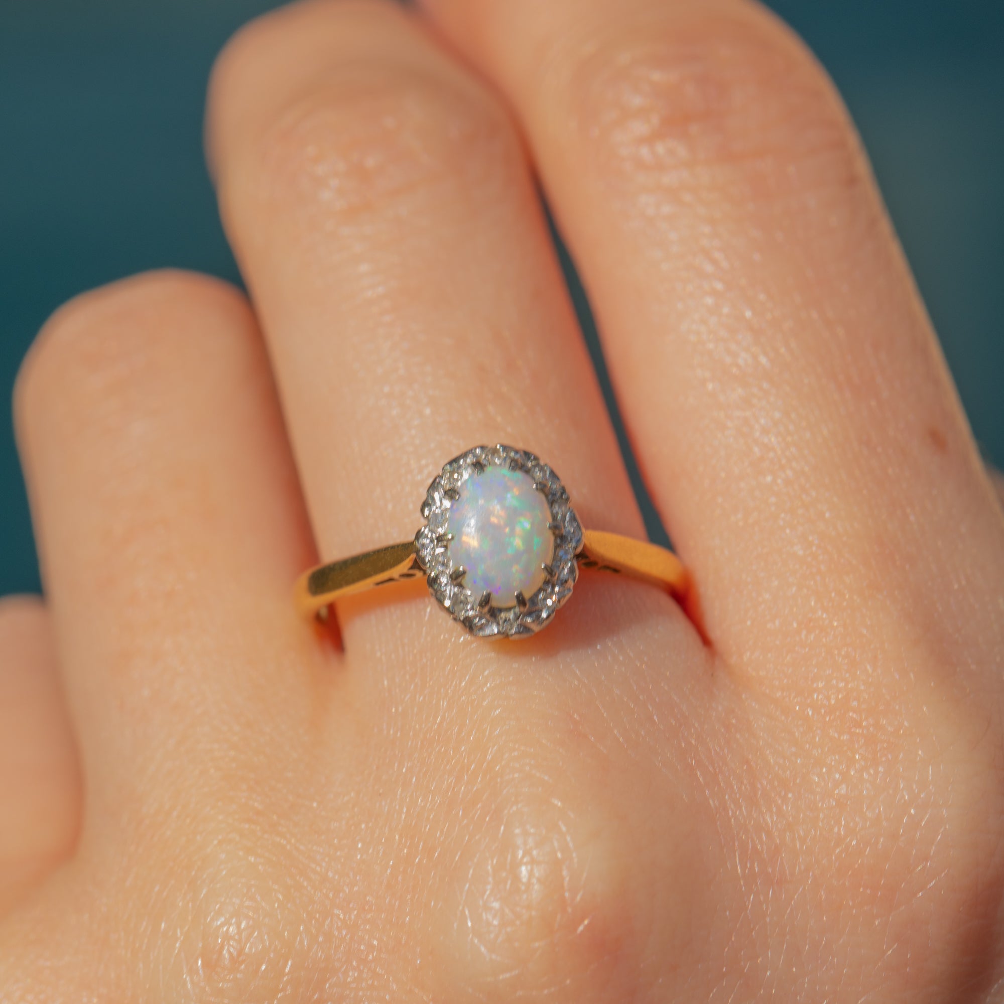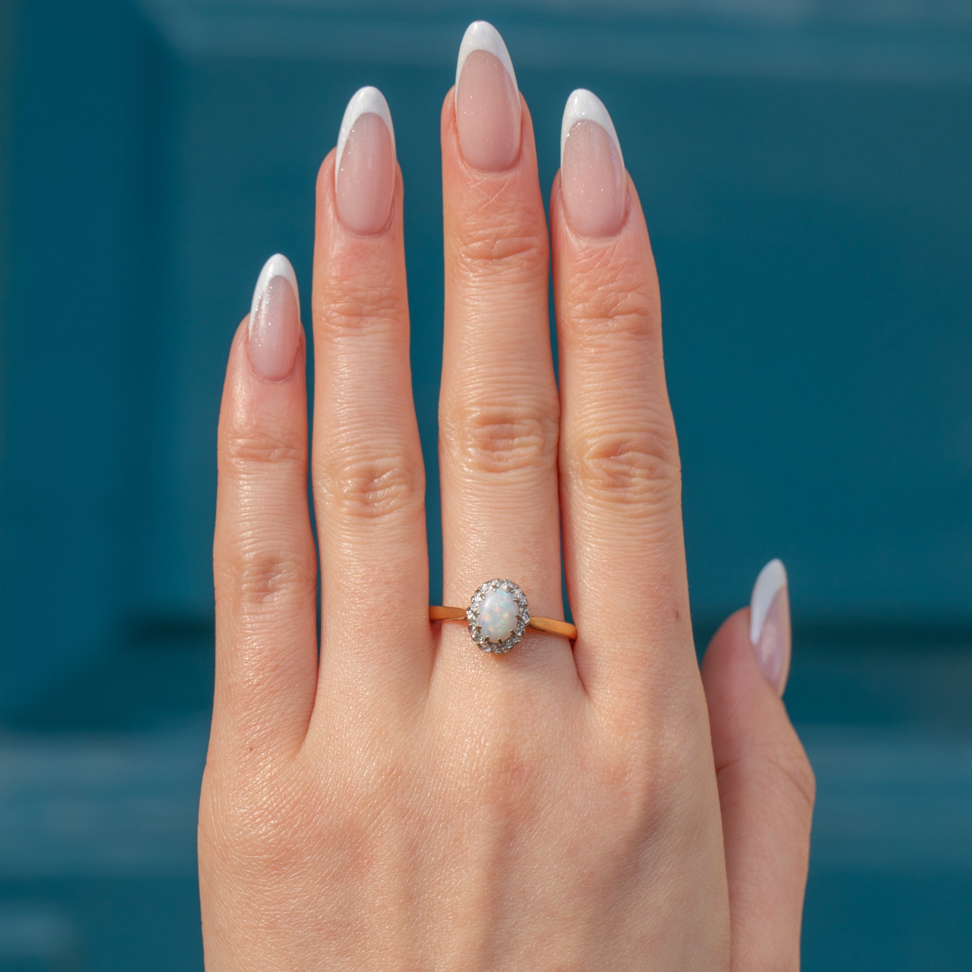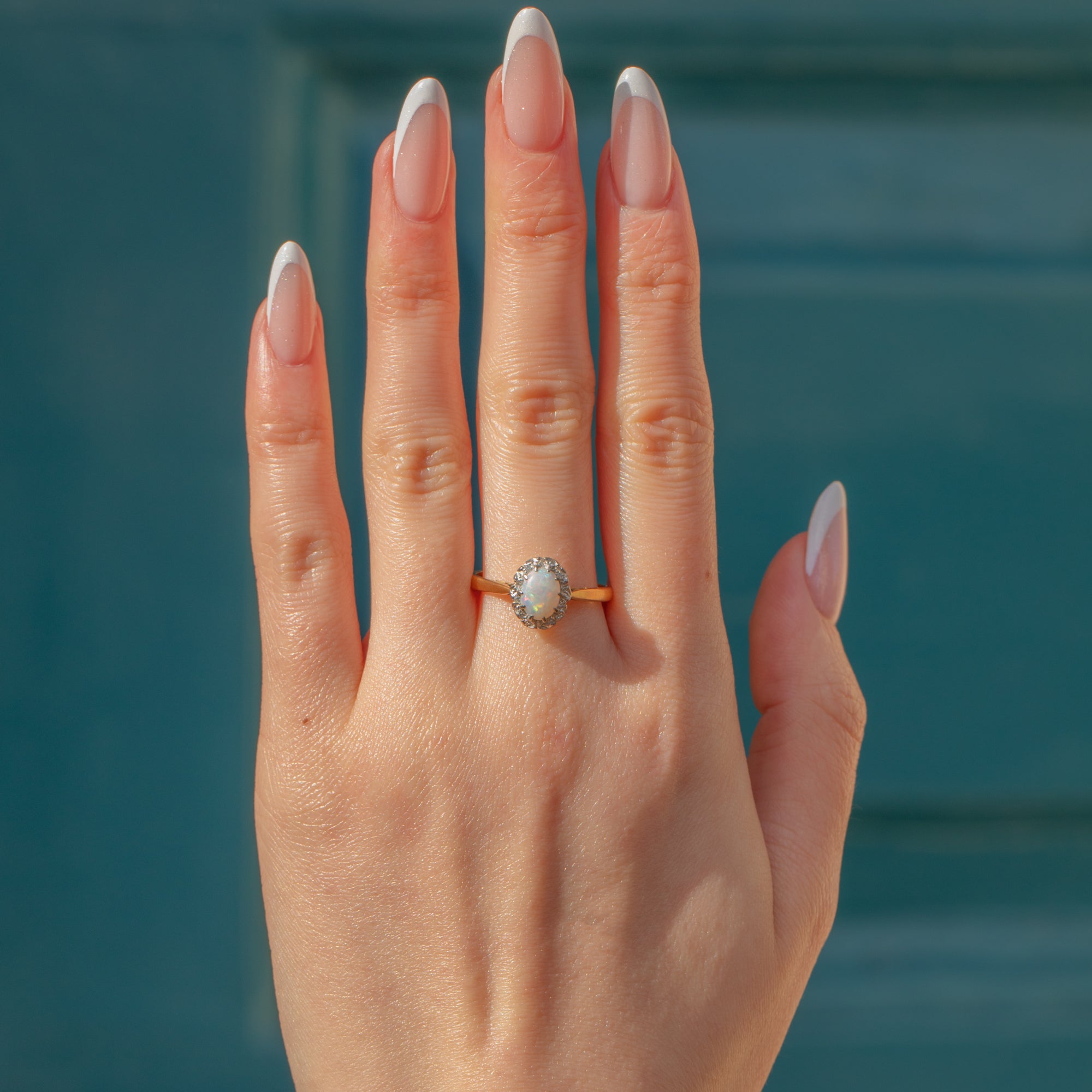 Antique 18ct Gold Opal Diamond Cluster Ring, 0.29ct Opal