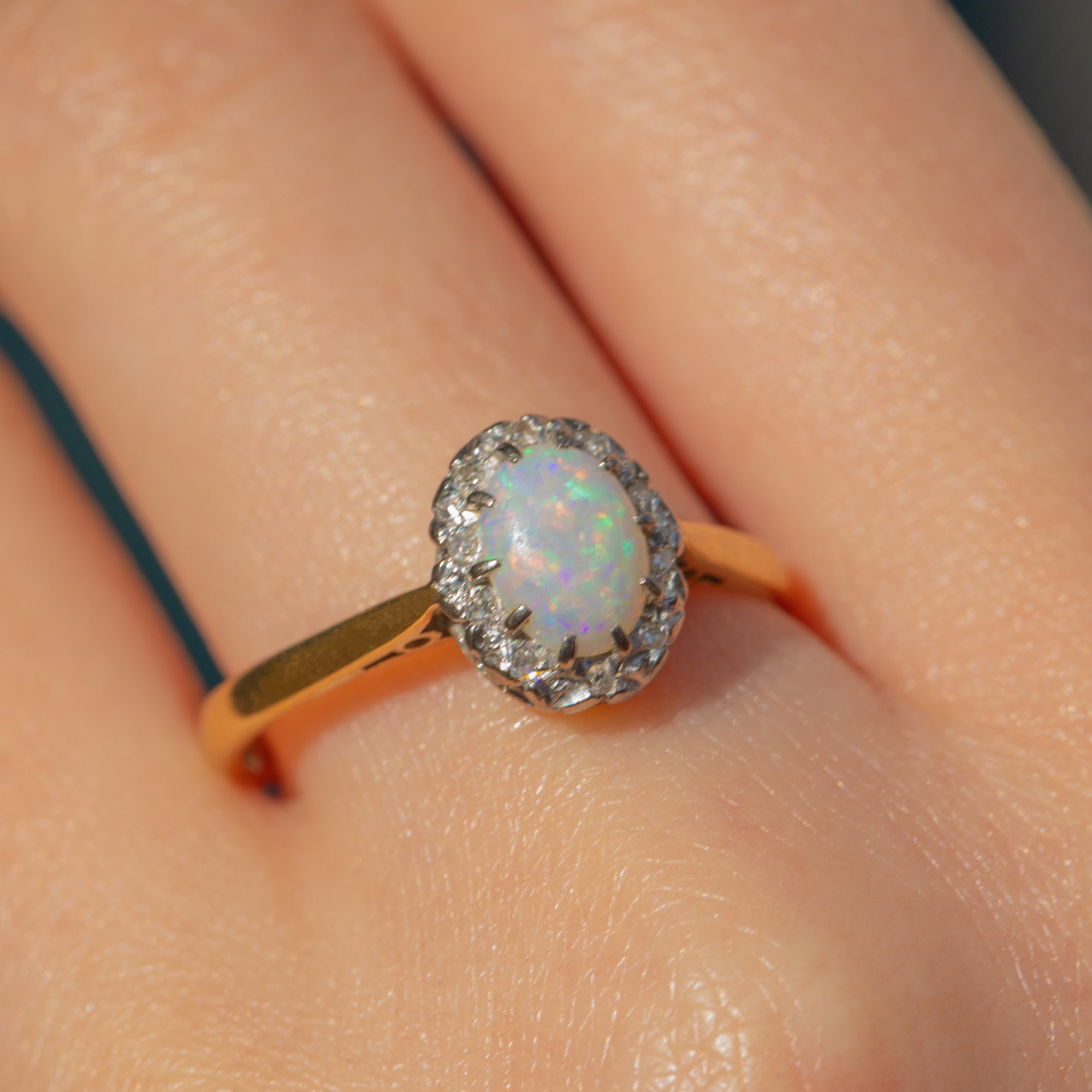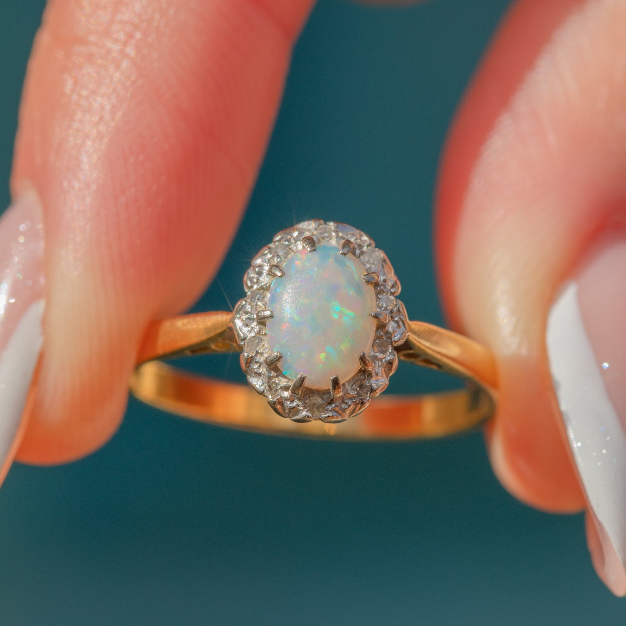 VERY GOOD-EXCELLENT: This antique 18ct Gold Opal Diamond cluster ring is in lovely condition. The gemstones are all present and securely set within lustrous white Gold claws. The Opal has a light scuff to its surface, which is only noticeable under close inspection and does not detract from the beauty of the stone. The Gold band is smooth and robust, providing secure and comfortable wear!
