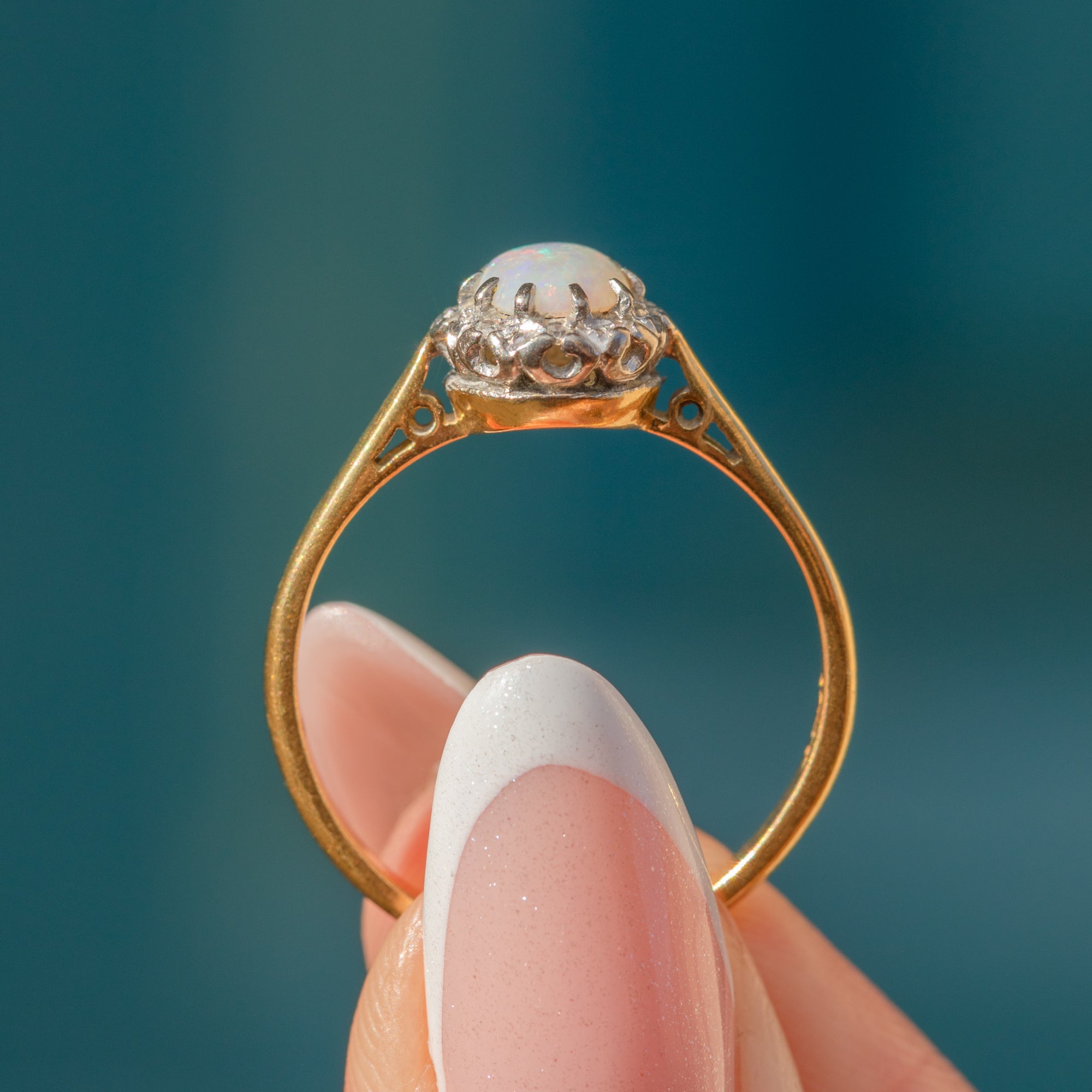 If you have a penchant for pretty jewels, this antique 18ct Gold Opal Diamond cluster ring is a must for your collection! The creamy 0.29ct Opal cabochon is speckled with zingy pops of neon hues, haloed by twinkling Diamonds, all set in bright 18ct White Gold for a refined finish.