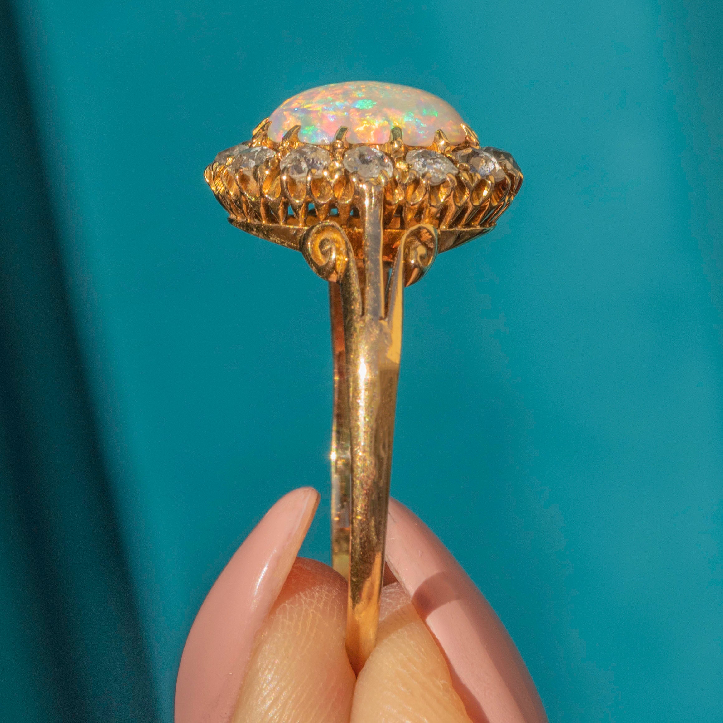 EXCELLENT. This antique 18ct Gold Opal Diamond cluster ring is in excellent condition. The Opal is smooth and free from signs of wear, securely held within its claw settings. The Diamonds are all present and free from fleabites, providing this antique ring with ample sparkle. The 18ct Gold has an even saturation throughout and the ring band has remained robust allowing you to wear this Victorian Opal Diamond ring with absolute confidence. With many more years of wear in her, this splendid piece of Victorian jewellery would make a fabulous heirloom to be passed down the generations!