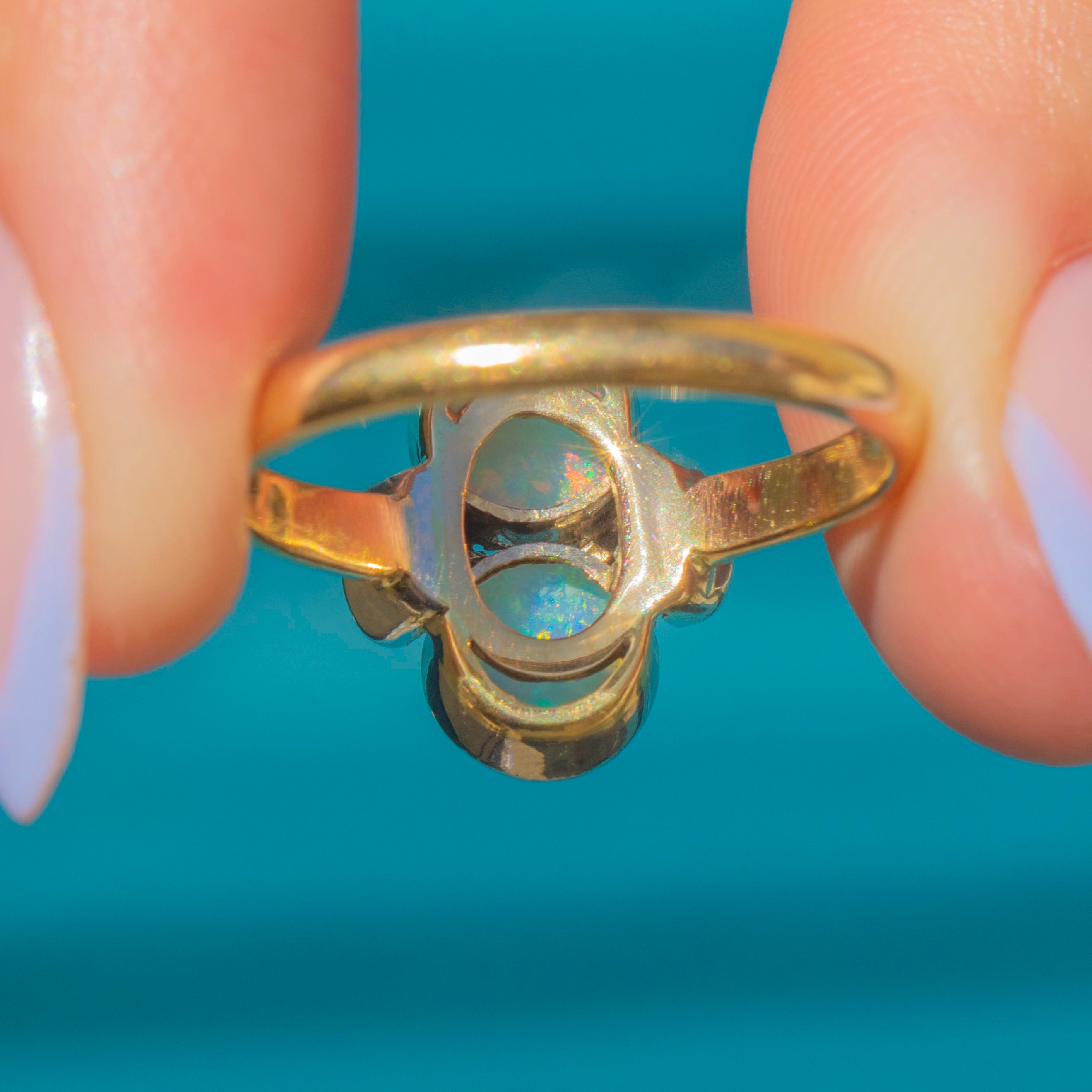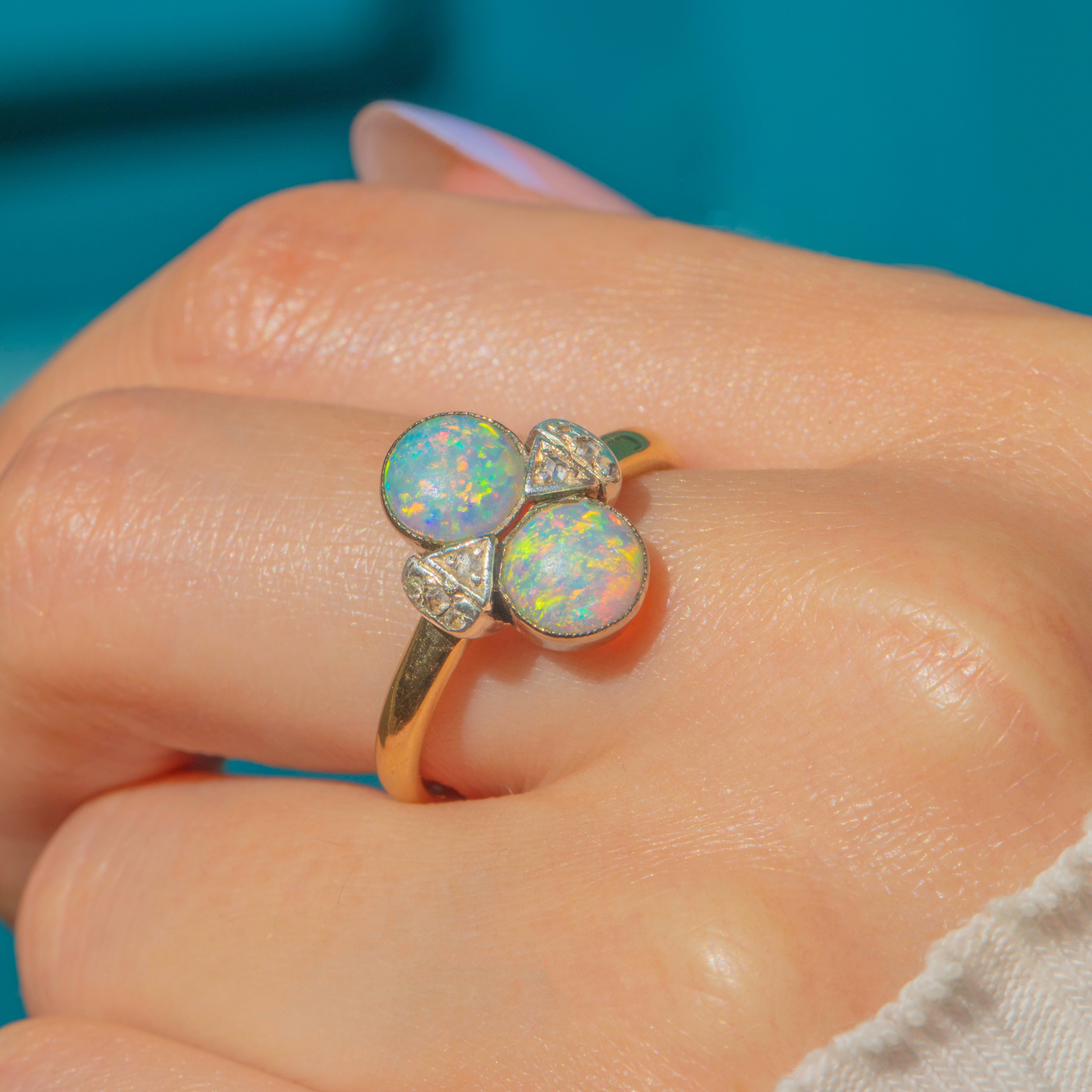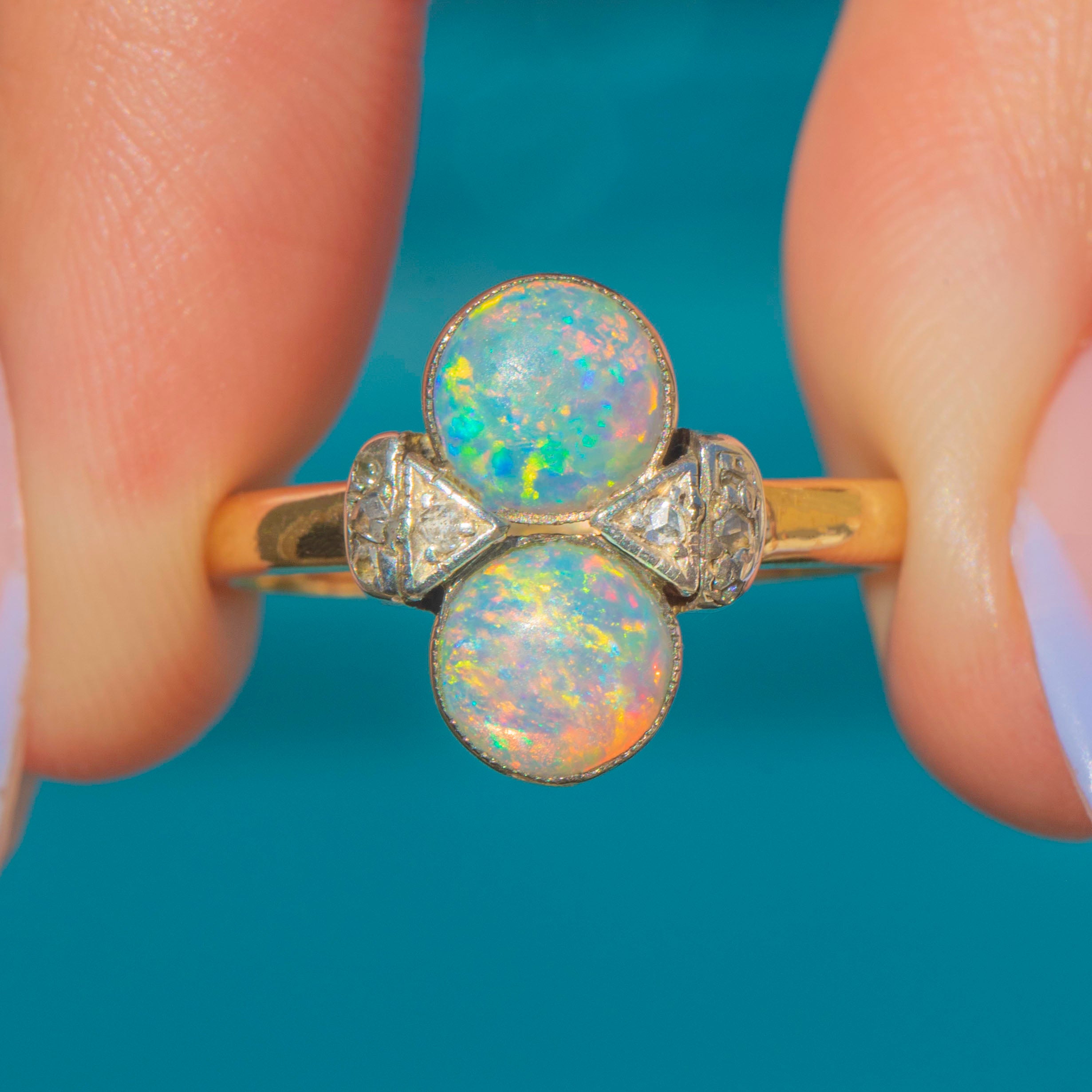 If you have a penchant for resplendent jewels, this antique 18ct Gold Opal Diamond ring is a must for your collection! The impressive Opal cabochons will instantly grab your attention, with their galactic hues shimmering under the light. The Opals are accented by dainty rose-cut Diamonds, adding a subtle sparkle, displayed within triangular Silver settings, creating a bold impact.