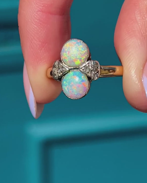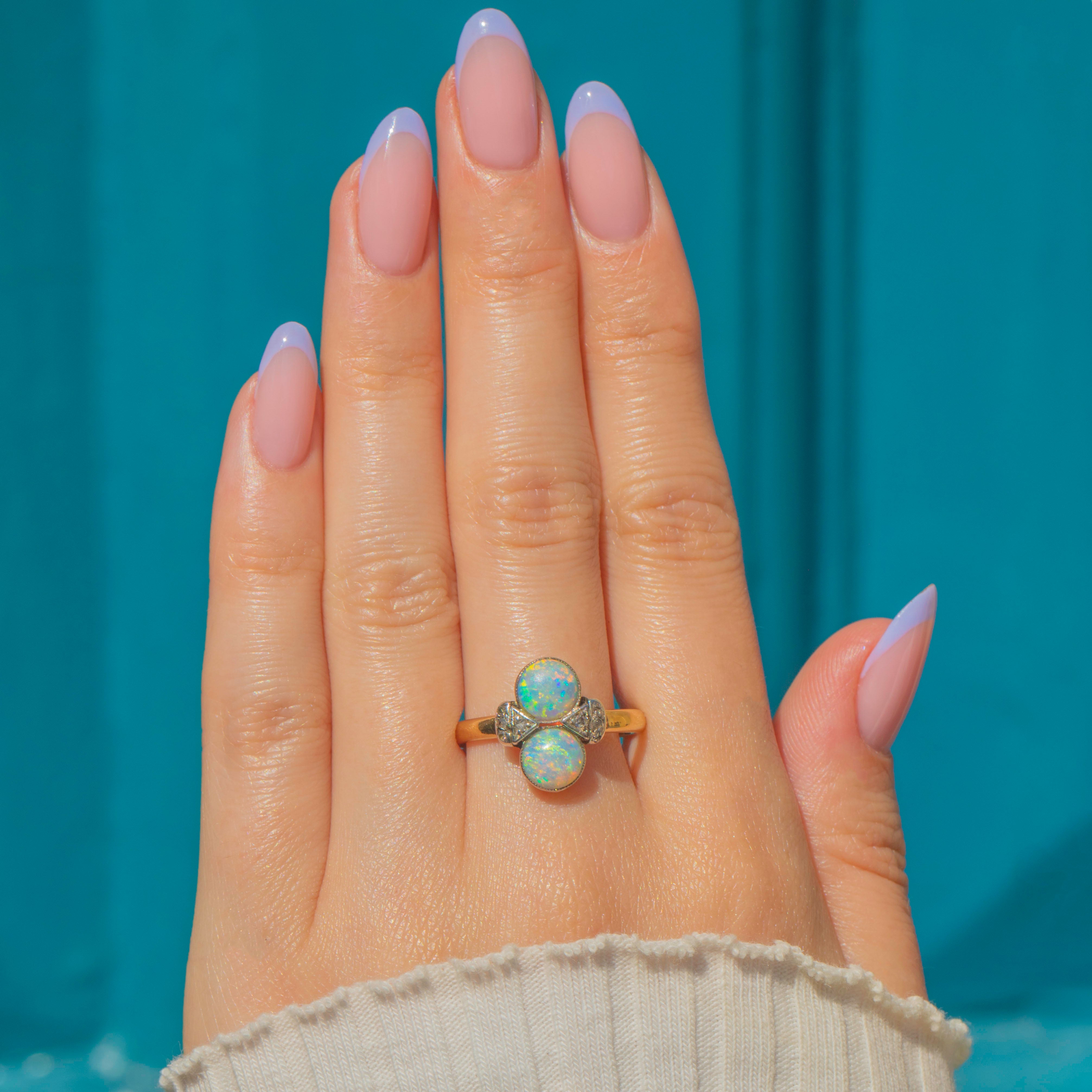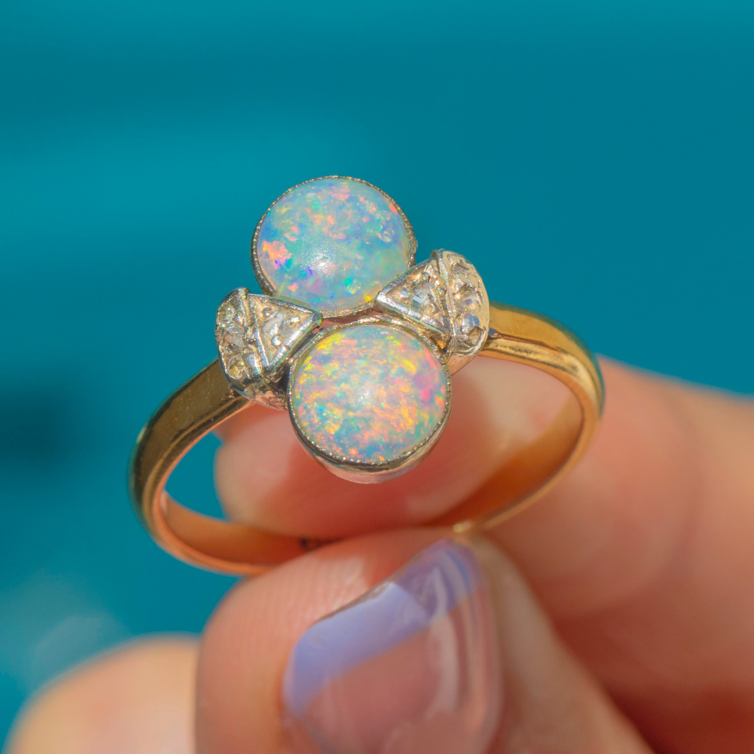 If you have a penchant for resplendent jewels, this antique 18ct Gold Opal Diamond ring is a must for your collection! The impressive Opal cabochons will instantly grab your attention, with their galactic hues shimmering under the light. The Opals are accented by dainty rose-cut Diamonds, adding a subtle sparkle, displayed within triangular Silver settings, creating a bold impact.