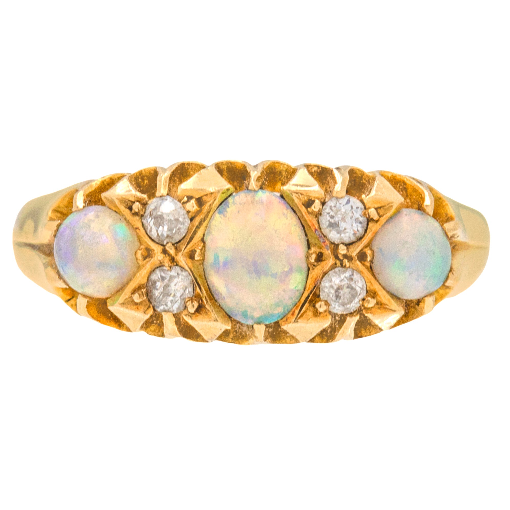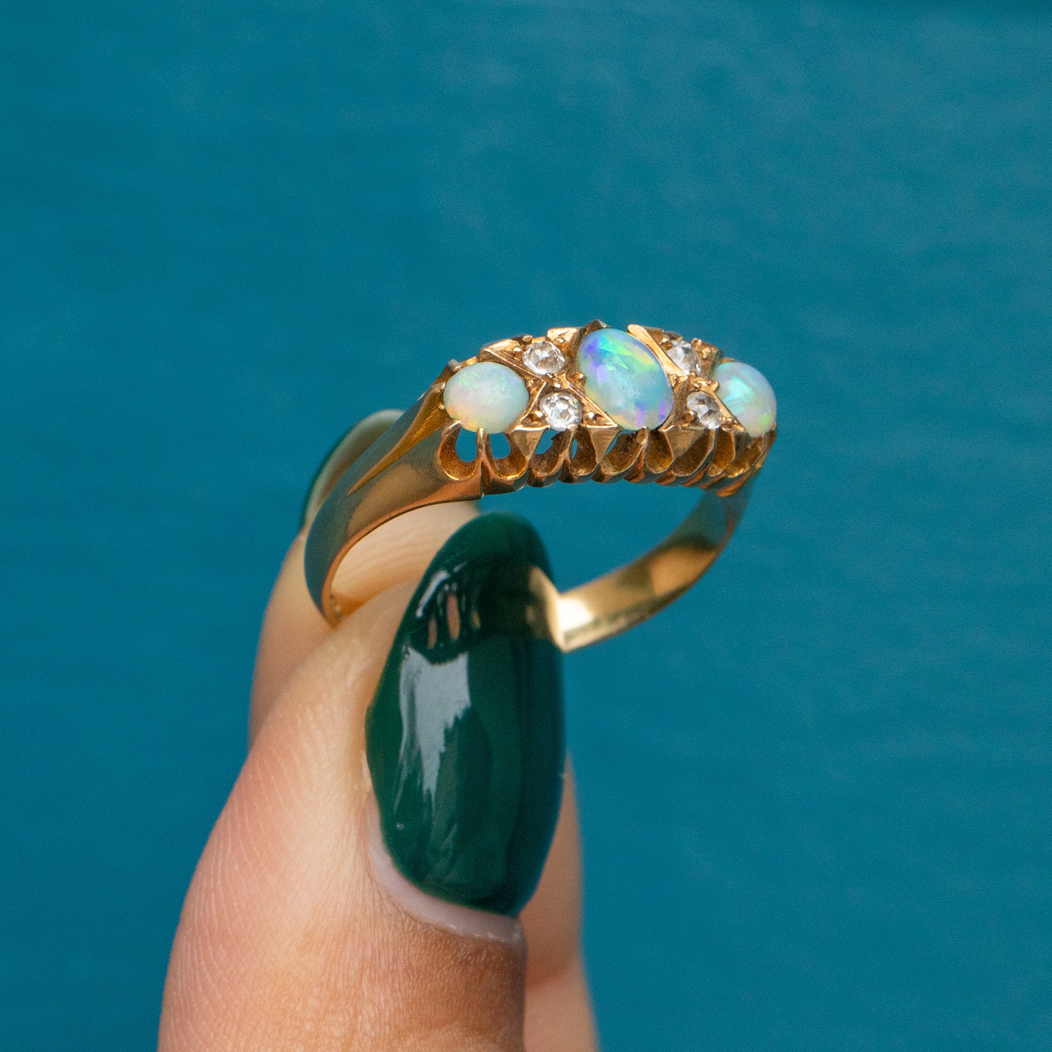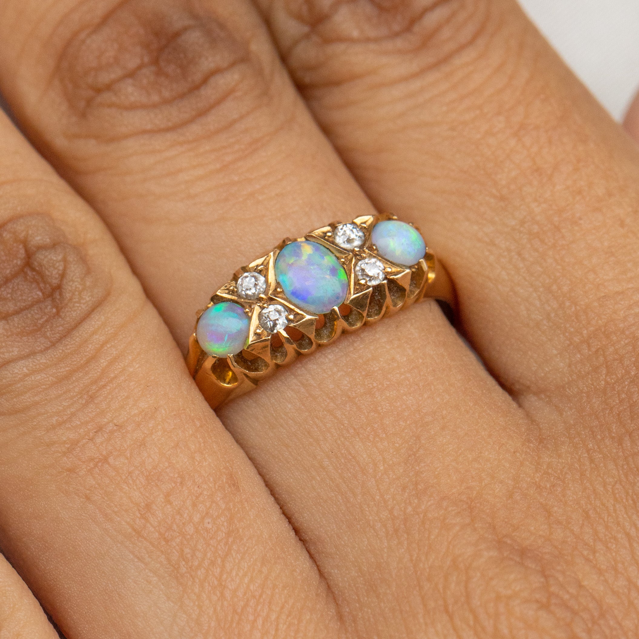 Interspersed between these opulent Opals are four twinkling Diamonds, adding that extra touch of splendour. With a buttery 18ct Gold shank and a decorative raised gallery, this Opal Diamond ring gives you wonderful finger coverage. Gliding smoothly onto your finger, she is a dream come true!