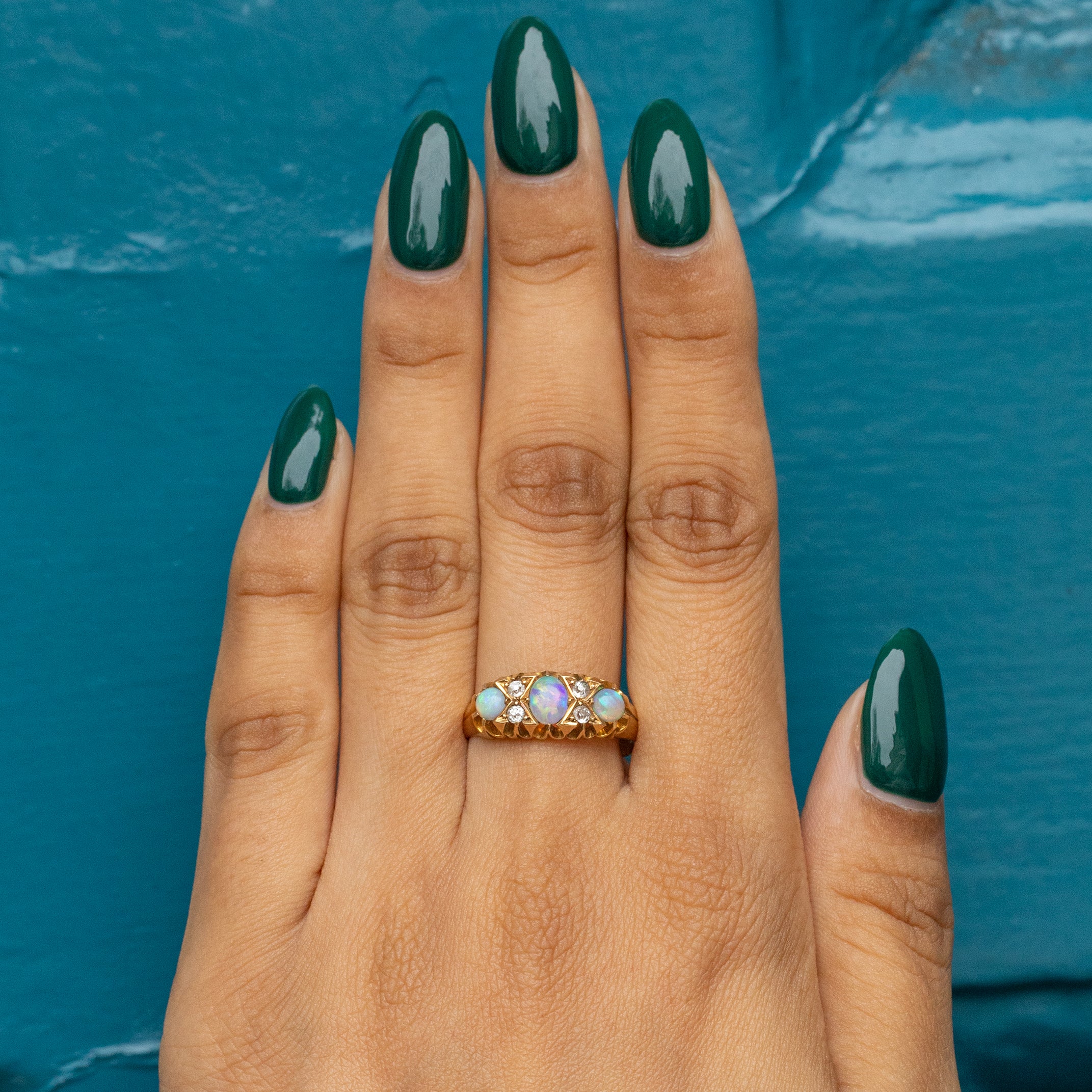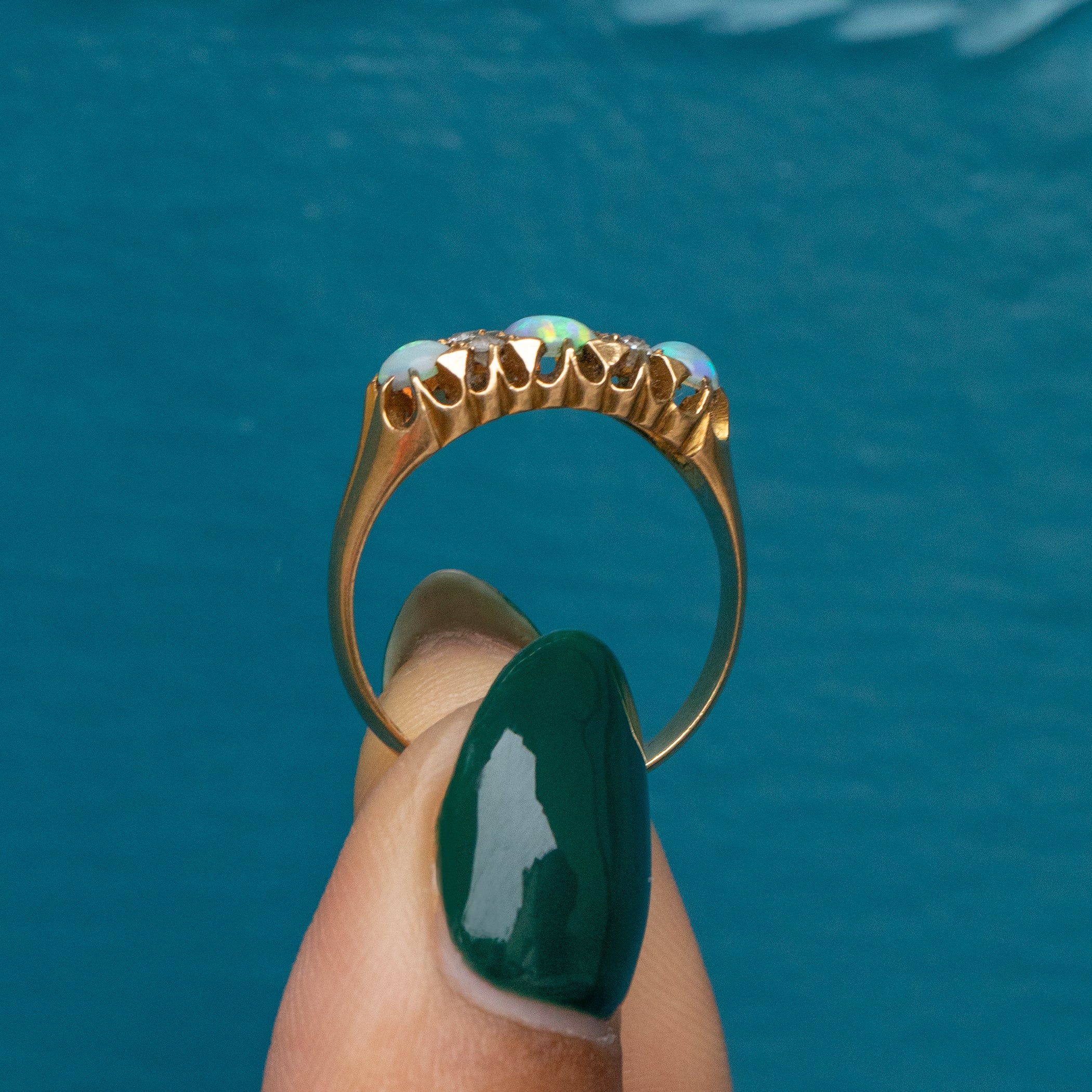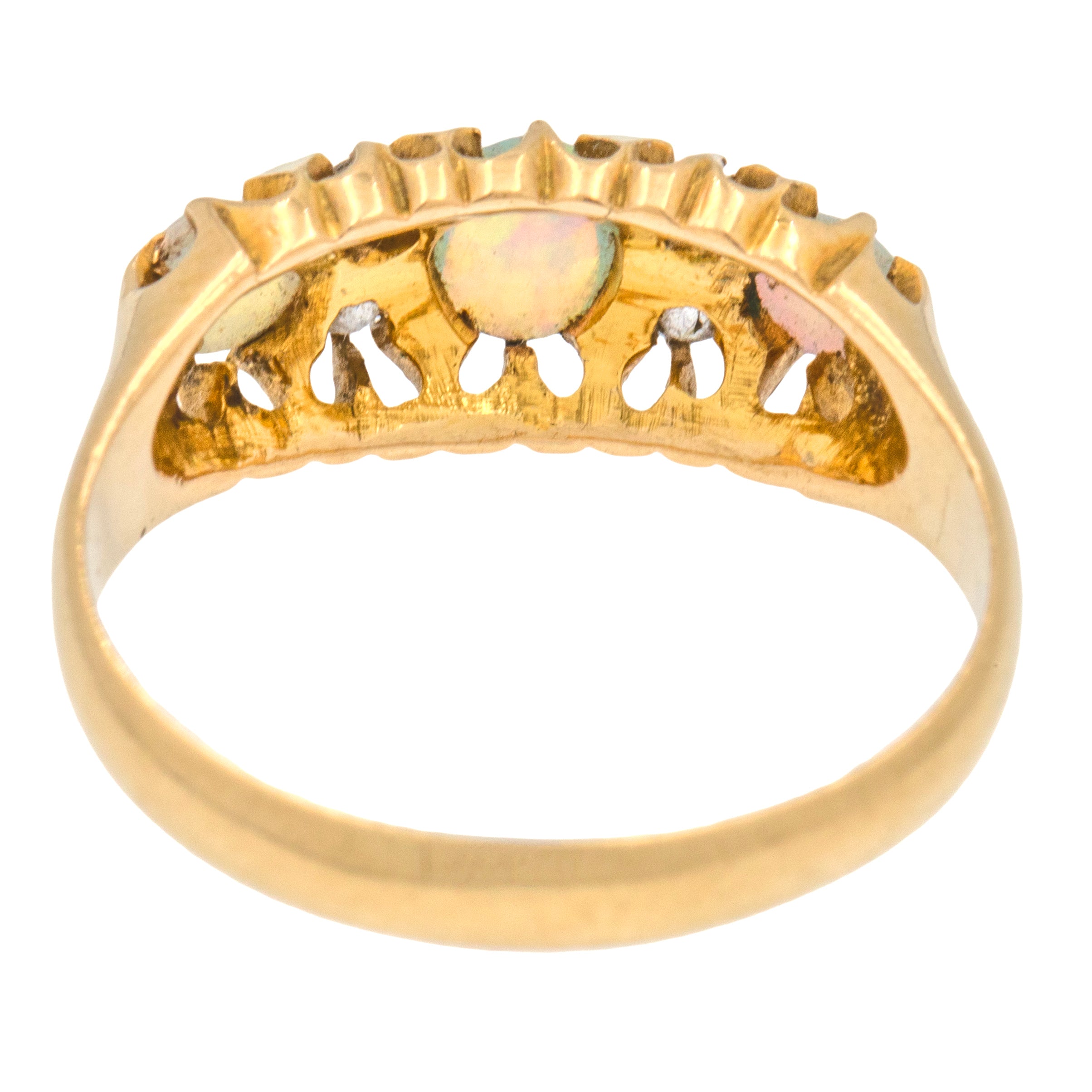 Interspersed between these opulent Opals are four twinkling Diamonds, adding that extra touch of splendour. With a buttery 18ct Gold shank and a decorative raised gallery, this Opal Diamond ring gives you wonderful finger coverage. Gliding smoothly onto your finger, she is a dream come true!