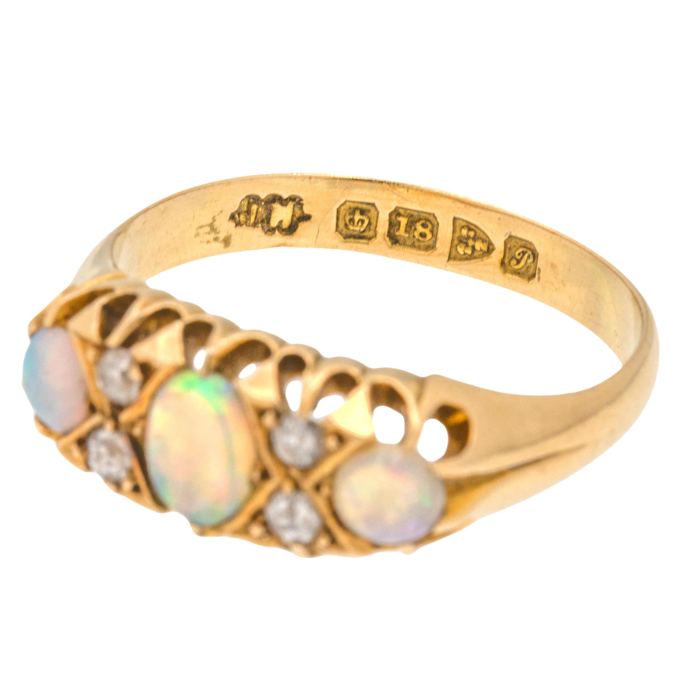 EXCELLENT. This antique 18ct Gold Opal Diamond three stone ring is in very good condition. The 18ct Gold is buttery and the shank is solid and sturdy, having retained its rounded shape well over the years. Her Opals have magnificent hues and are smoothly cut, free from chips or scuffs. Each Diamond speacer adds a subtle twinkle and is free from fleabites. With a full set of hallmarks including the rare Chester Assay mark, we can accurately date her back to 1915. A treasure from the early 20th century, this splendid ring will add undeniable decadence to your ring stack!