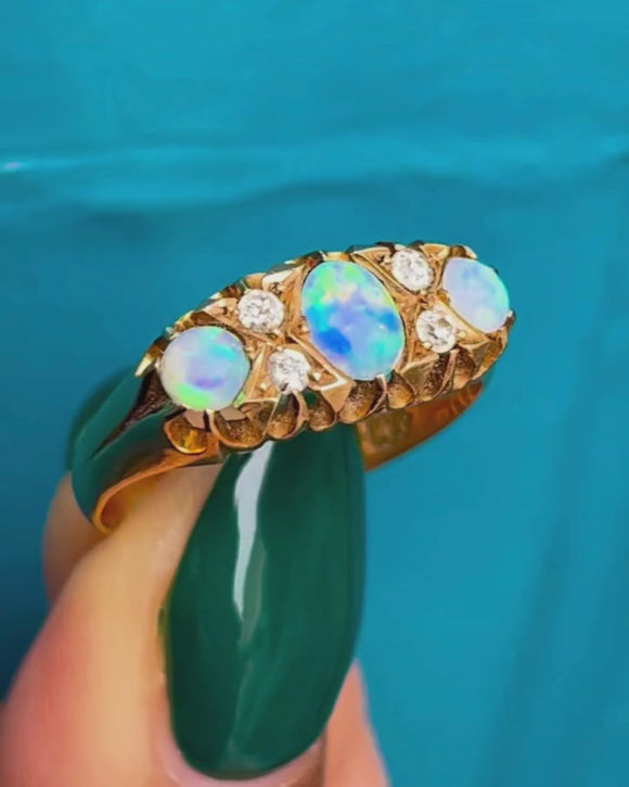 A stunning antique 18ct Gold Opal Diamond three stone ring to bring you all the right kinds of attention! Each Opal boasts glowing purples, blues, and greens, with mesmerising flashes of iridescence appearing under the light, it's as if she has been plucked from enchanted waters.