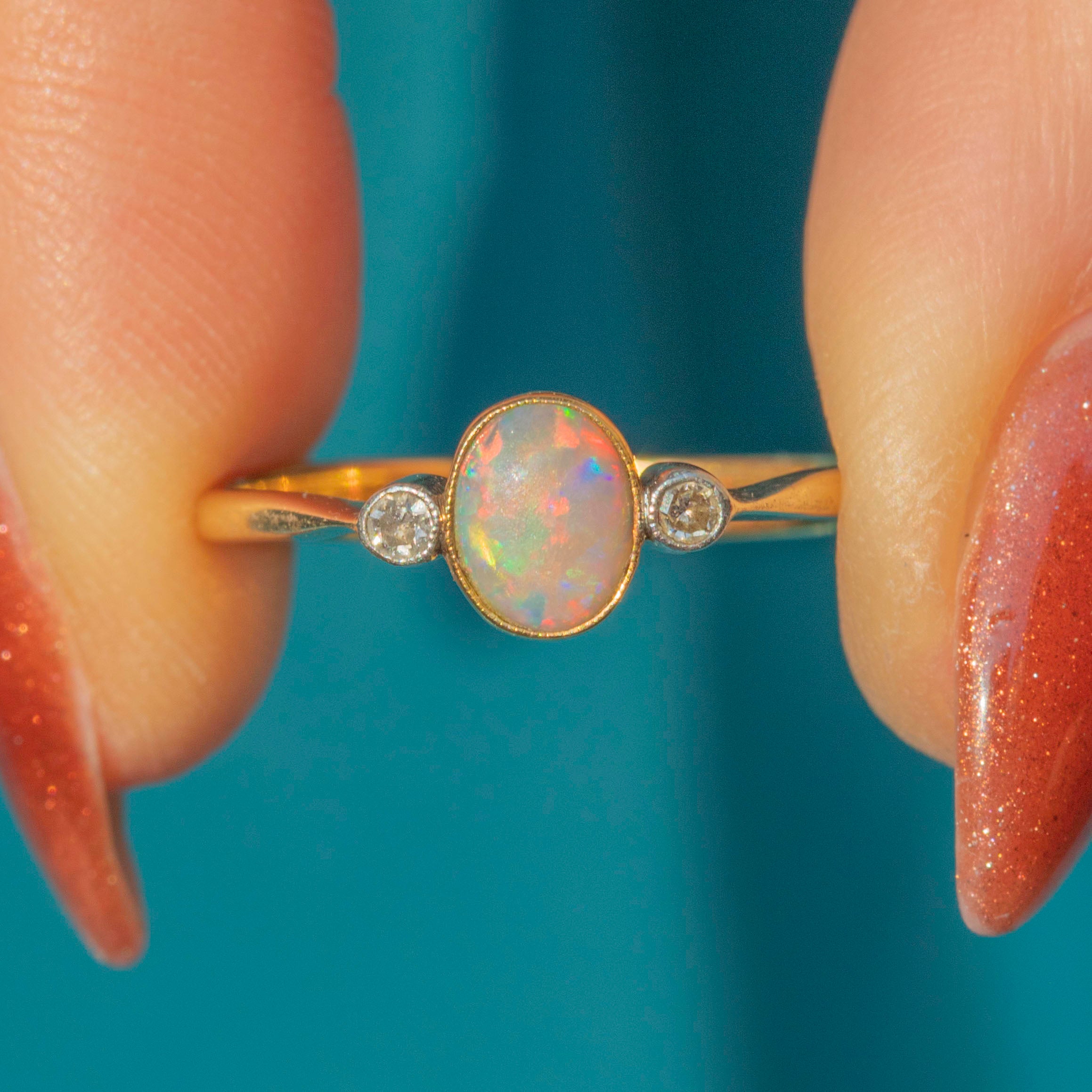 VERY GOOD: This exquisite antique 18ct Gold Opal Diamond three stone ring is in very good condition. There is some surface wear to the Opal and discolouration to the settings, however this is commensurate with age. Each gemstone is set securely within their bezels and with a secure band, you can wear her with confidence.