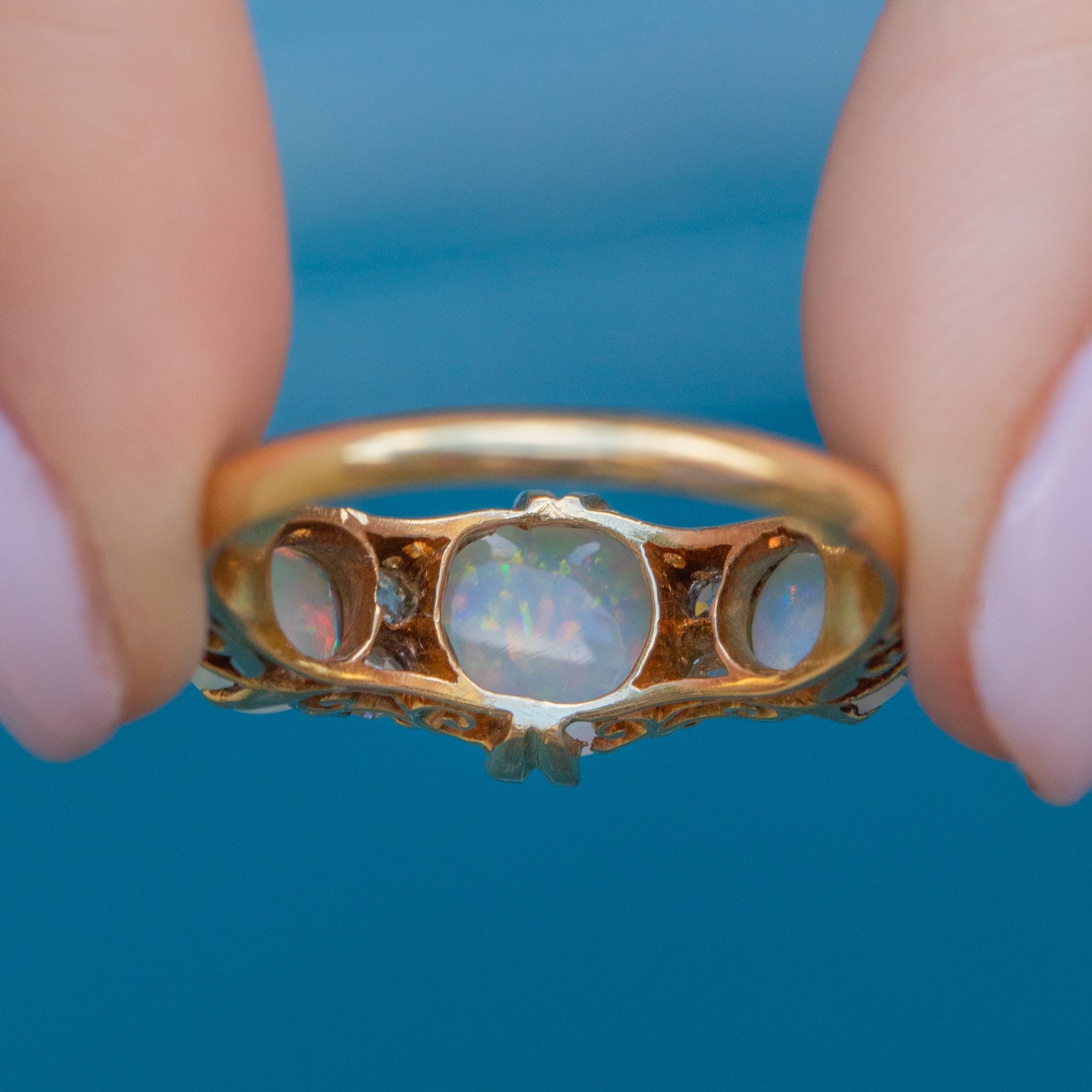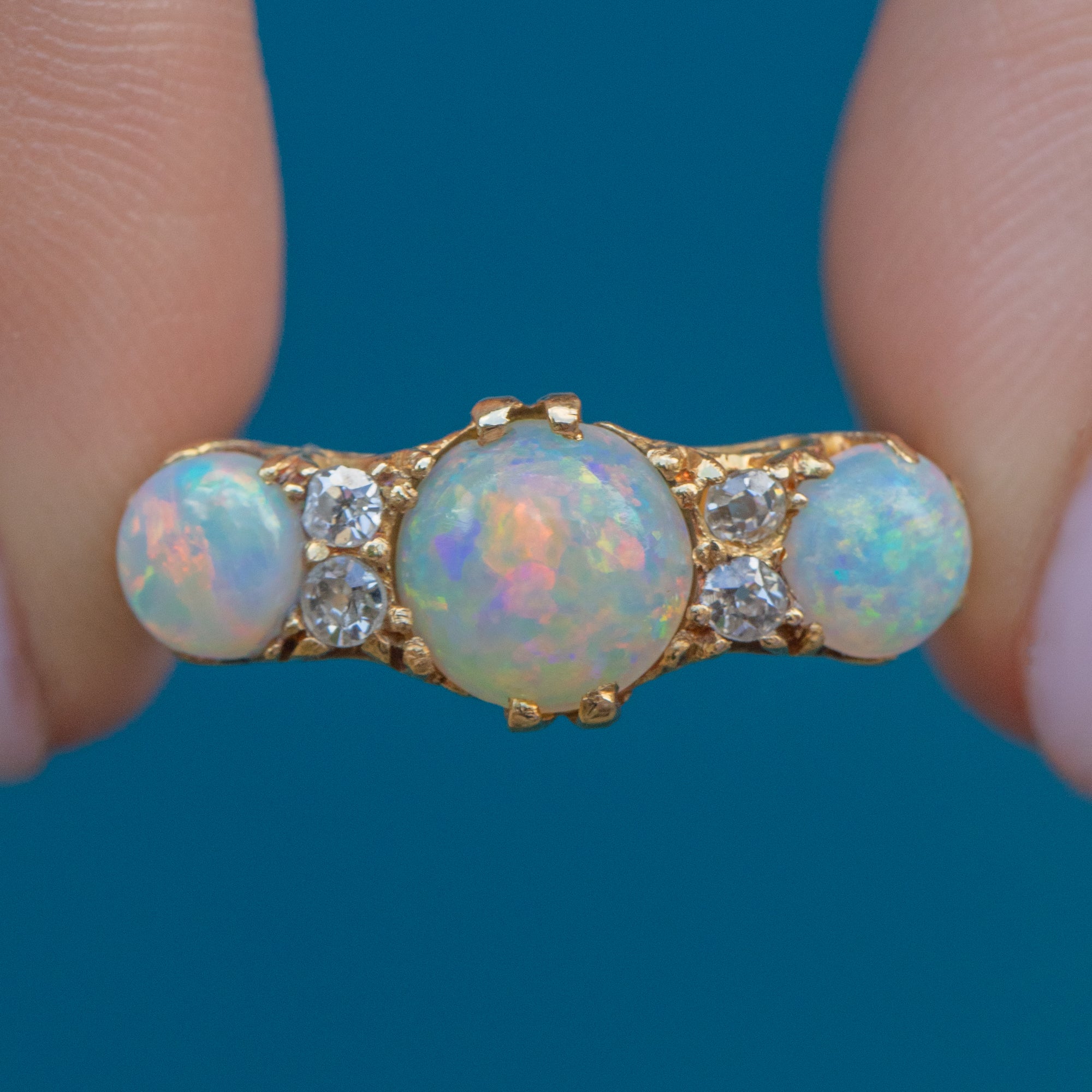 Interspersed between these opulent Opals are four twinkling Diamonds, adding that extra touch of splendour. With a buttery 18ct Gold shank, fully hallmarked to the year 1897, and a decorative raised gallery, this Victorian Opal Diamond ring gives you wonderful finger coverage. Gliding smoothly onto your finger, she is a dream come true!