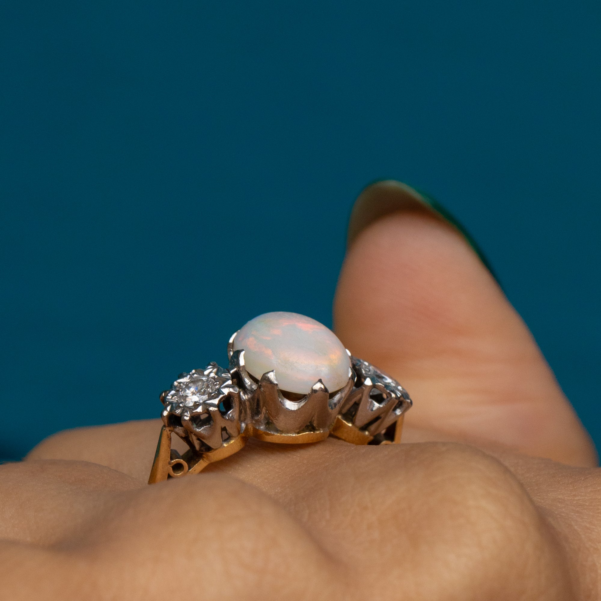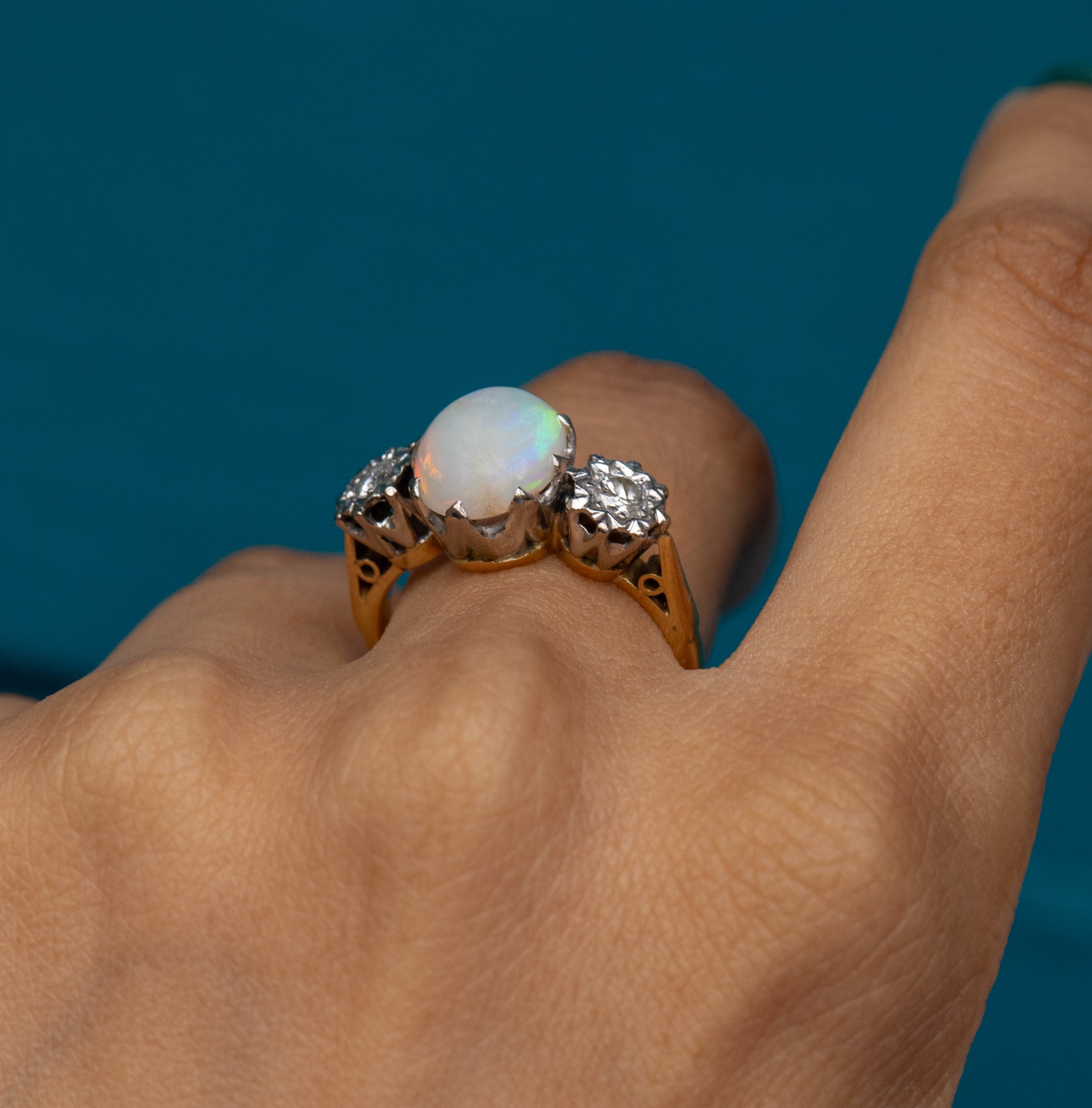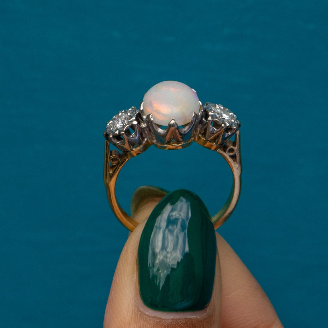 Antique 18ct Gold Opal Diamond Trilogy Ring, 1.80ct Opal