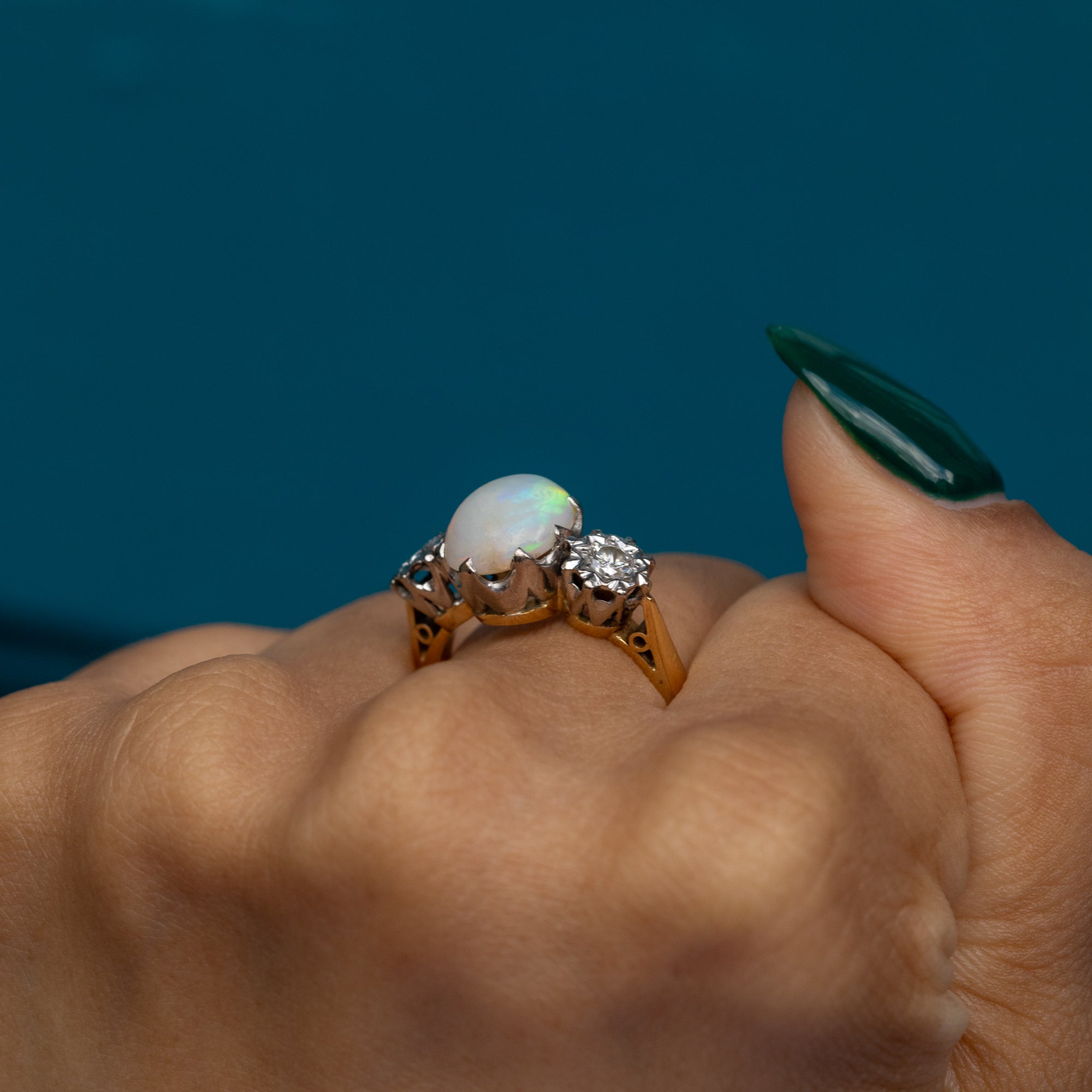 This gorgeous antique 18ct Gold Opal Diamond trilogy ring will make a wonderful addition to your collection! One of our favourite duos, this trilogy ring boasts a 1.80ct Opal nestled between two illusion-set Diamonds to create a gorgeous three-stone profile.