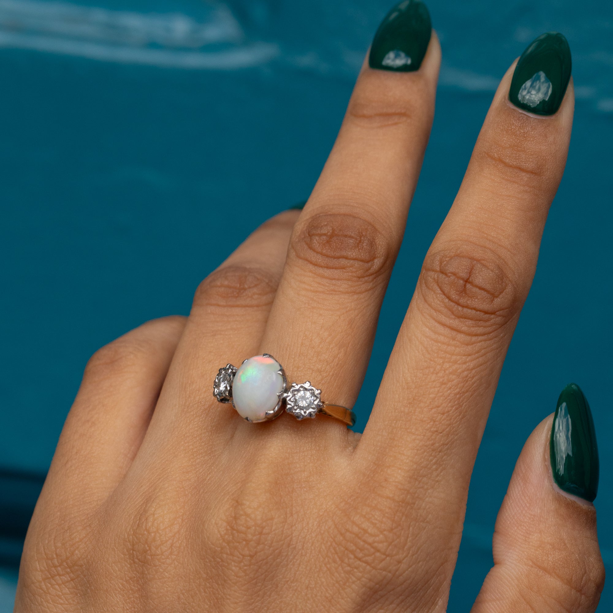 EXCELLENT. This antique 18ct Gold Opal Diamond trilogy ring is in excellent condition. The Opal is securely set and free from chips, it has accrued a slight brushed finish from being worn over the years, but the colours remain bright and punchy! The Diamonds are securely displayed within white Gold illusion settings and free from fleabites or abrasions. The ring band is robust and ready to be worn and adored straight from the box!