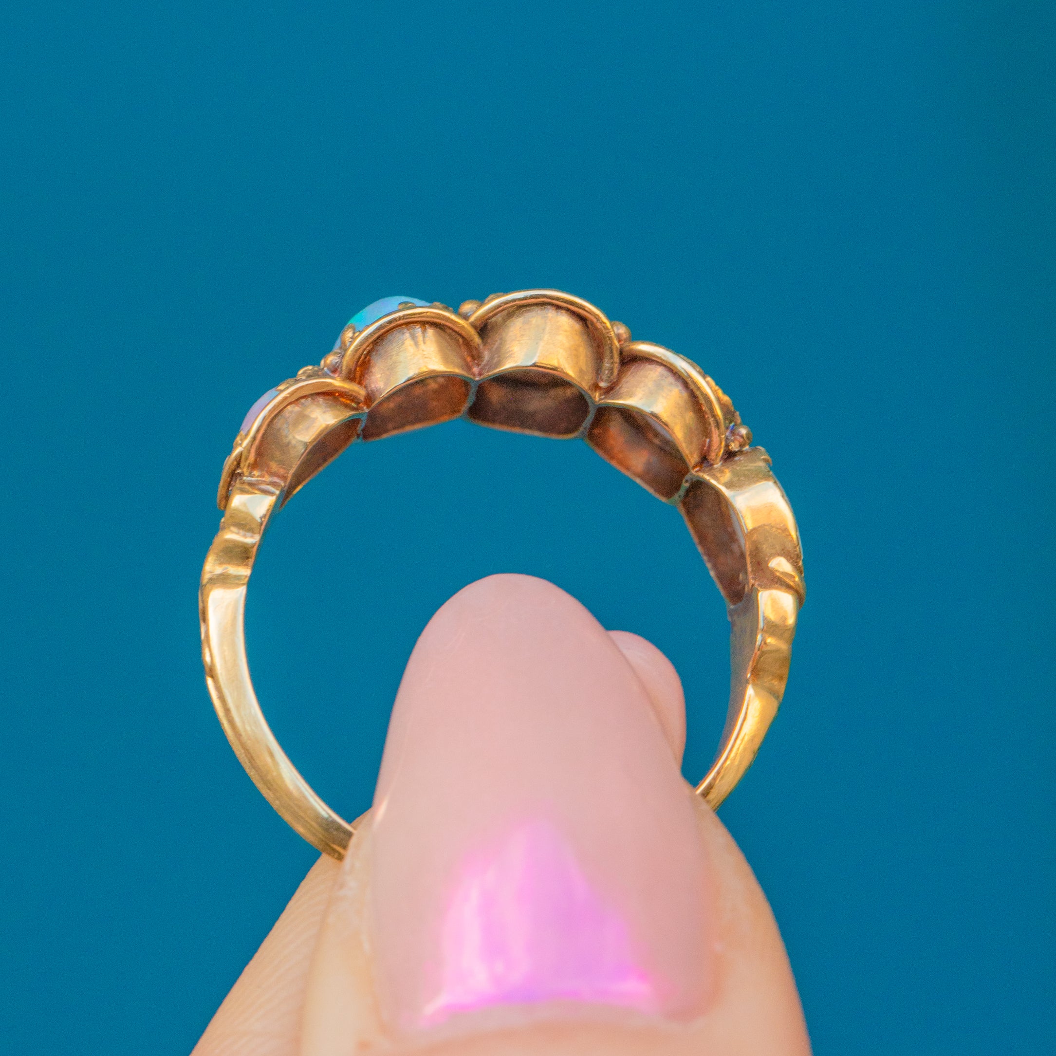 This jaw-dropping antique 18ct Gold Opal five stone ring will bring you all the right kind of attention! Crafted from luxurious sunshine-yellow 18ct Gold, she encases five luminous Opal cabochons, each with a galactic milky hue, fit for a space princess!