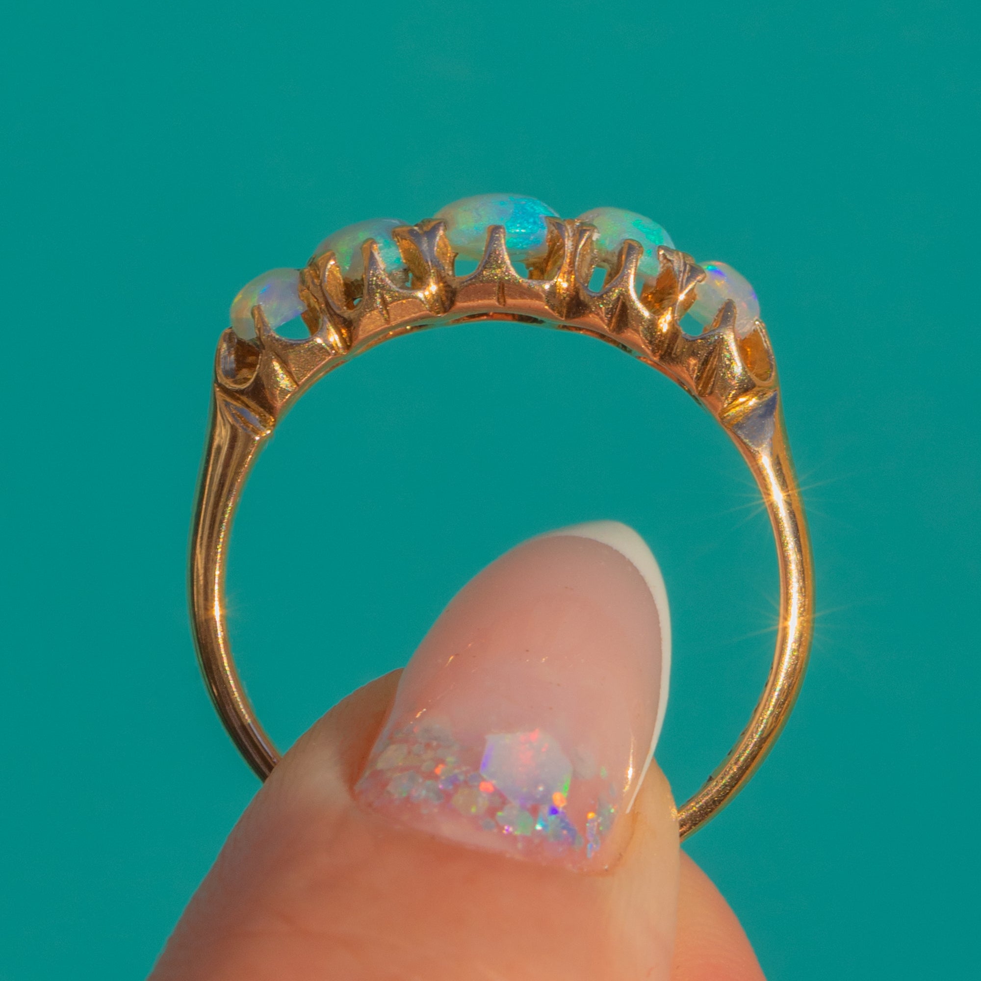 This Edwardian five stone Opal ring is a beautifully romantic piece, set with glowing natural solid Opals in a classic carved 18ct Gold gallery. The graduating Opals shimmer with soft flashes of colour, creating a lovely, fluid line of light across the finger.