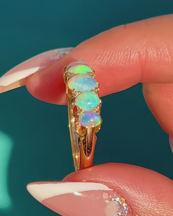 EXCELLENT: The Opals are securely set and in excellent condition with no chips, cracks or noticeable surface wear. The 18ct Gold band and carved gallery are crisp with only minimal light wear in line with age. This ring has clearly been well cared for.