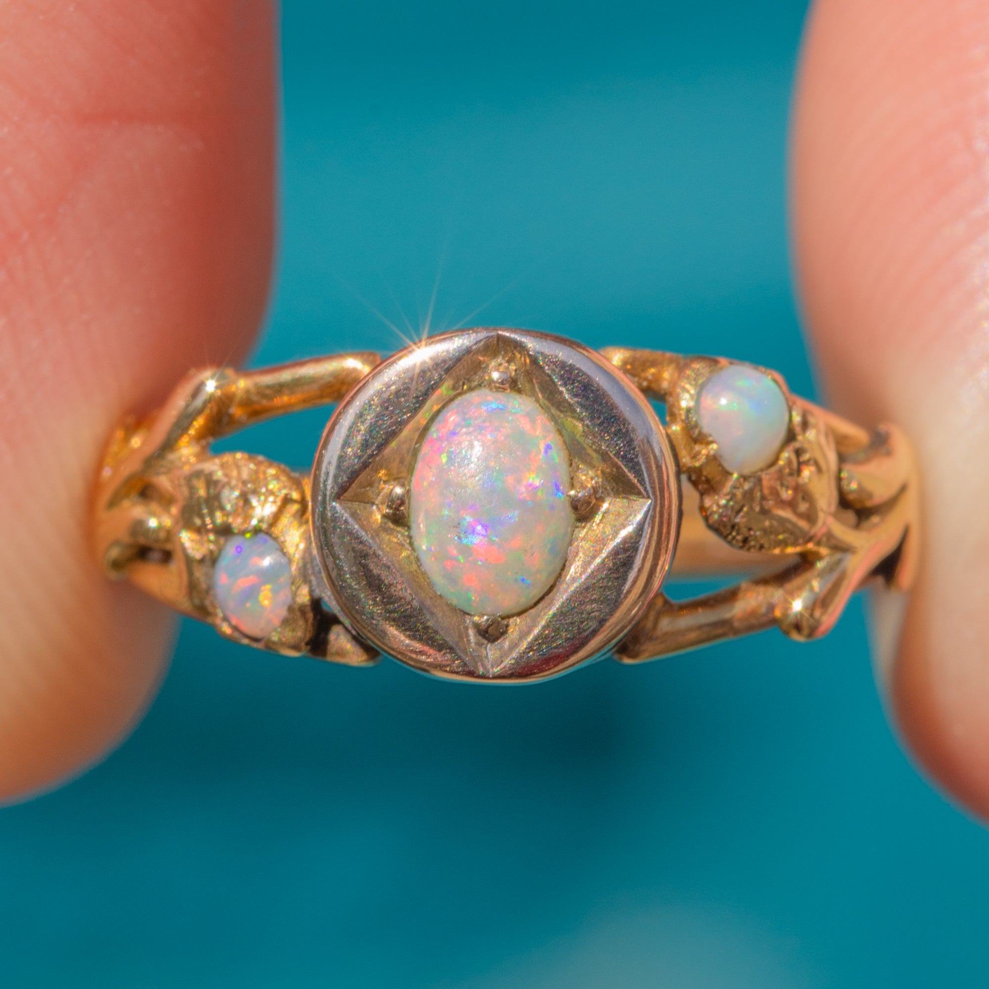 VERY GOOD: This antique 18ct Gold Opal ring is in very good condition. Each Opal has a lovely pastel hue and is secure within its setting. Her Gold is glossy, though there are some notable signs of discolouration to the settings, particularly inside the ring, though this cannot be seen when wearing. A lovely piece, this Victorian three stone ring is a must have!