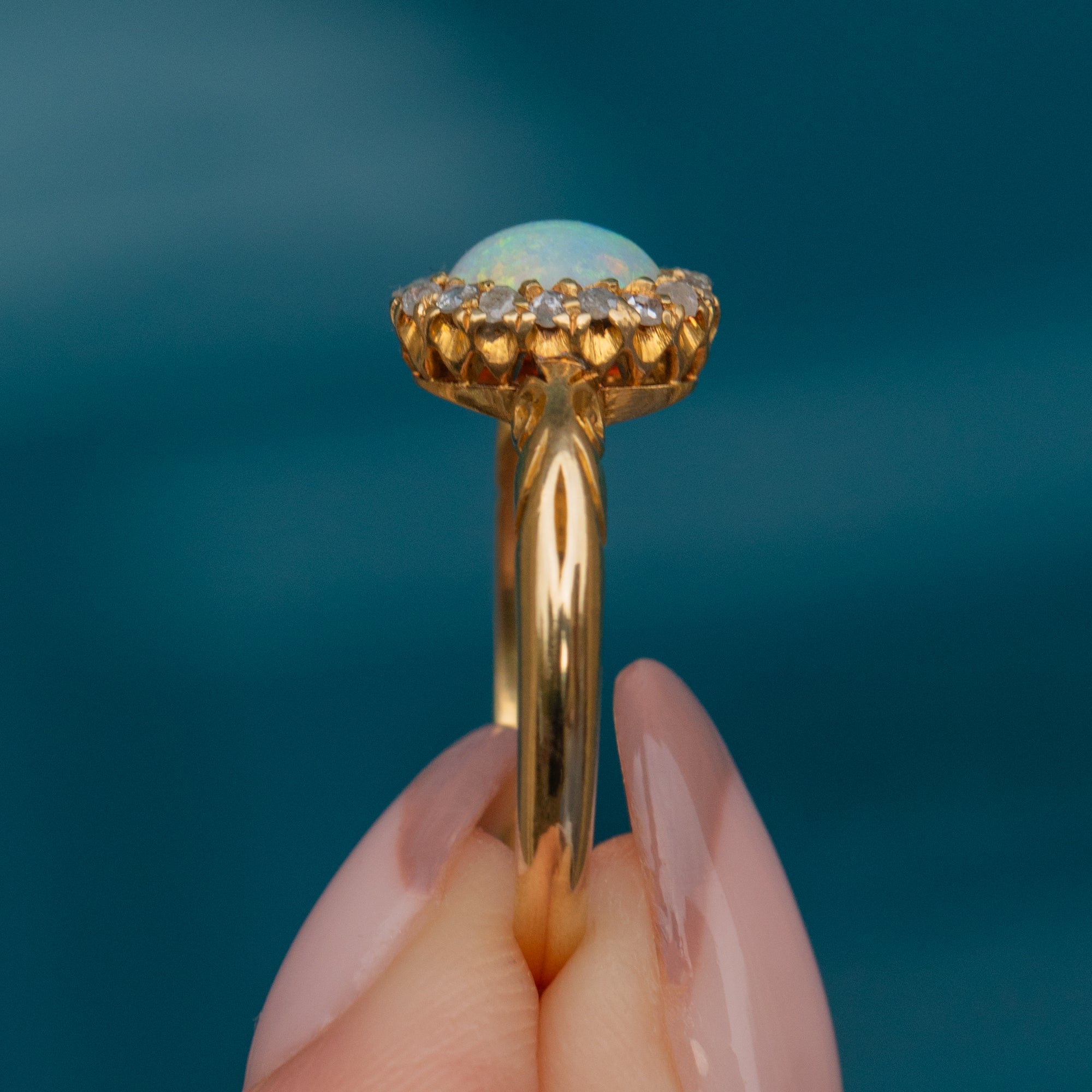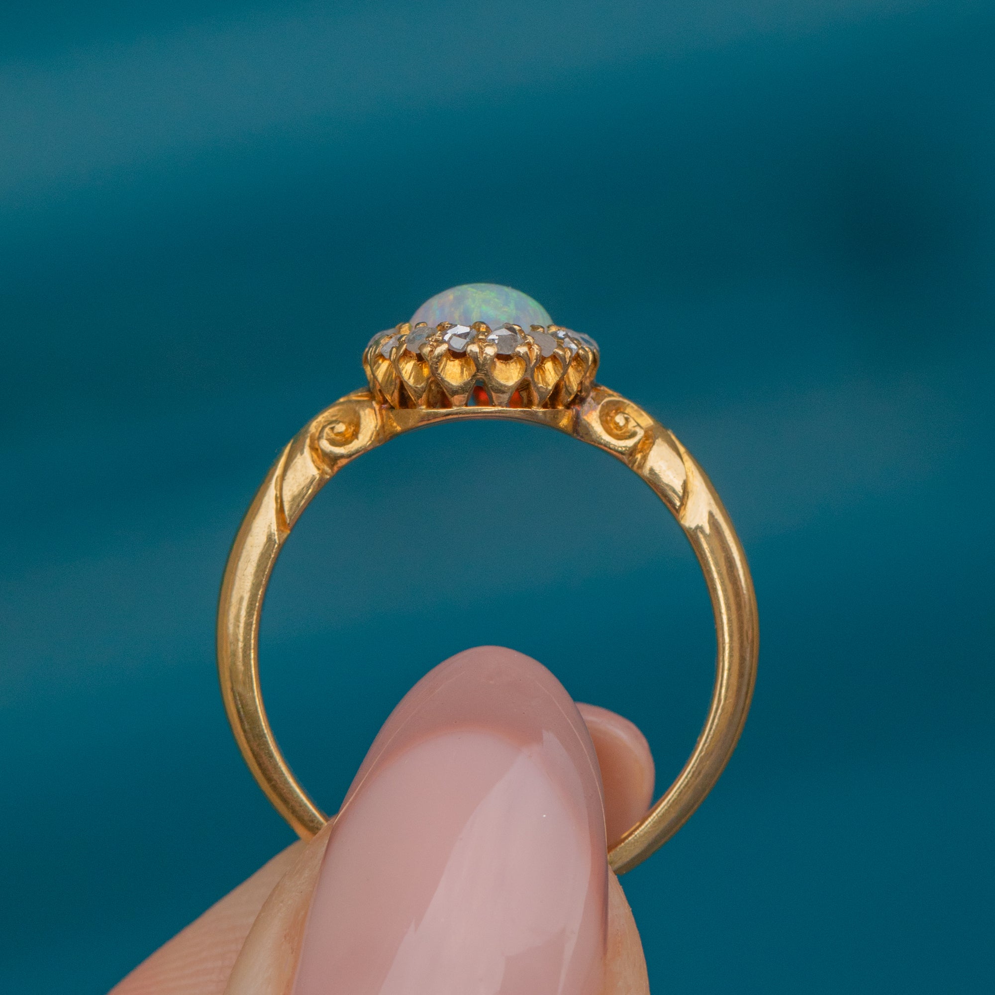 VERY GOOD. This antique 18ct Gold Opal rose-cut Diamond cluster ring is in very good condition. The Opal is smoothly domed and free from chips or scuffs and the Diamonds are all present and offer a subtle sparkling accent. There is a resize mark on the back of the band which is a slightly different shade of Gold and slight porosity visible, but this isn't visible while the ring is worn and doesn't impact the integrity of the piece. The Gold is otherwise saturated and the engraved details have remained crisp, and each gemstone is held securely within its setting. With a full set of hallmarks still legible inside the band, this Edwardian Opal Diamond ring will make a charming addition to your collection!