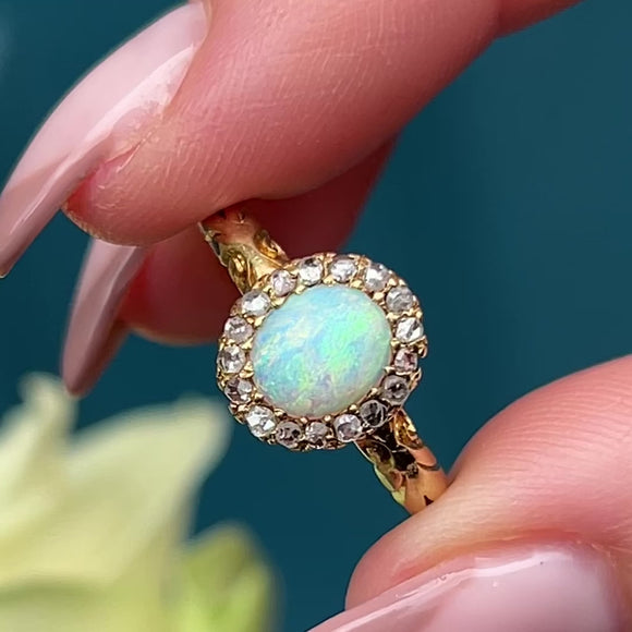 Antique 18ct Gold Opal Rose-Cut Diamond Cluster Ring c.1900