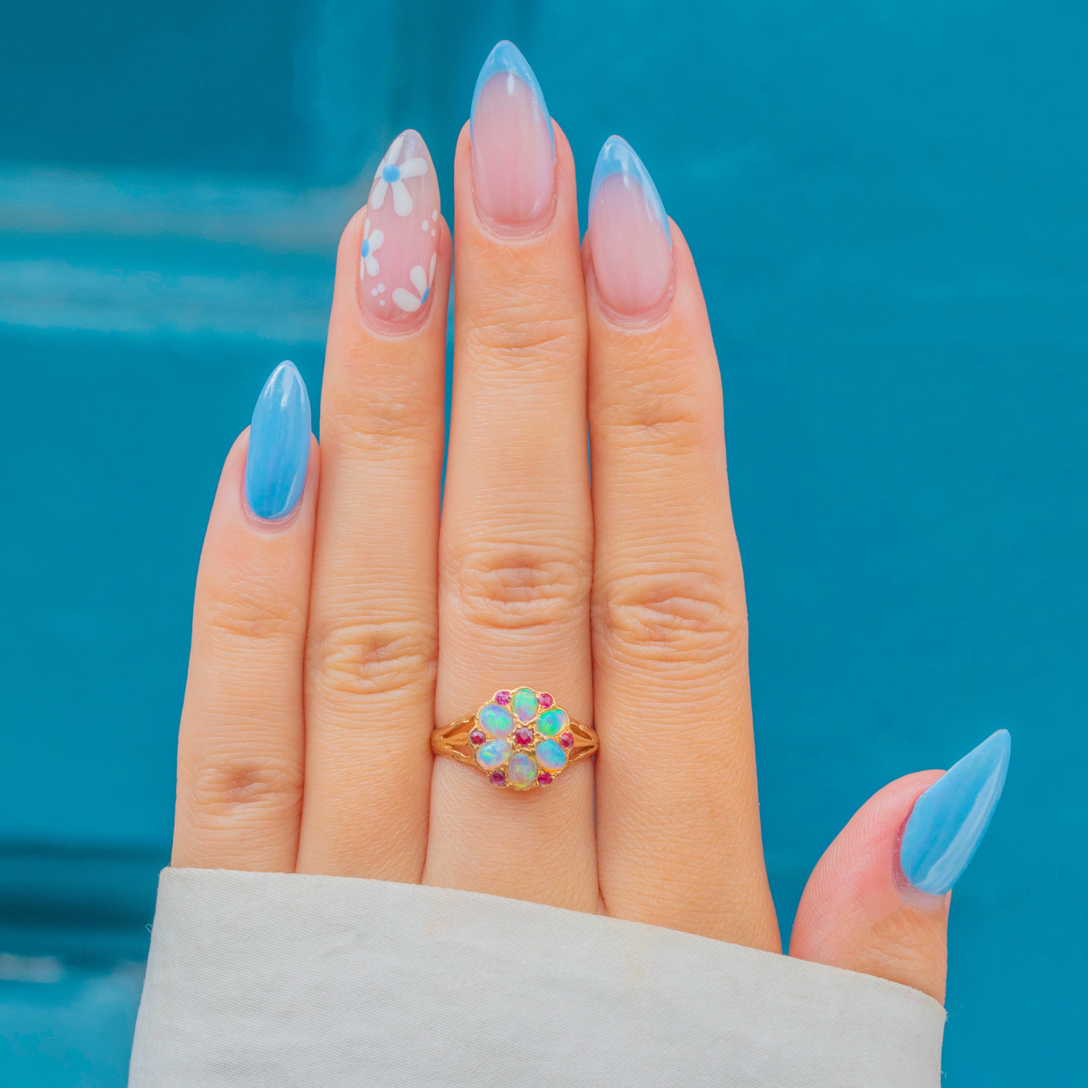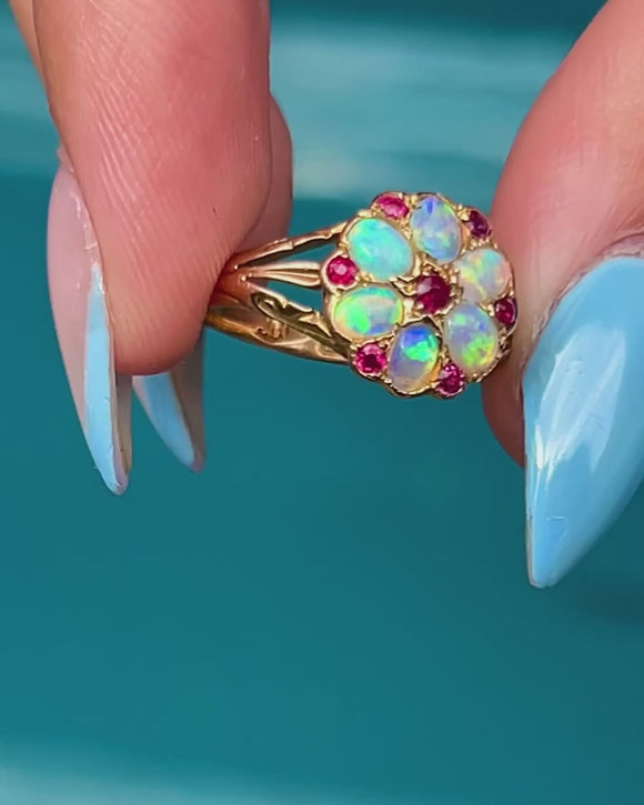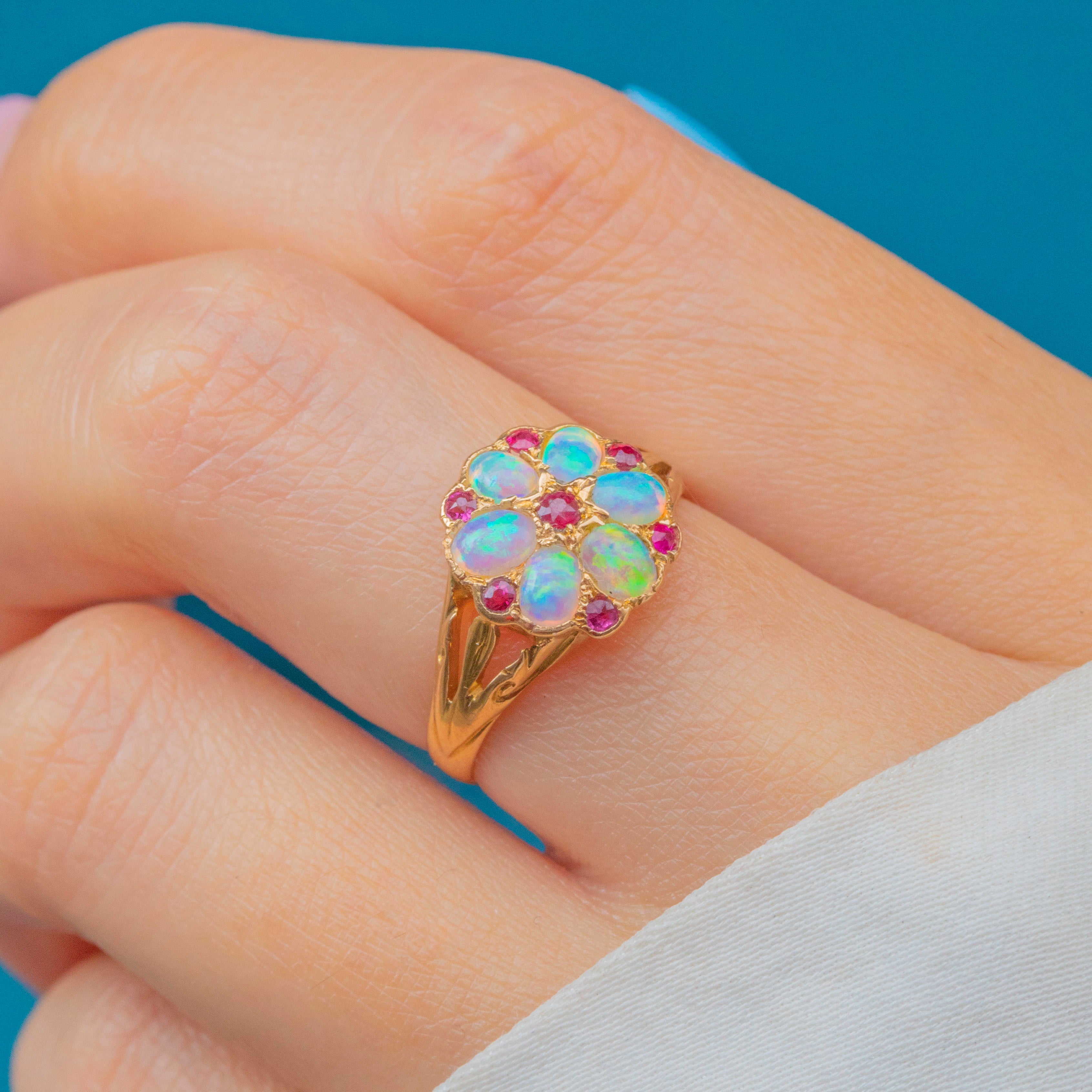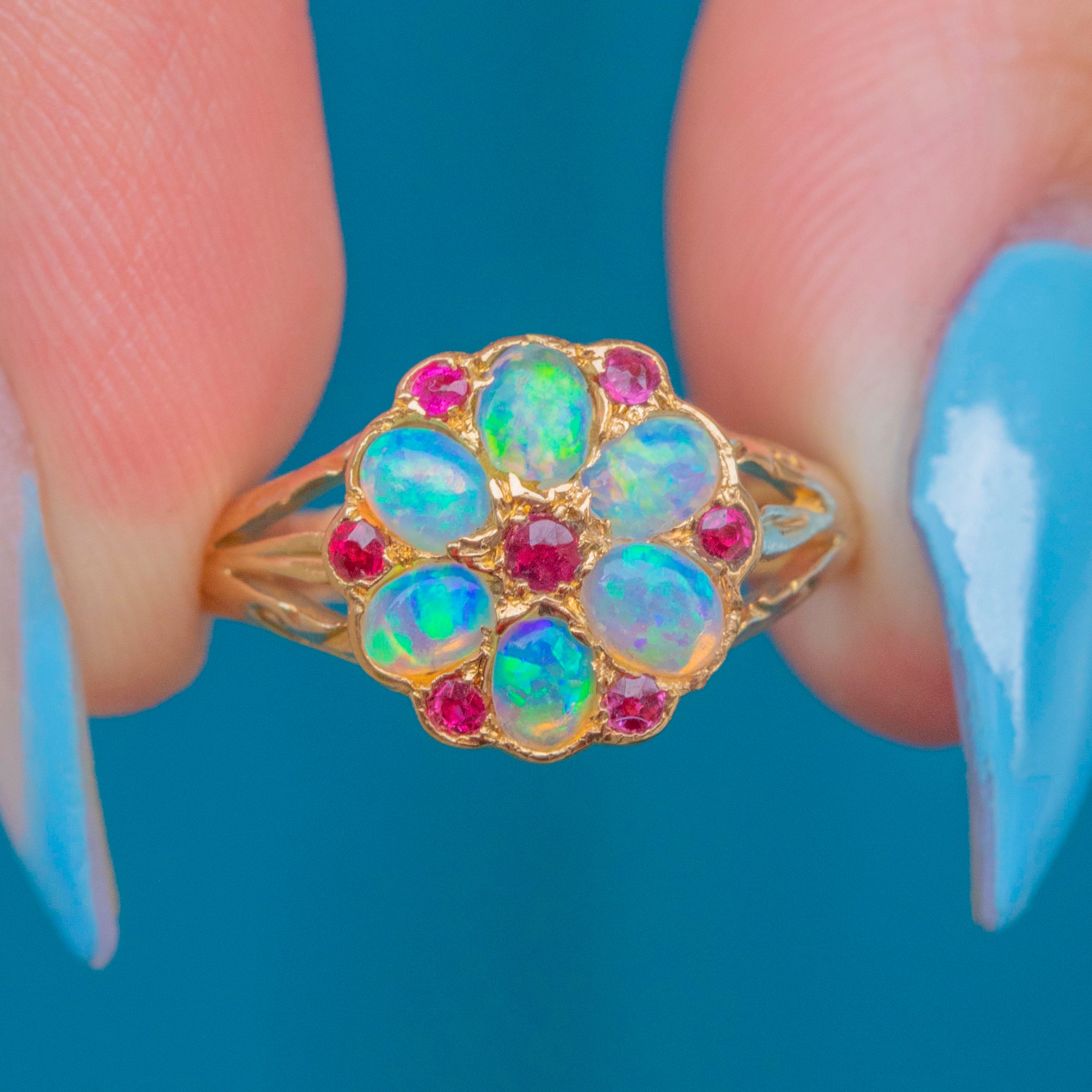 This lively antique ring is crafted from solid 18ct Gold and has a spectacular display of vibrant Opals and fuchsia Rubies arranged into a charming flower cluster. Each Opal cabochon shimmers with ethereal blues and grees, with specks of orange and pink revealed as they move in the light.