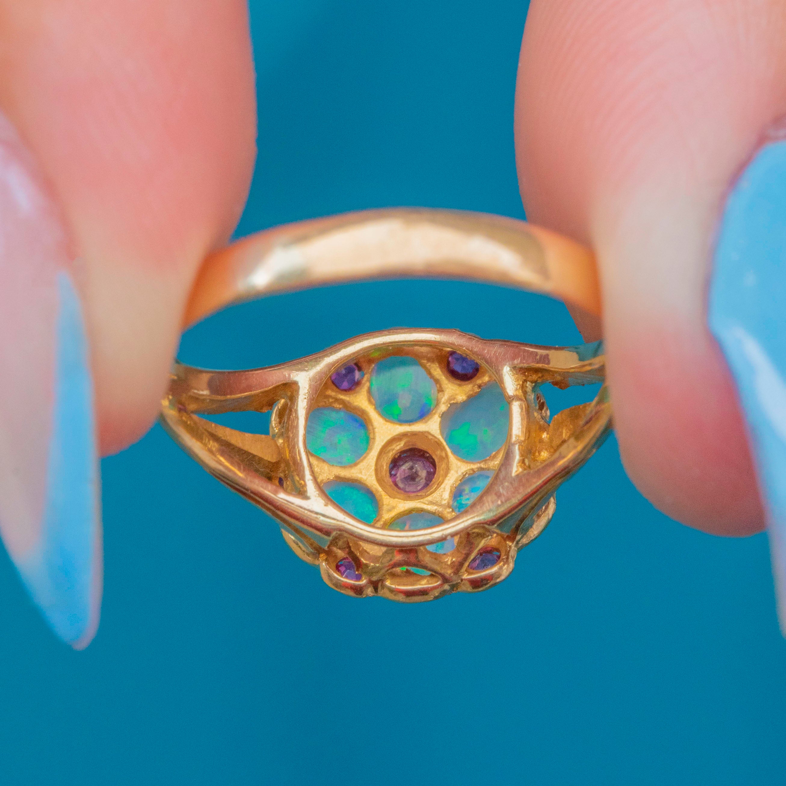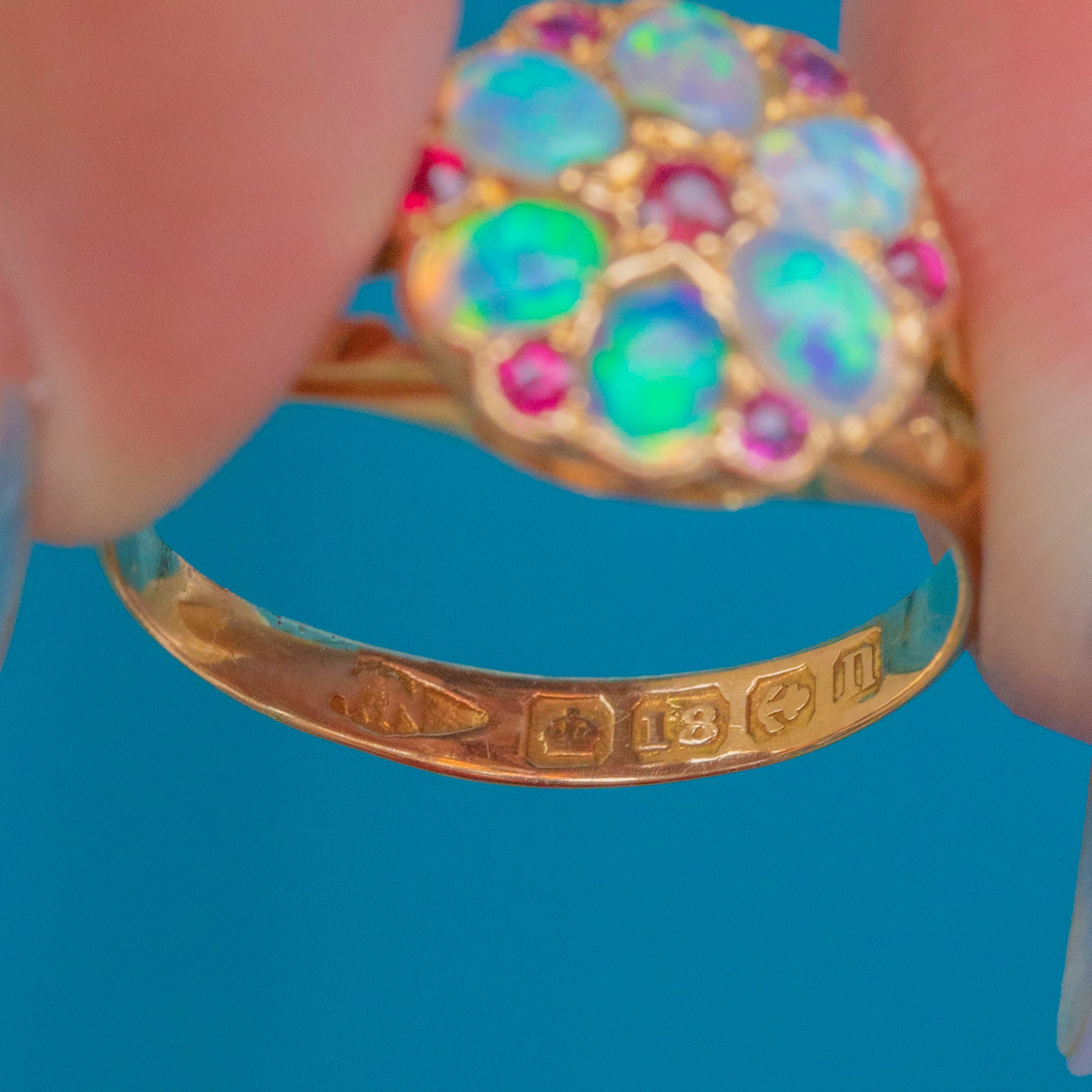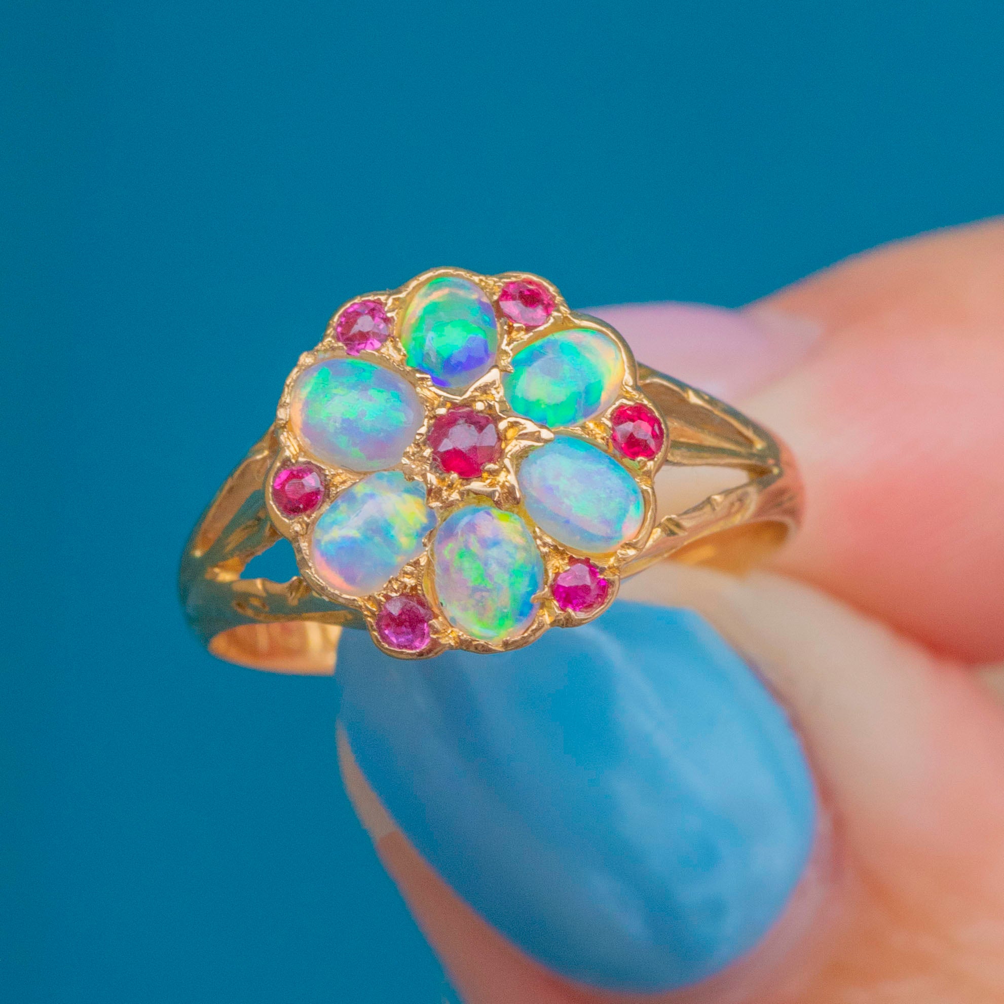 This lively antique ring is crafted from solid 18ct Gold and has a spectacular display of vibrant Opals and fuchsia Rubies arranged into a charming flower cluster. Each Opal cabochon shimmers with ethereal blues and grees, with specks of orange and pink revealed as they move in the light.