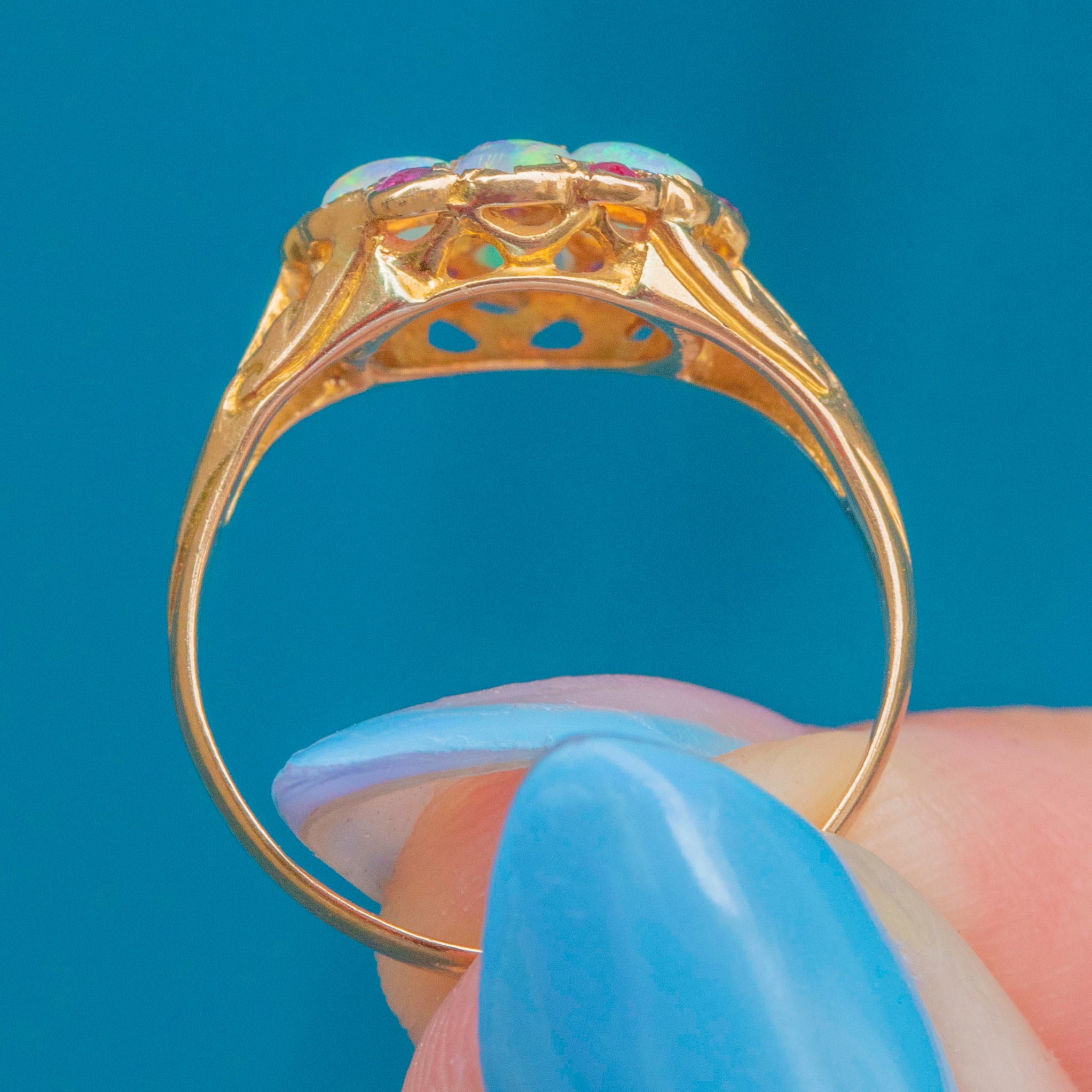 EXCELLENT: The Gold is brightly saturated with a high-shine finish, and the detailed shoulders remain defined. The gemstones are all present and have been wonderfully preserved, with only one tiny fleabite on the edge of one of the Rubies noticeable under close inspection. The chunky antique hallmarks are easily legible, allowing us to accurately date this antique Opal Ruby ring to 1912!