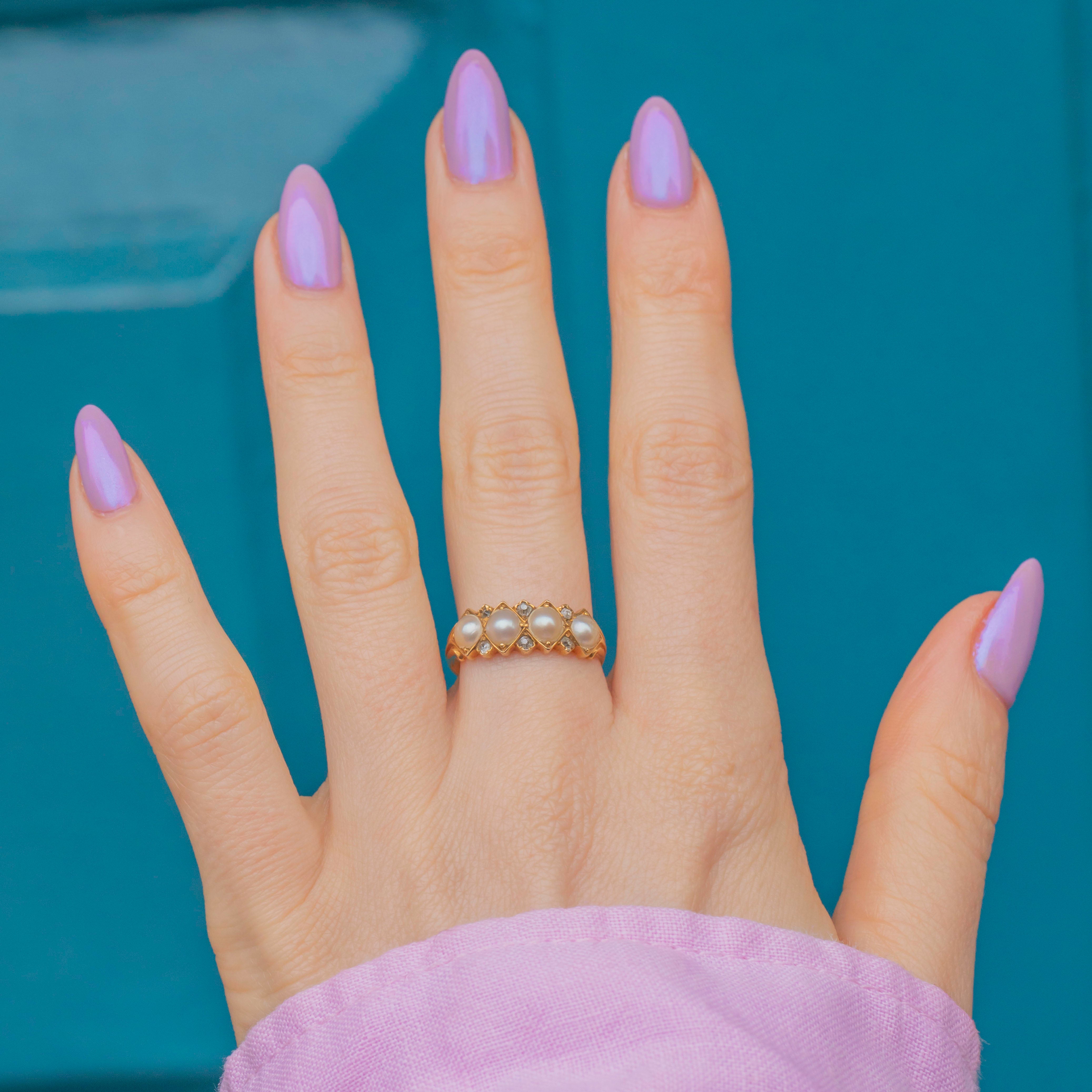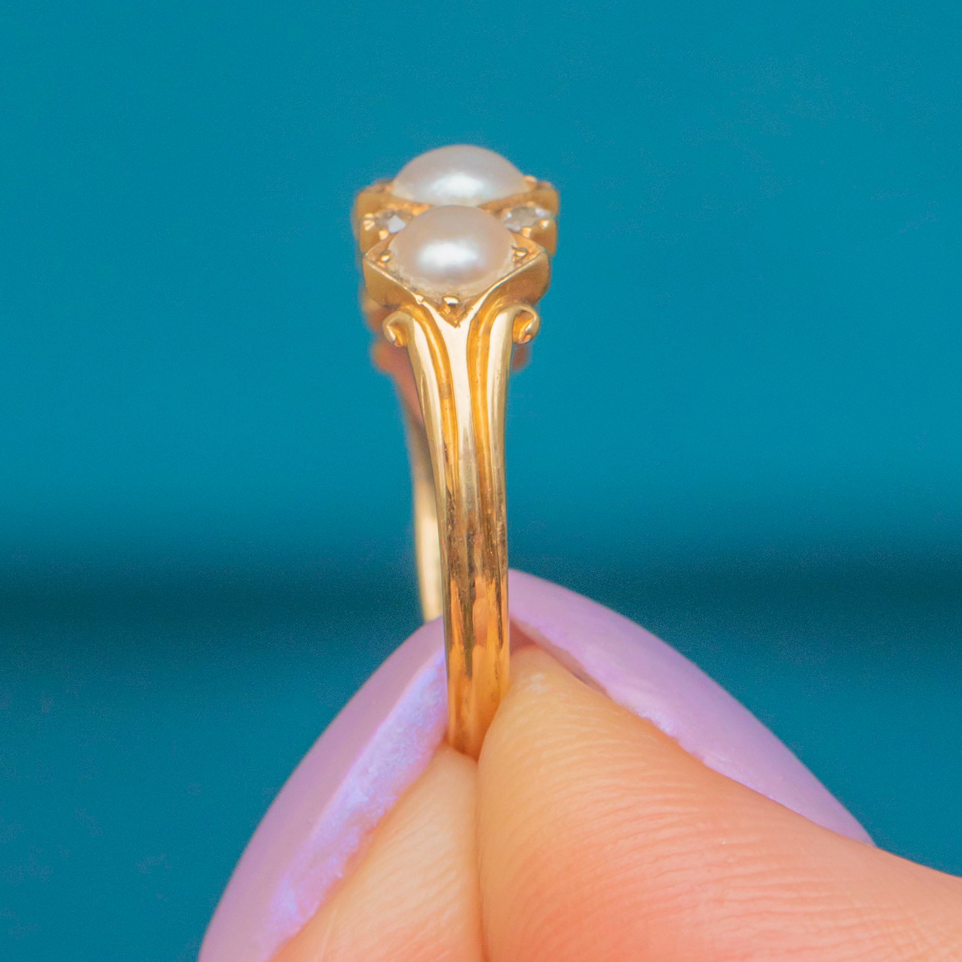 Between each pearl, two delicate rose-cut diamonds add a subtle yet enchanting sparkle. Crafted from high-quality 18ct gold, the ring boasts elegant, scrolling settings that enhance its feminine charm.