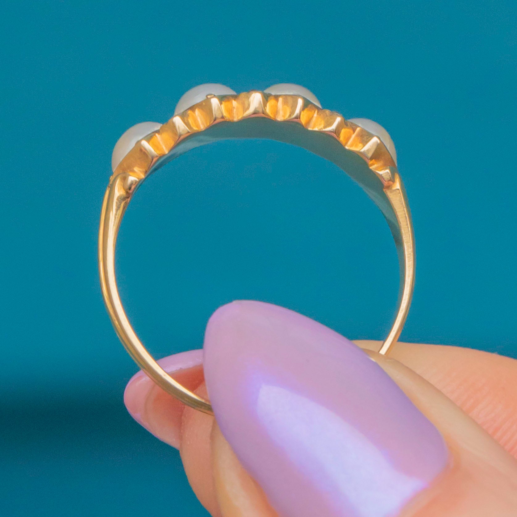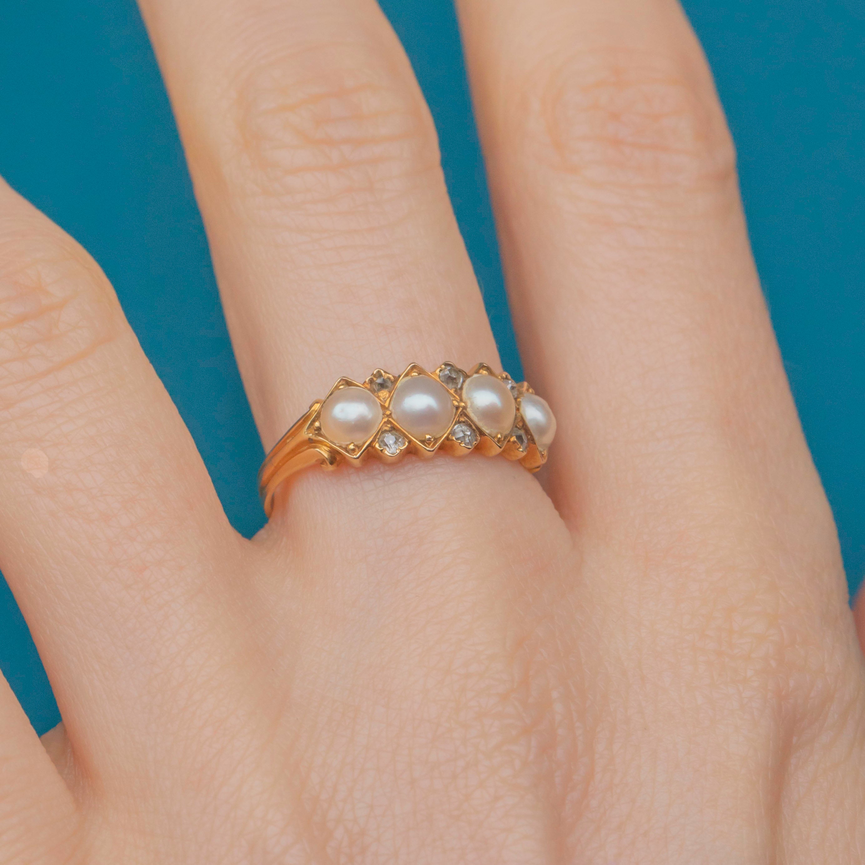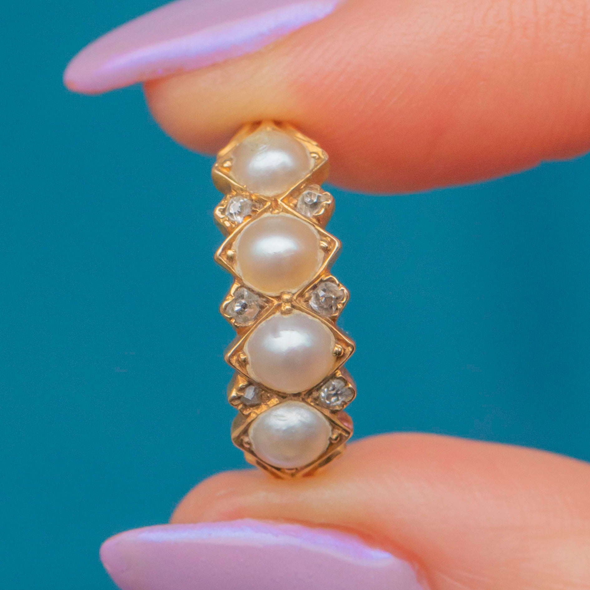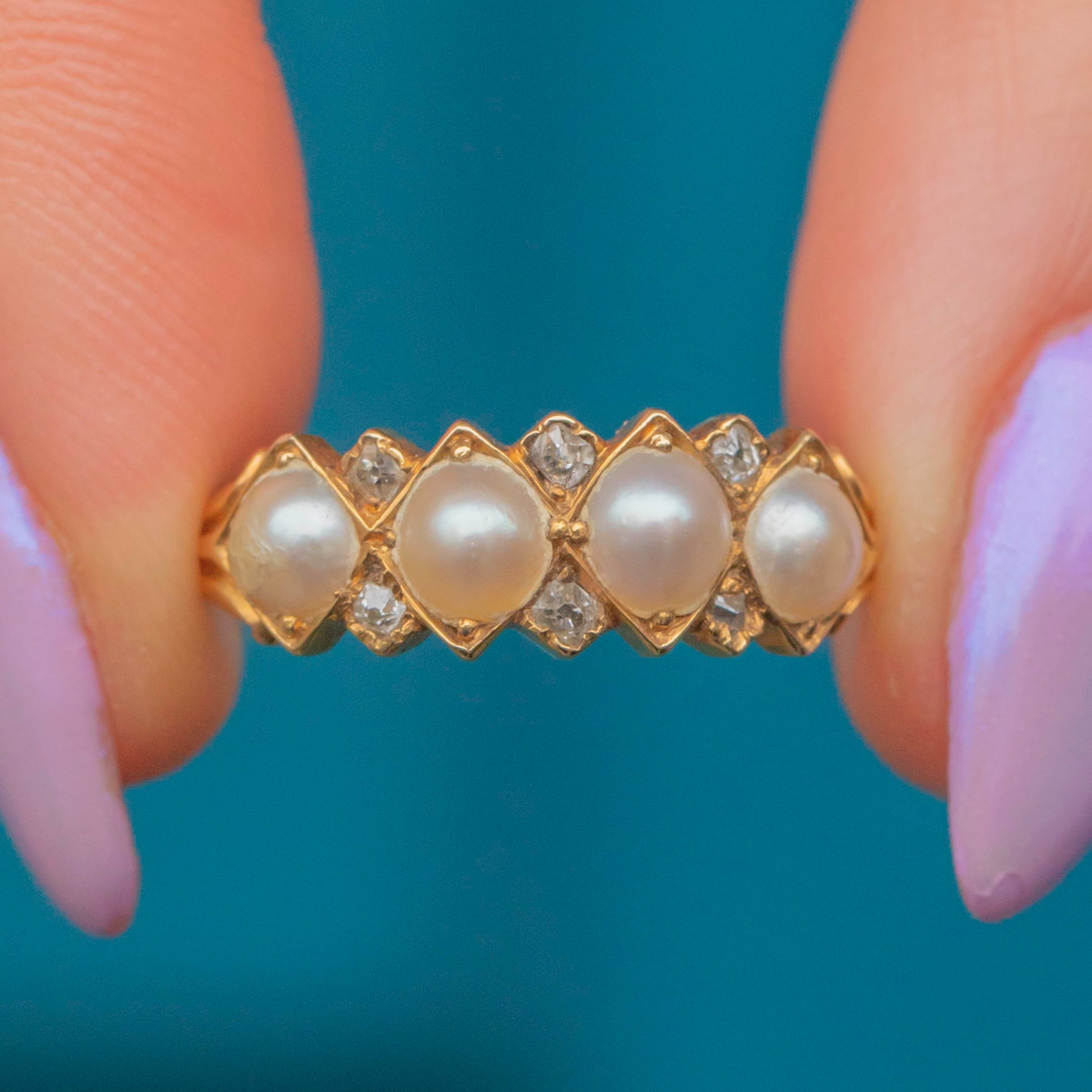 This exquisite antique 18ct Gold Pearl and Diamond half hoop ring is a true treasure! A stunning example of Victorian craftsmanship, she features four gracefully graduating pearls with a silky, lustrous finish.