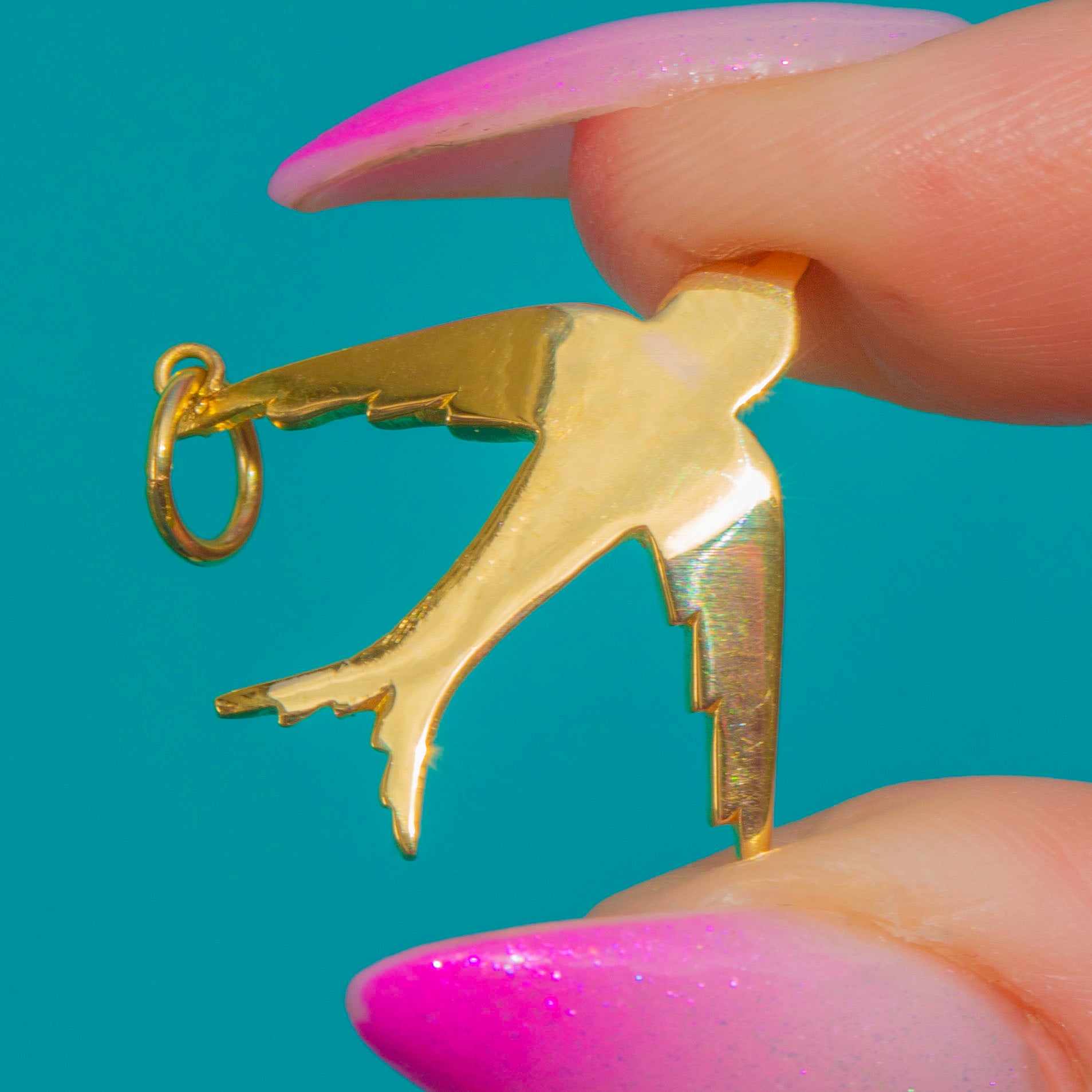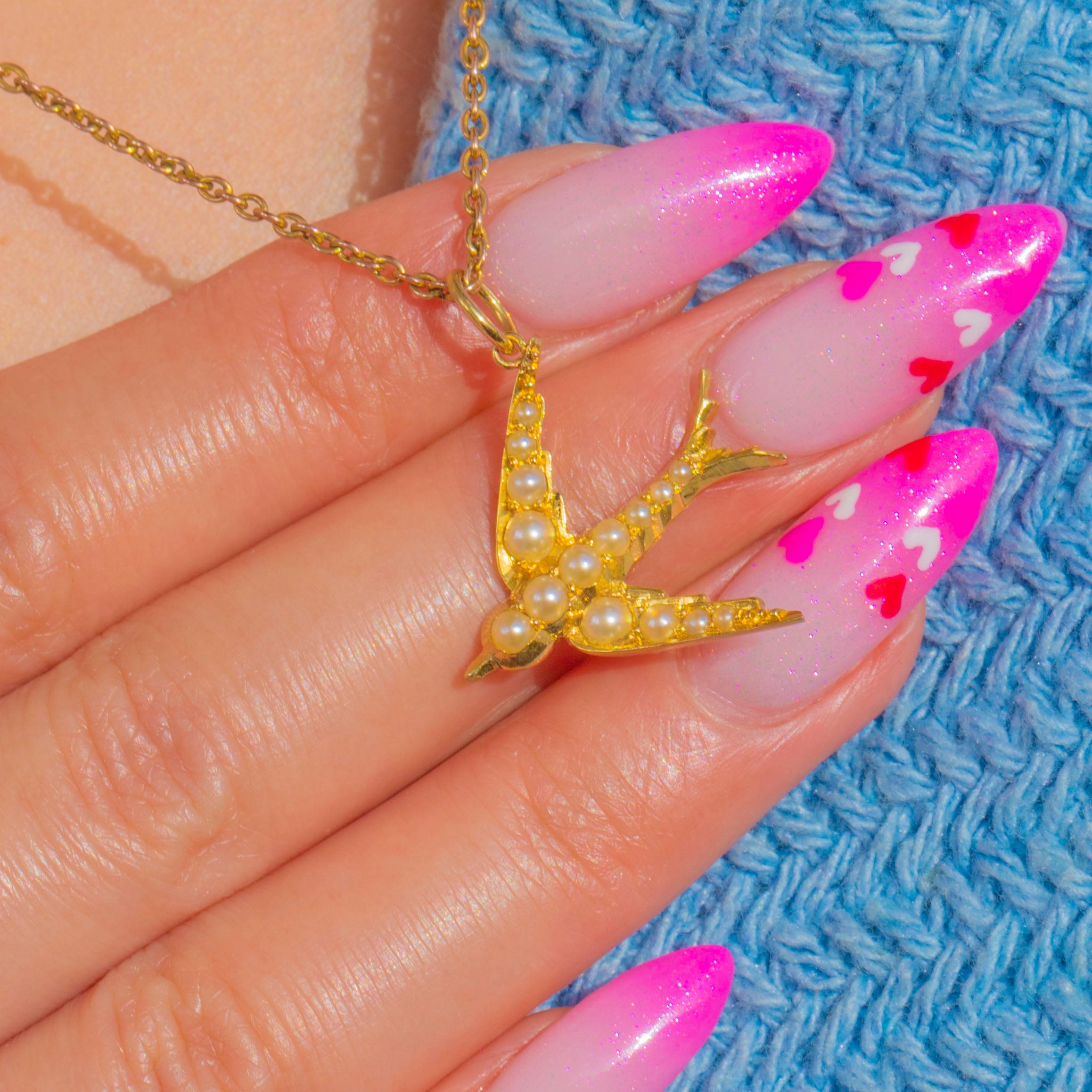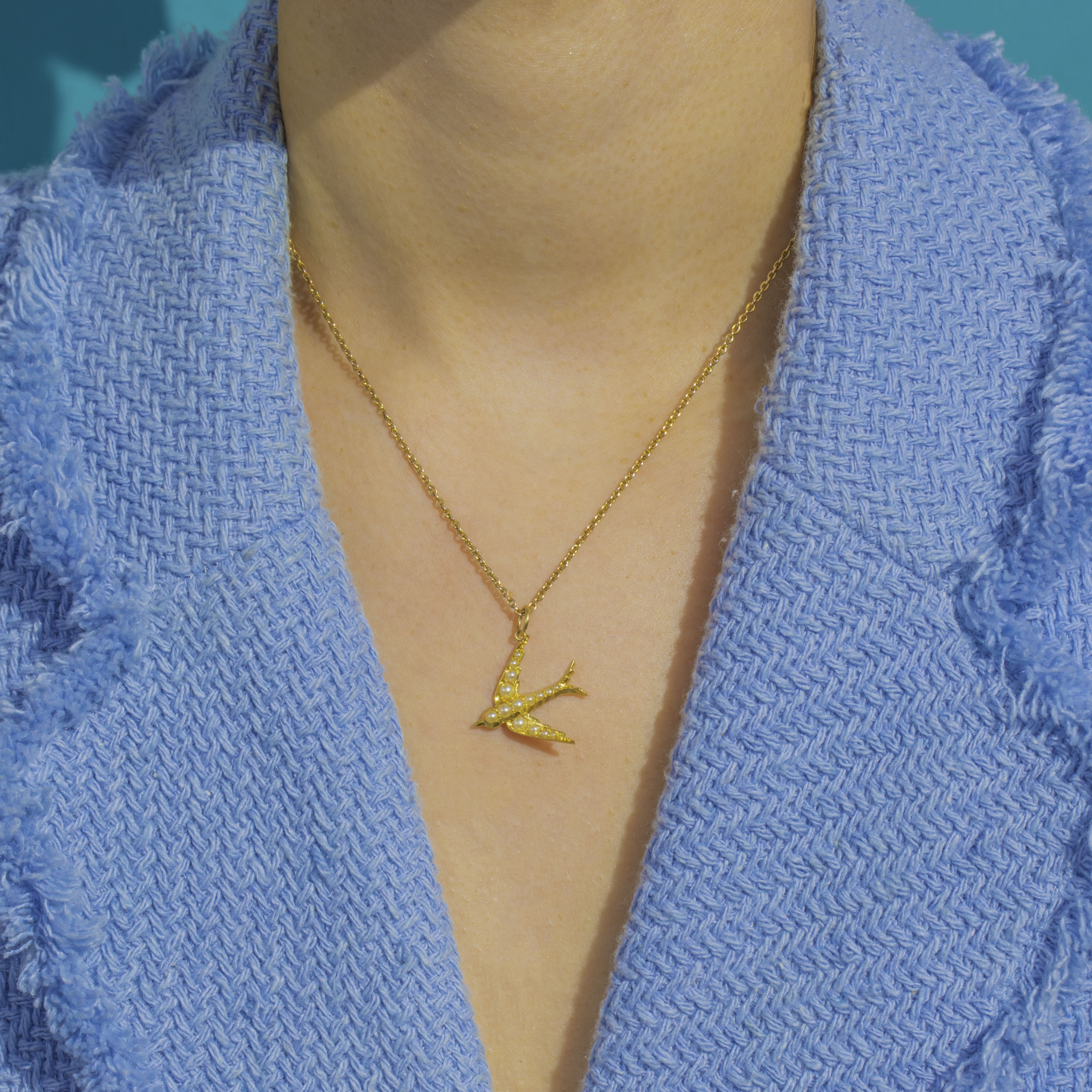 The body and wings are studded with graduating Pearls that glimmer gently against the warm glow of high-carat Gold, with crisp detailing to the tail and wings for a refined finish. Petite and poetic, it suspends from a simple jump ring—perfect to style on your favourite chain for everyday elegance or to layer for a delicate, antique touch.