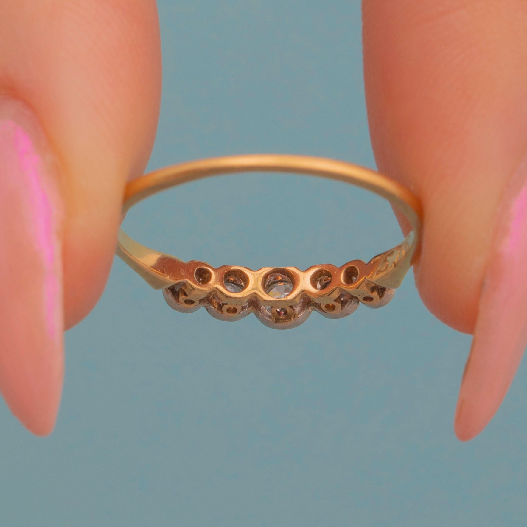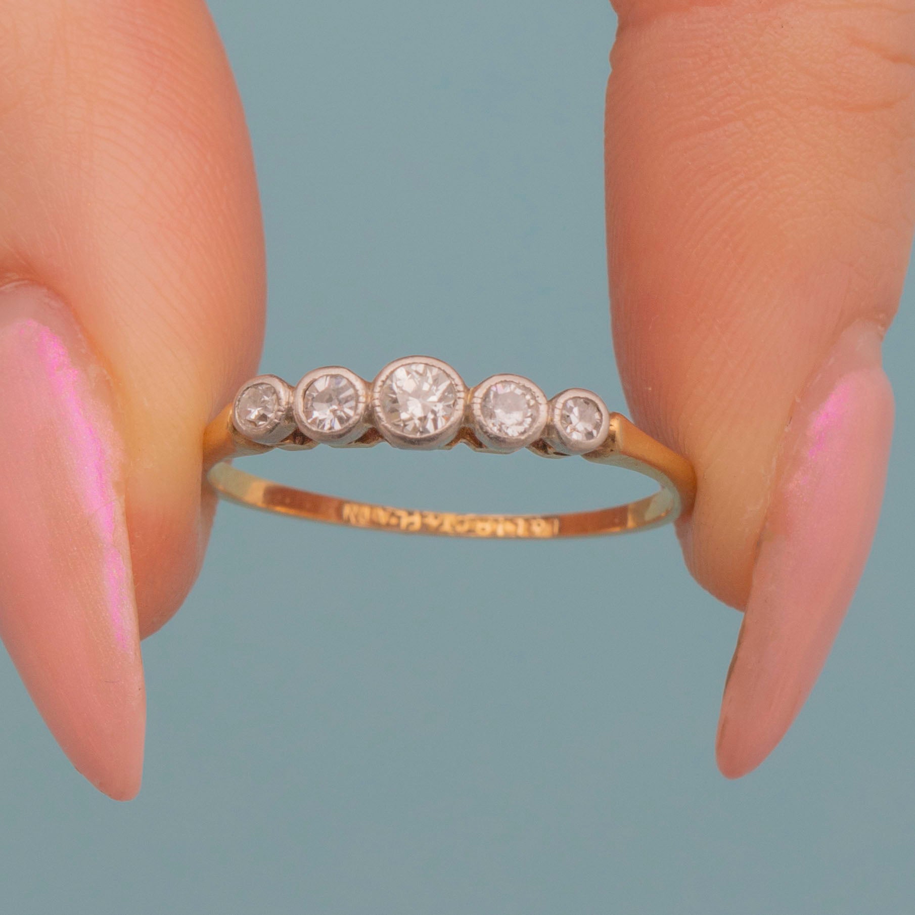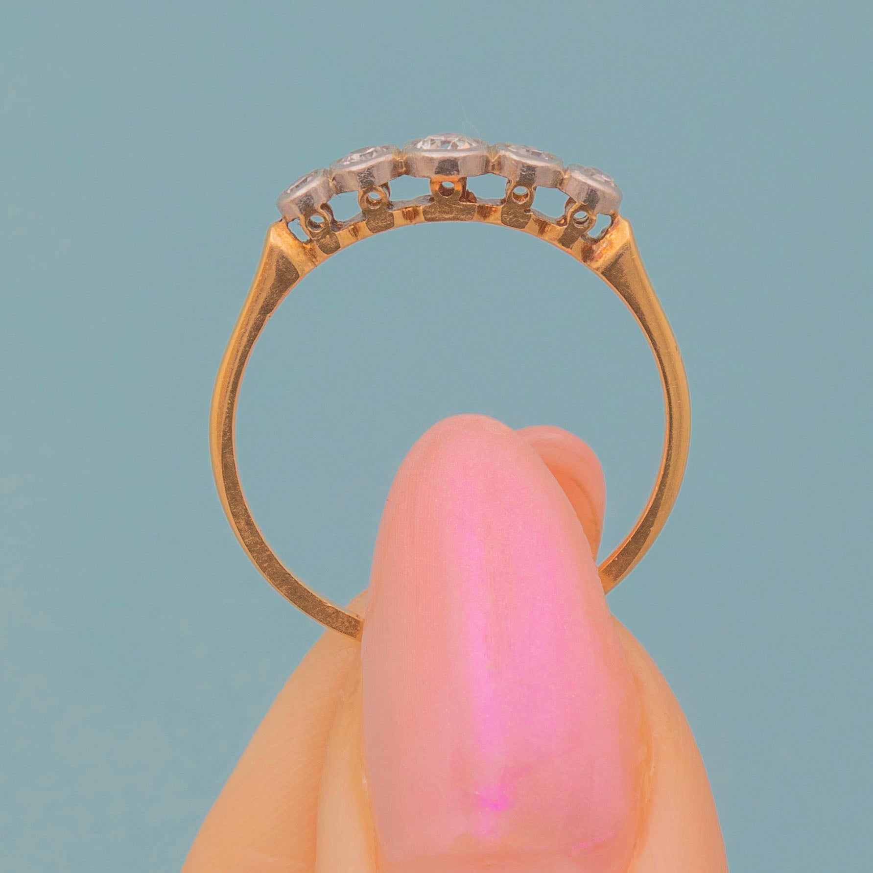 EXCELLENT. This antique 18ct Gold & Platinum Diamond five stone ring in wonderful condition. Her five bezel-set Diamonds are secure, and their facets have no chips or abrasions to note. The settings have some minor wear, however it is evident she has been incredibly well looked after over the past century. She's a dream!