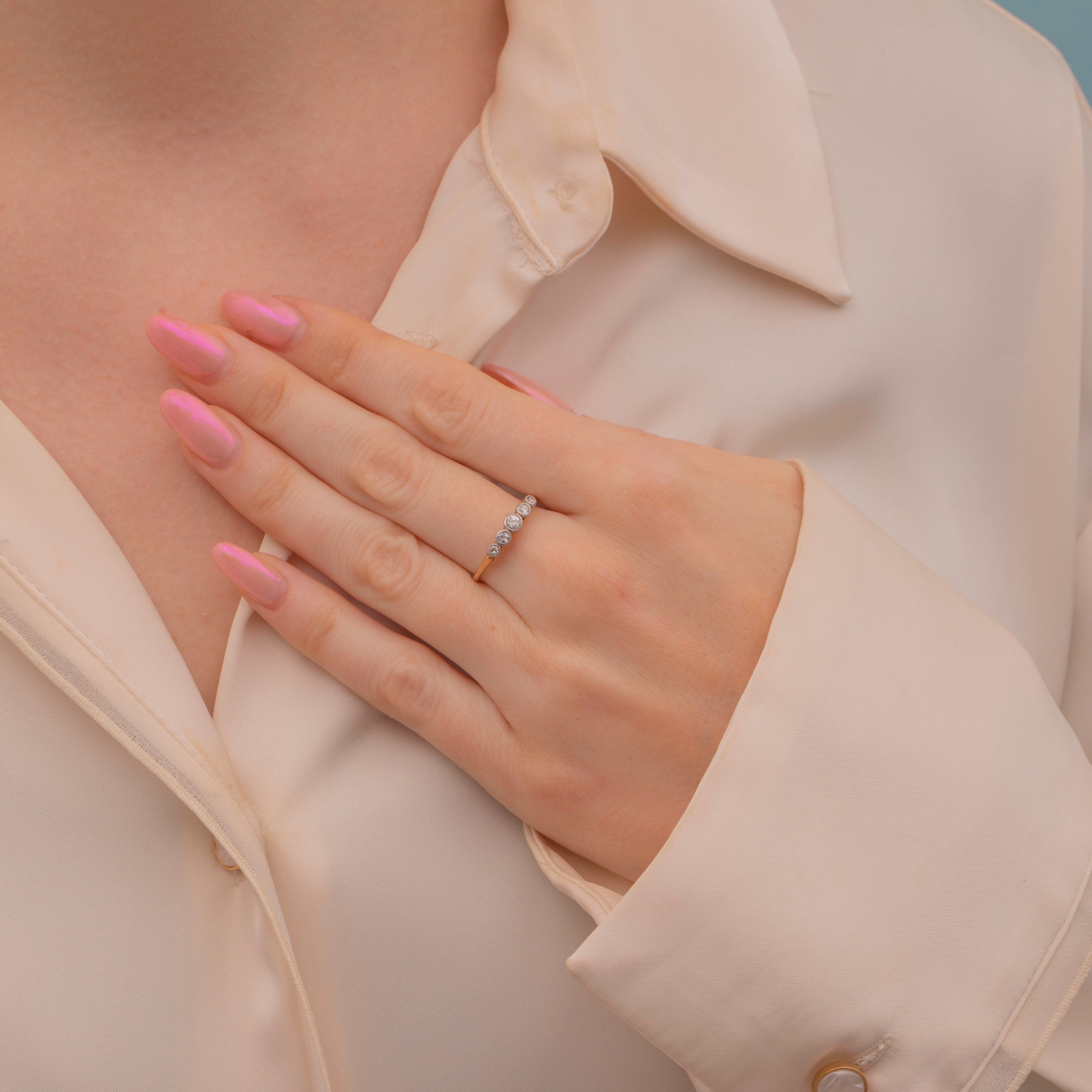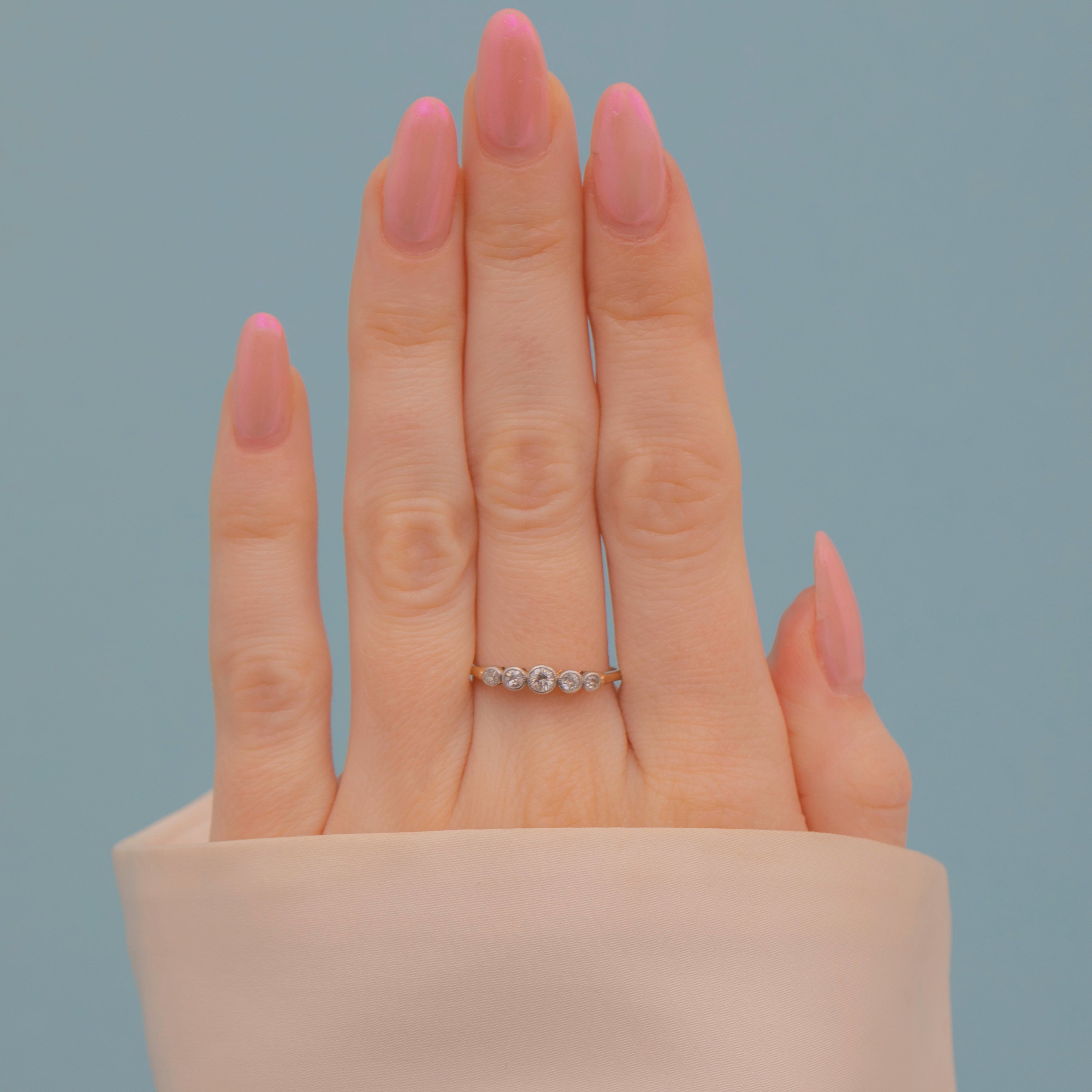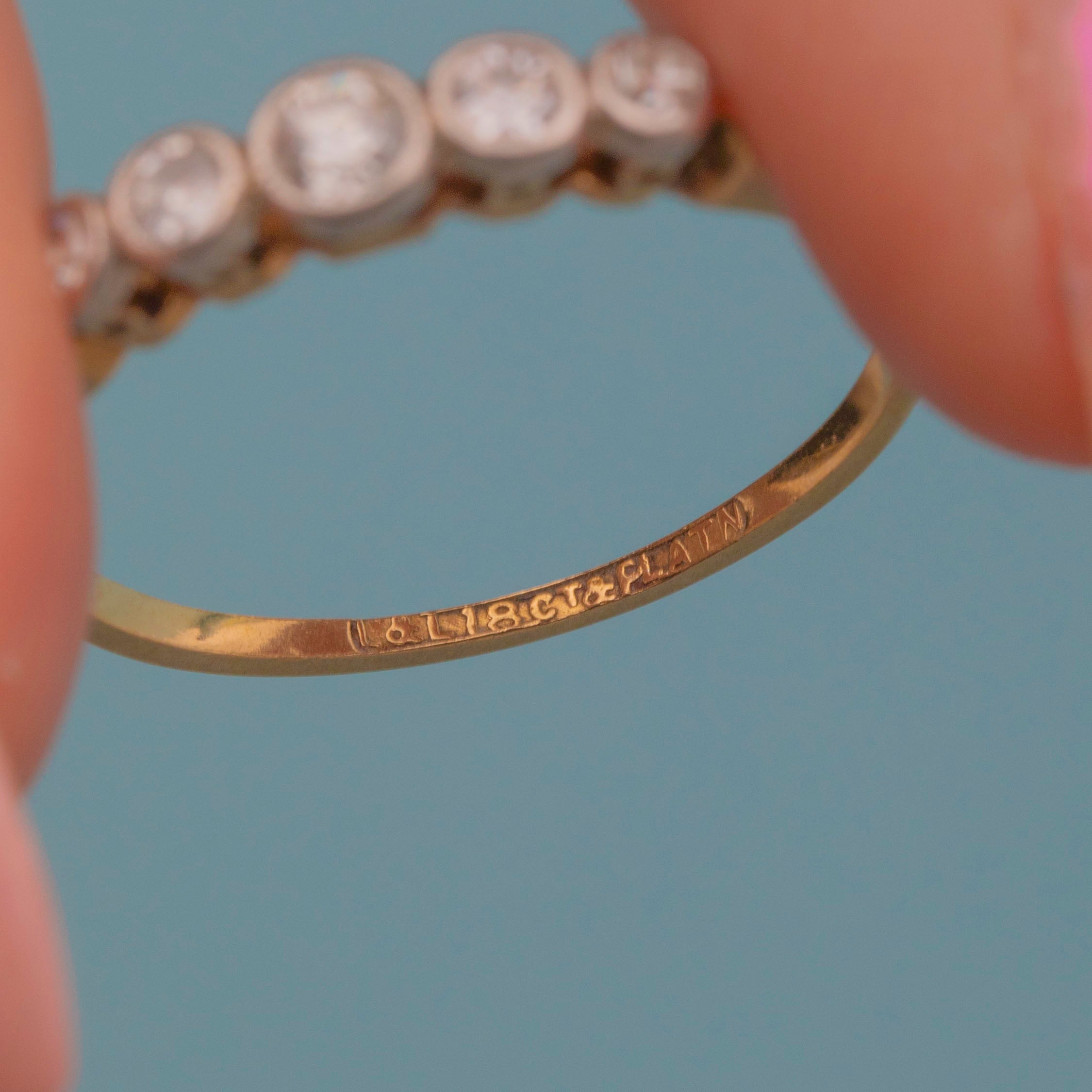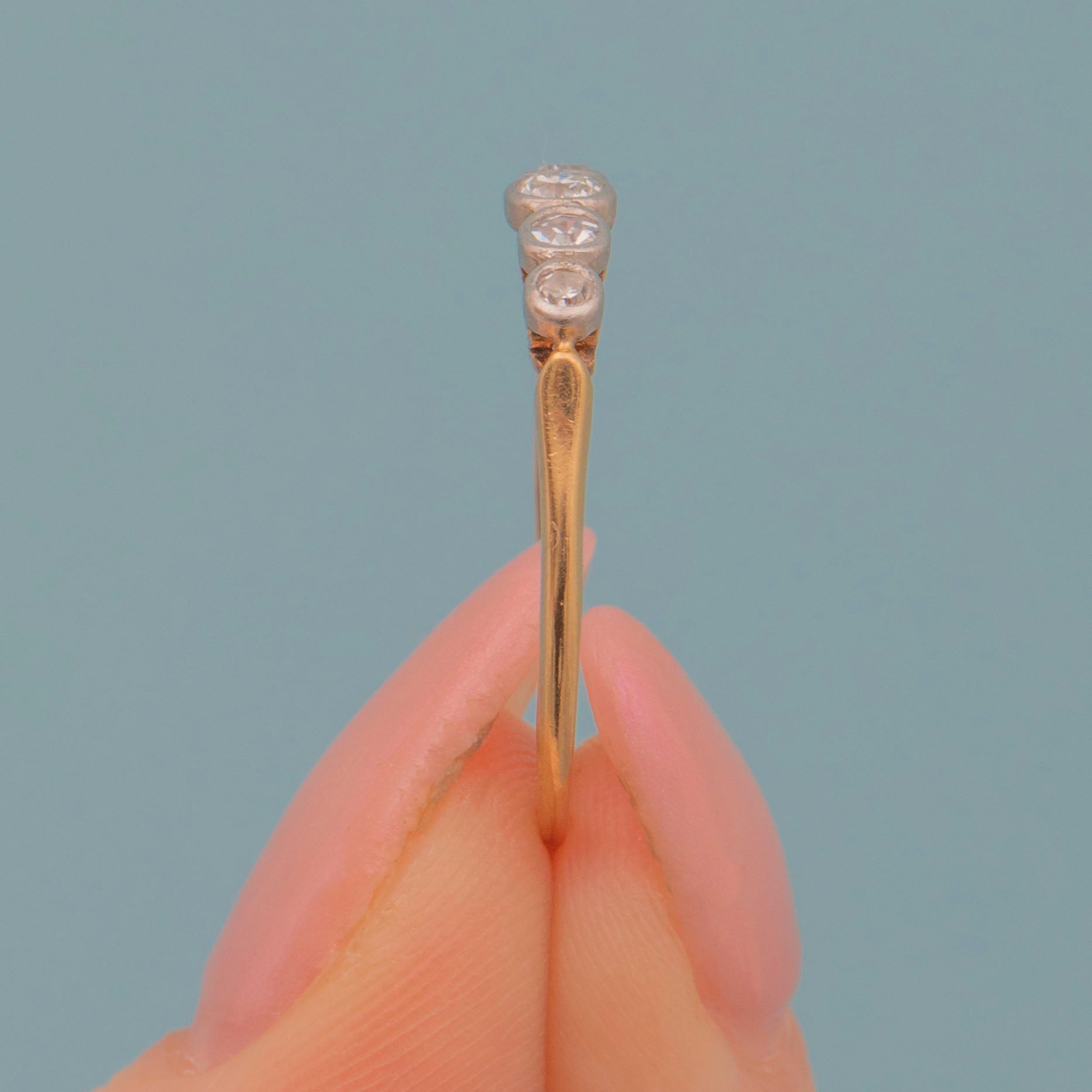 EXCELLENT. This antique 18ct Gold & Platinum Diamond five stone ring in wonderful condition. Her five bezel-set Diamonds are secure, and their facets have no chips or abrasions to note. The settings have some minor wear, however it is evident she has been incredibly well looked after over the past century. She's a dream!