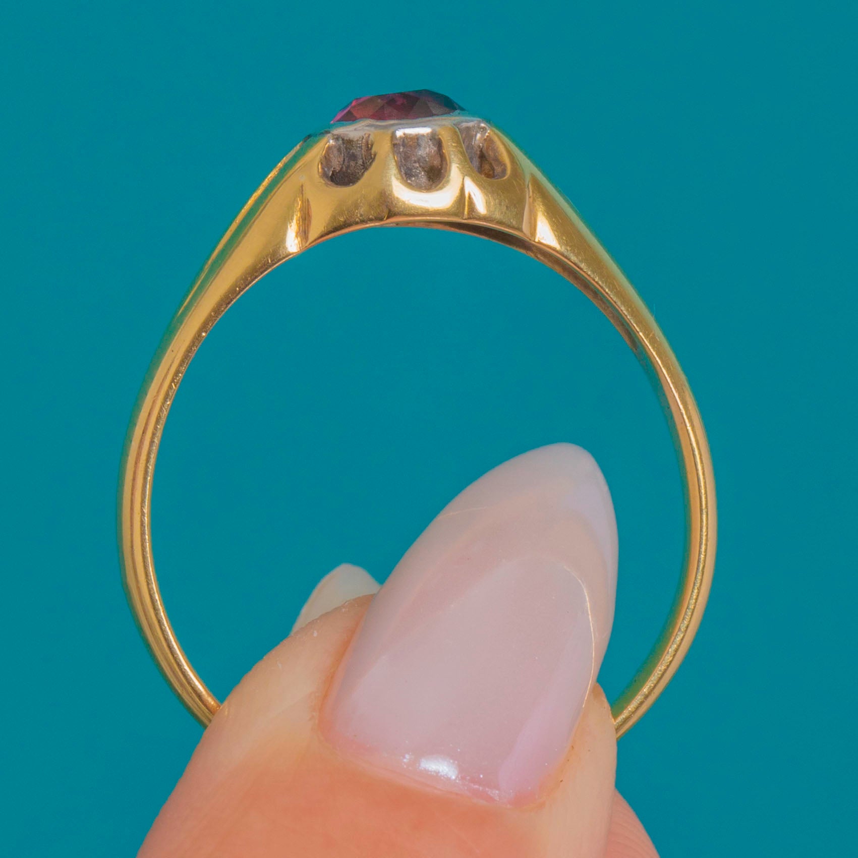 EXCELLENT: The Pink Garnet is bright with no chips, and only light, age‑appropriate facet wear under magnification. The Platinum‑topped bezel and 18ct Gold shank show gentle softening to the high points from wear. The setting is secure with no visible resizing seam or repairs, and the hallmarks remain legible.